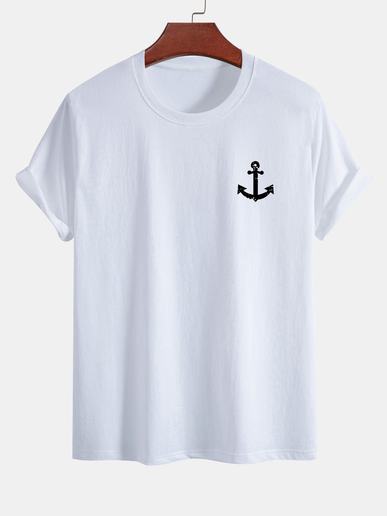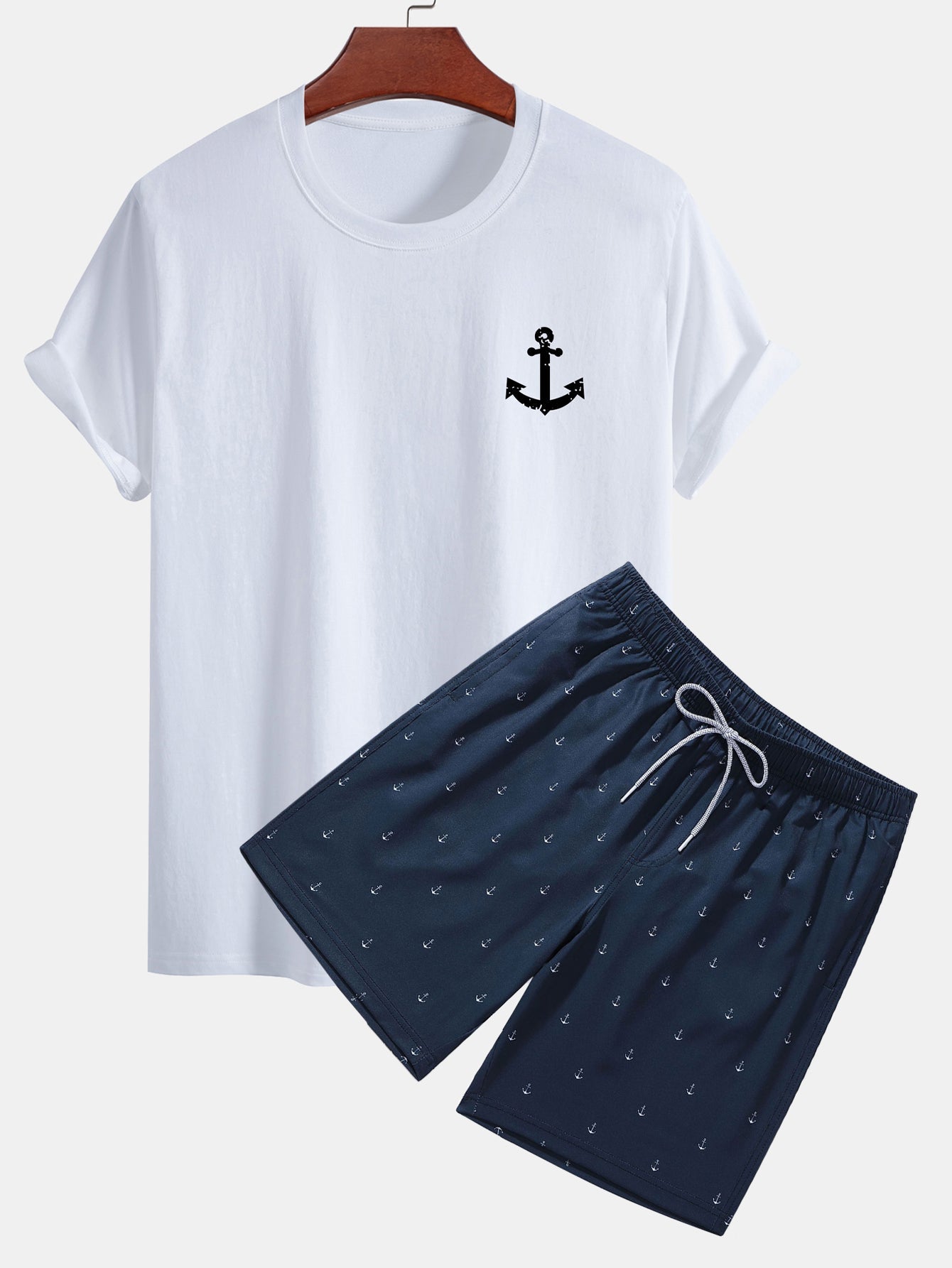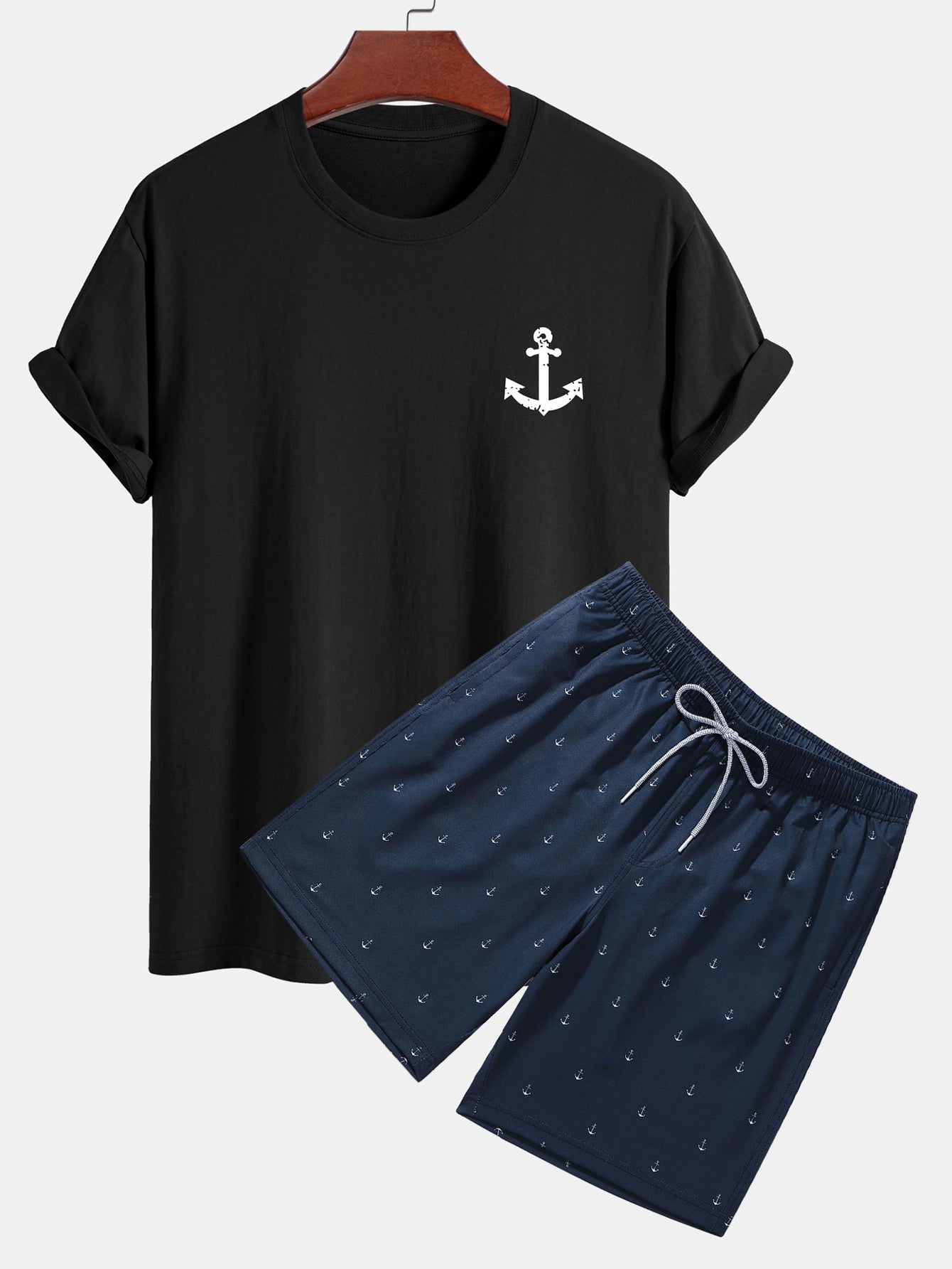 Bring nautical vibes to your summer wardrobe with this laid-back, ocean-inspired set. The regular fit cotton T-shirt features a crisp anchor print, offering breathable comfort and effortless cool. Paired with matching anchor print swim shorts equipped with an adjustable drawstring waist and quick-dry fabric, this duo is perfect for beach days, boat outings, or poolside lounging.