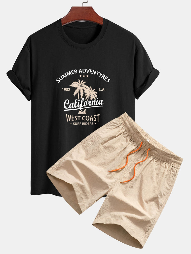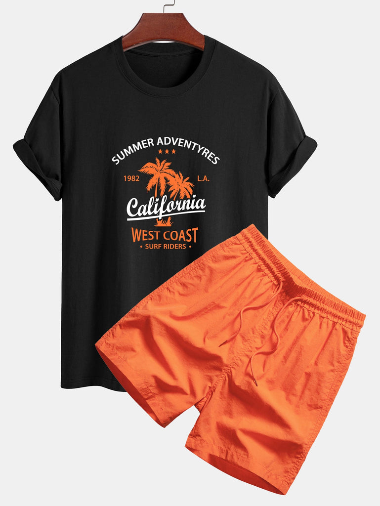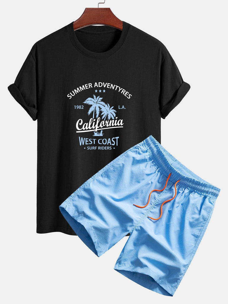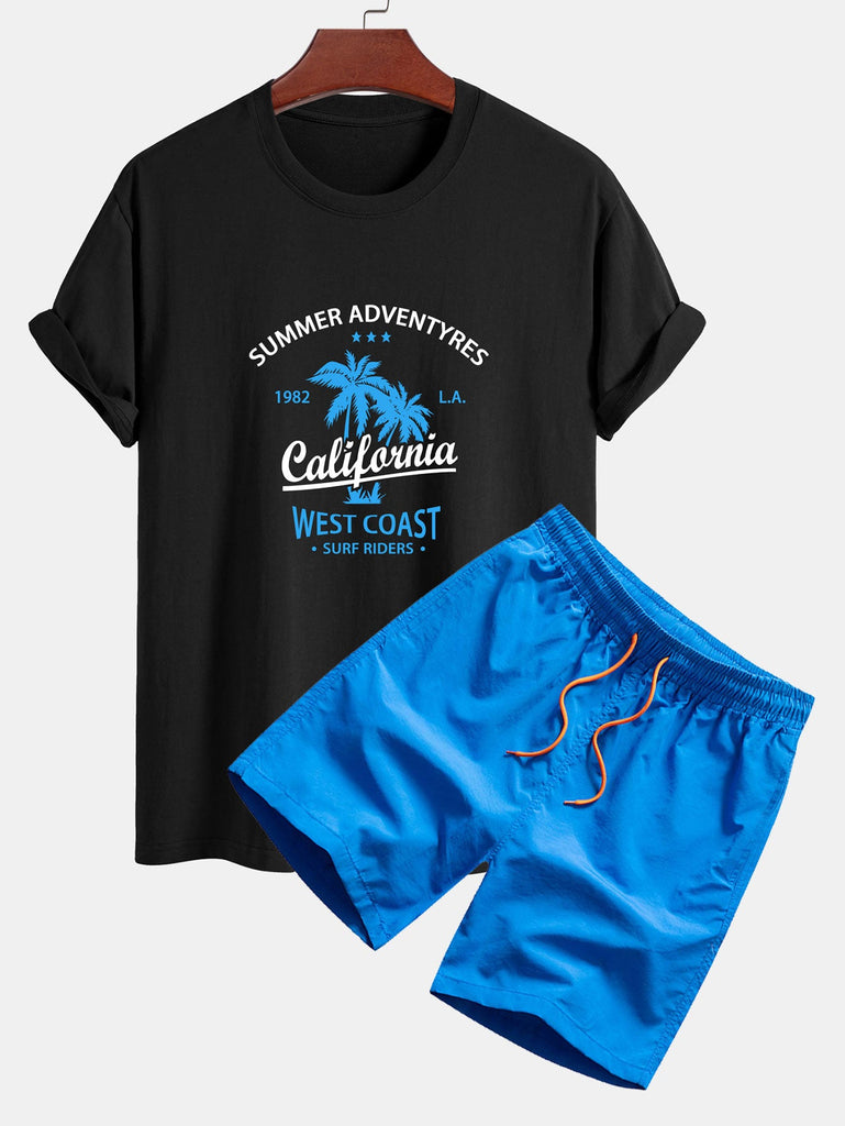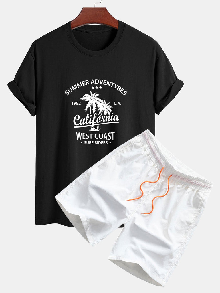 Regular Fit California Palm Tree Print Cotton T-Shirt & Drawstring Swim Shorts