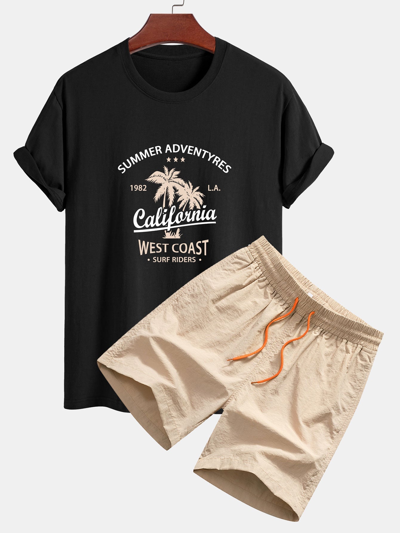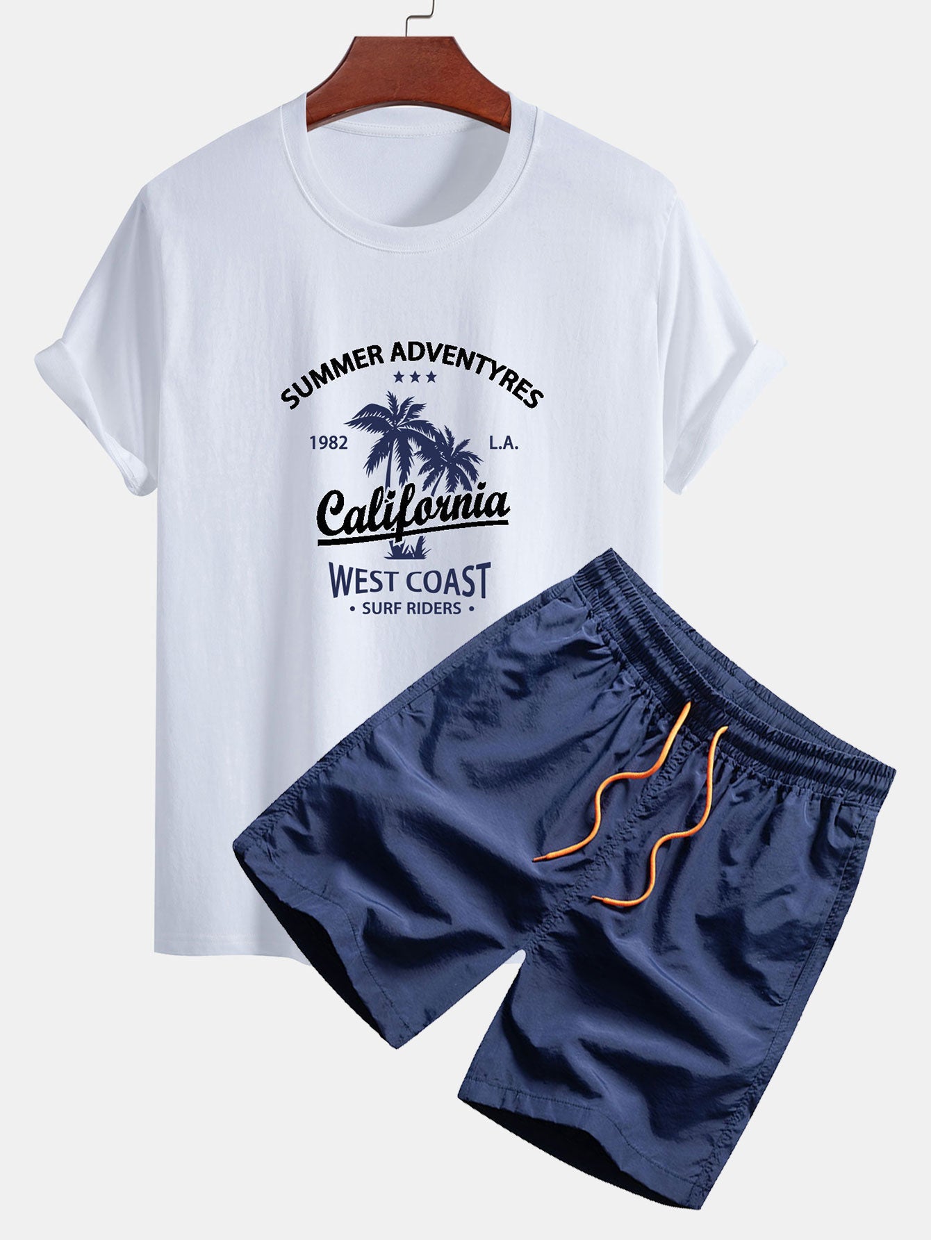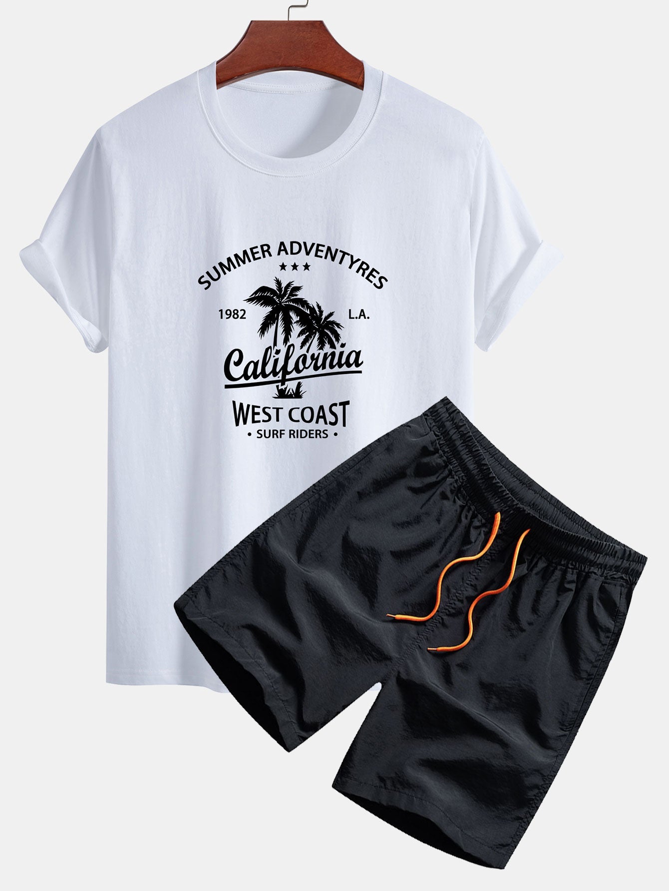 Capture the essence of the West Coast with the regular fit california palm tree print cotton T-shirt & drawstring swim shorts set. This laid-back combo features a soft cotton tee with a bold California and palm tree graphic, paired with easygoing swim shorts perfect for sunny escapes and poolside chillouts.