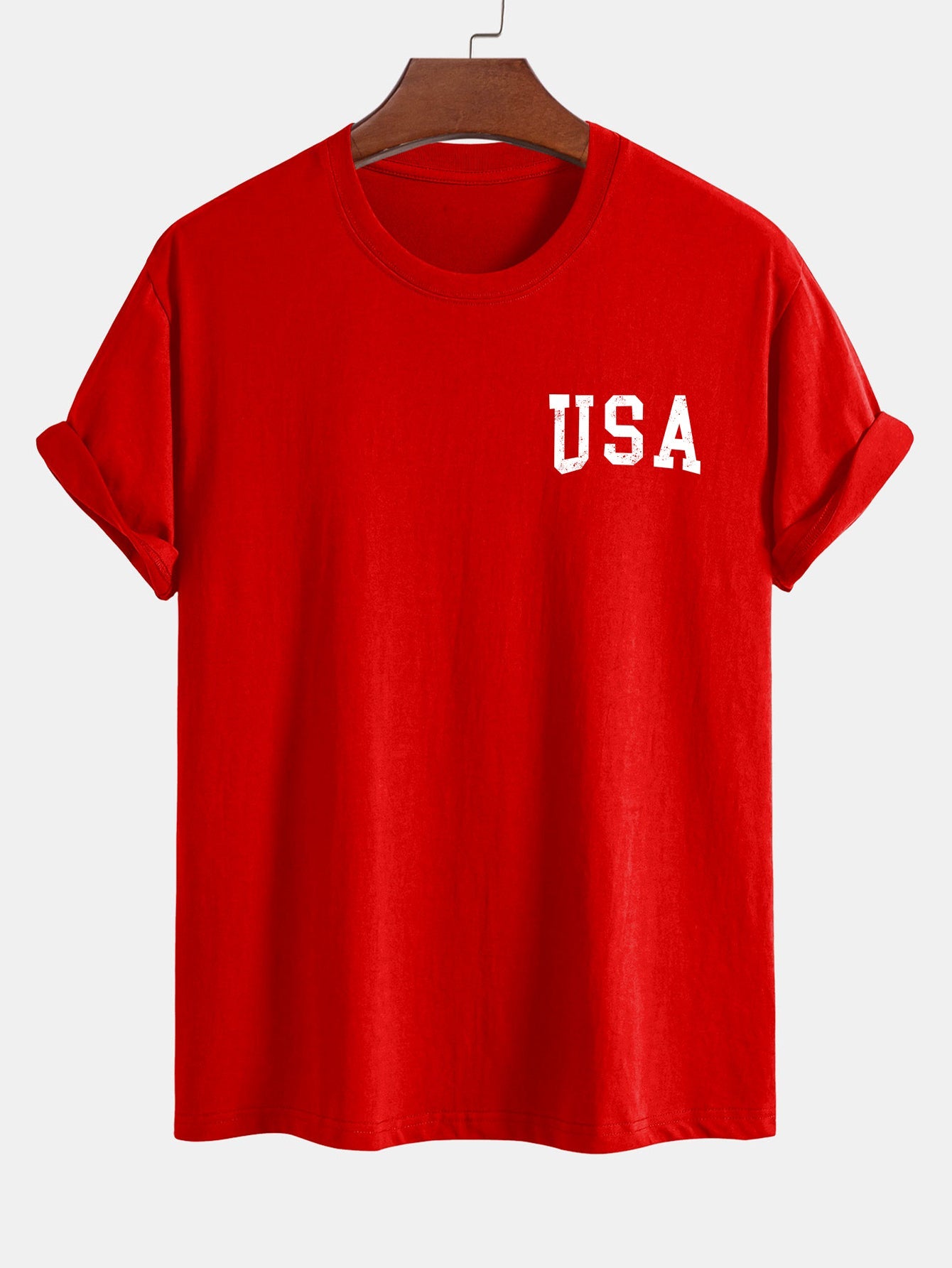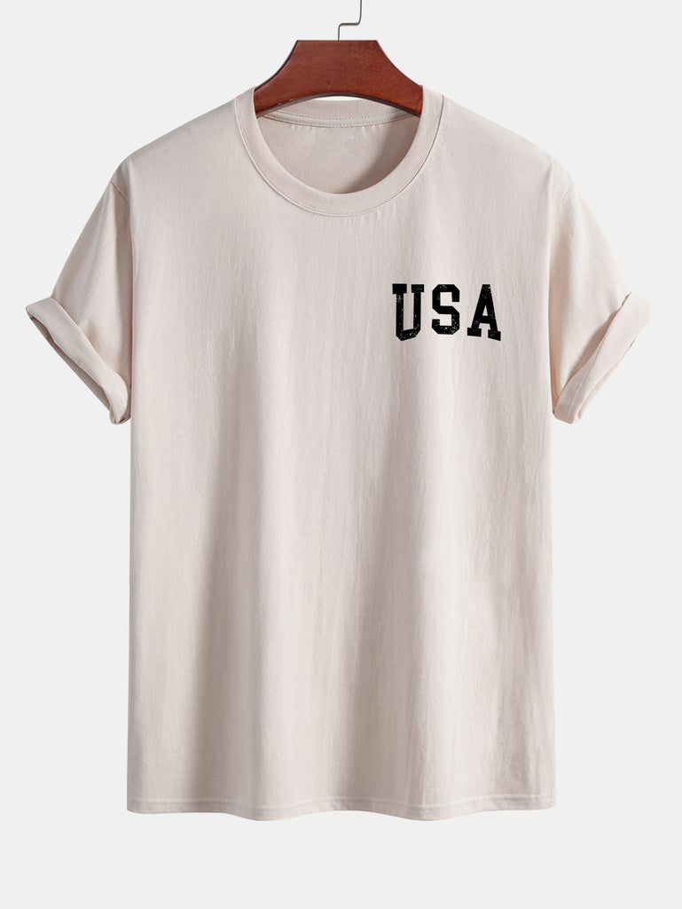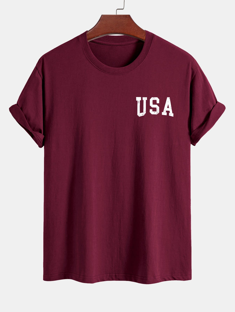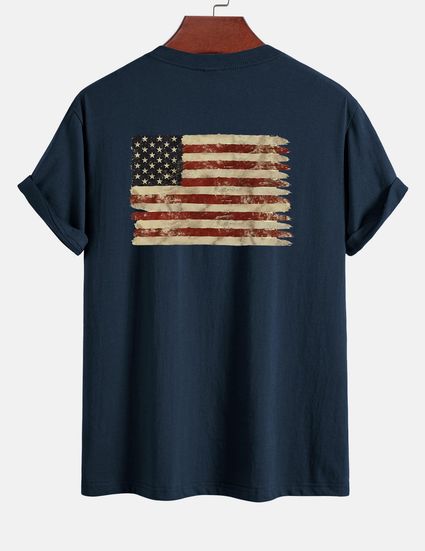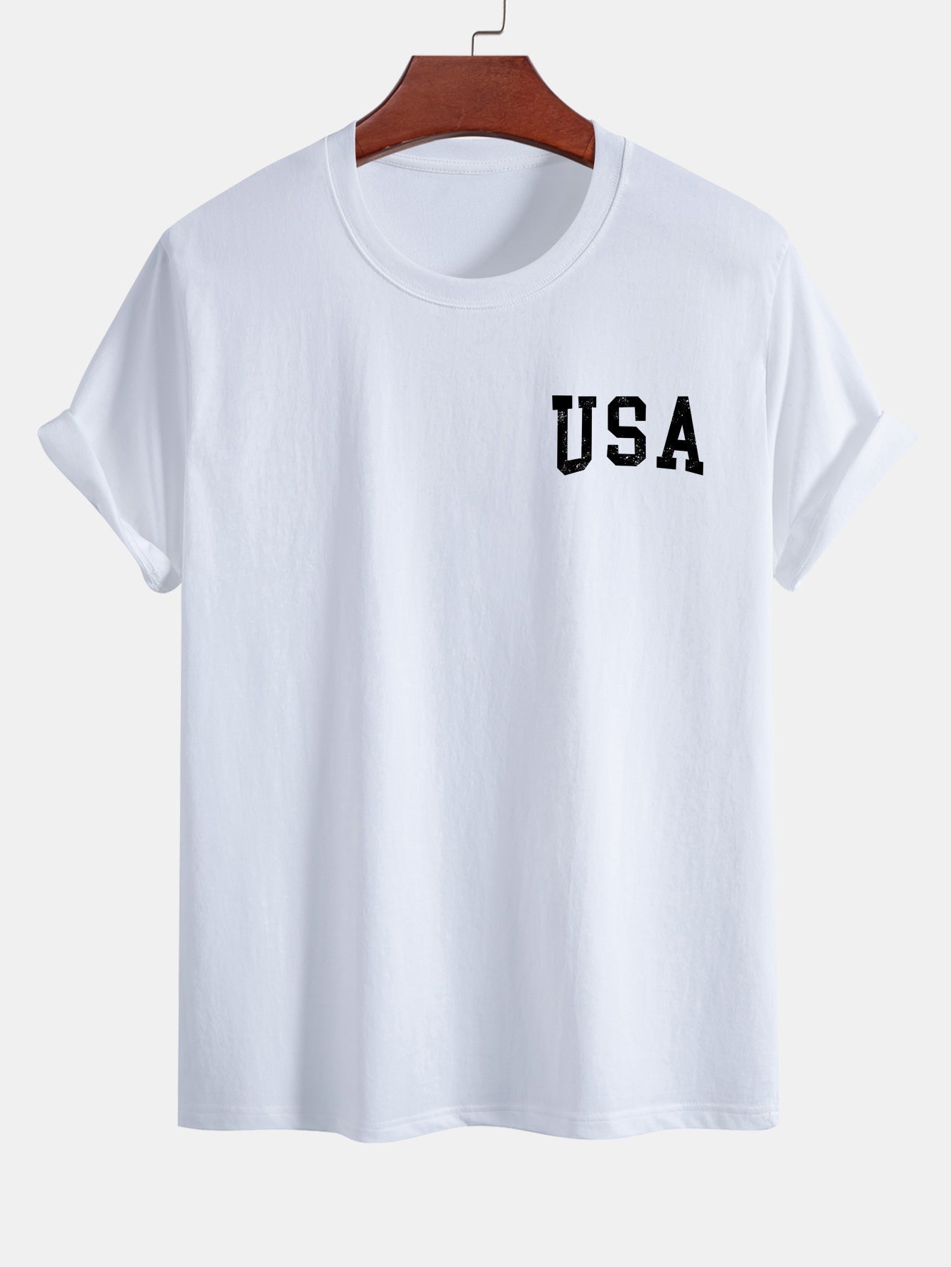 Show your pride in timeless style with this Regular Fit USA flag print cotton T-shirt. Featuring a bold American flag graphic and a comfortable everyday fit, this tee is perfect for holidays, casual outings, or just repping the red, white, and blue year-round.