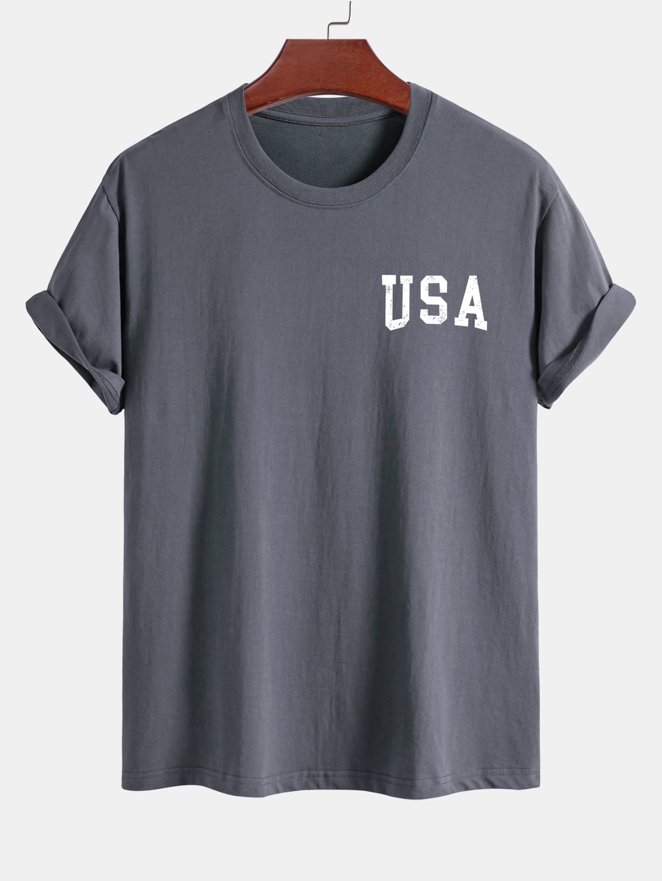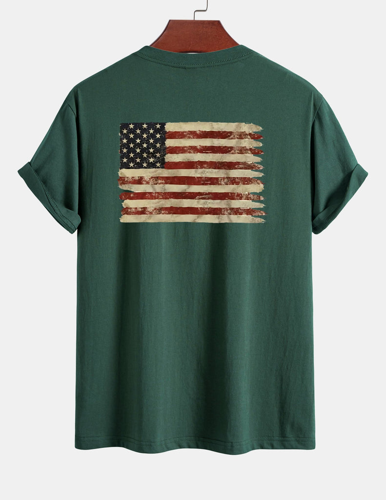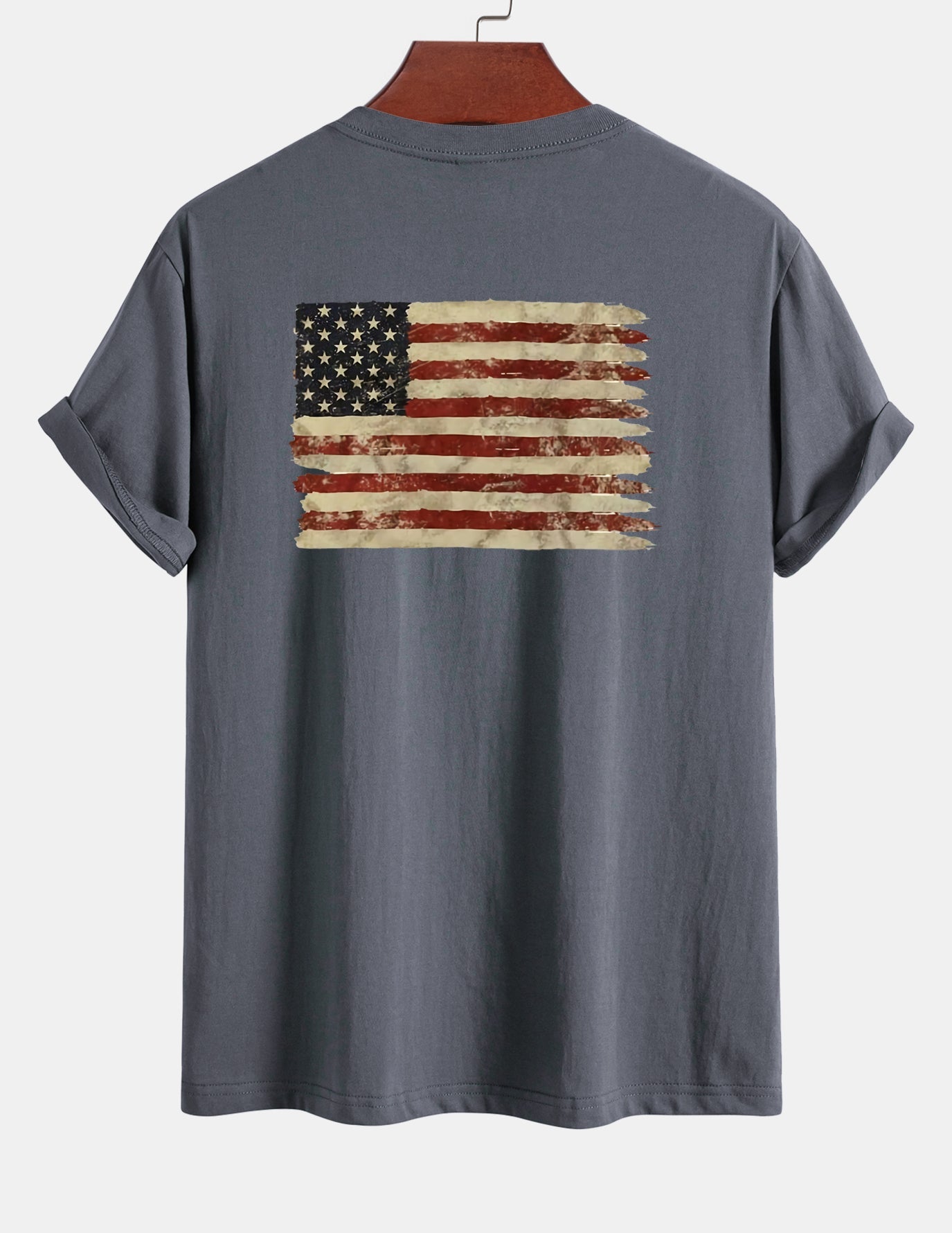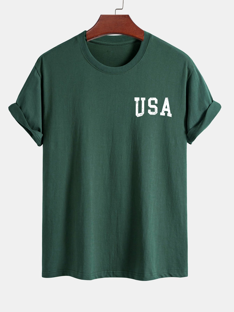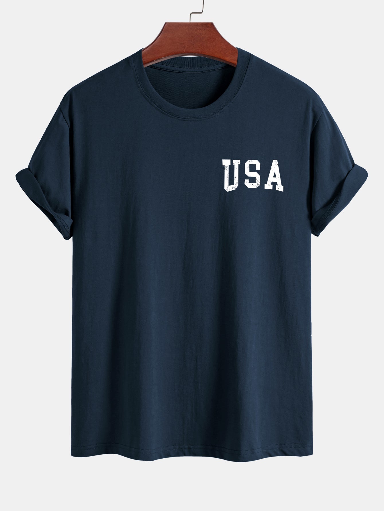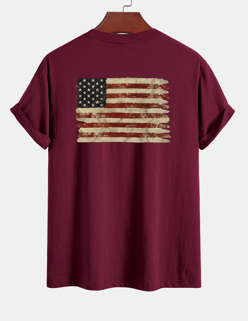 Show your pride in timeless style with this Regular Fit USA flag print cotton T-shirt. Featuring a bold American flag graphic and a comfortable everyday fit, this tee is perfect for holidays, casual outings, or just repping the red, white, and blue year-round.