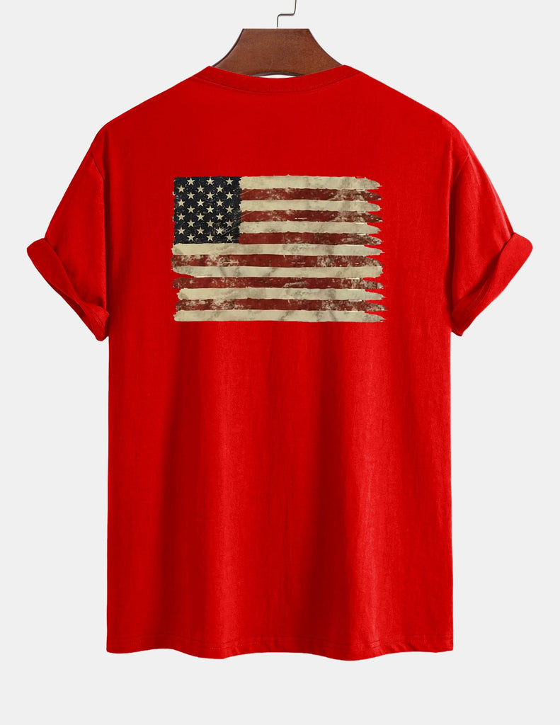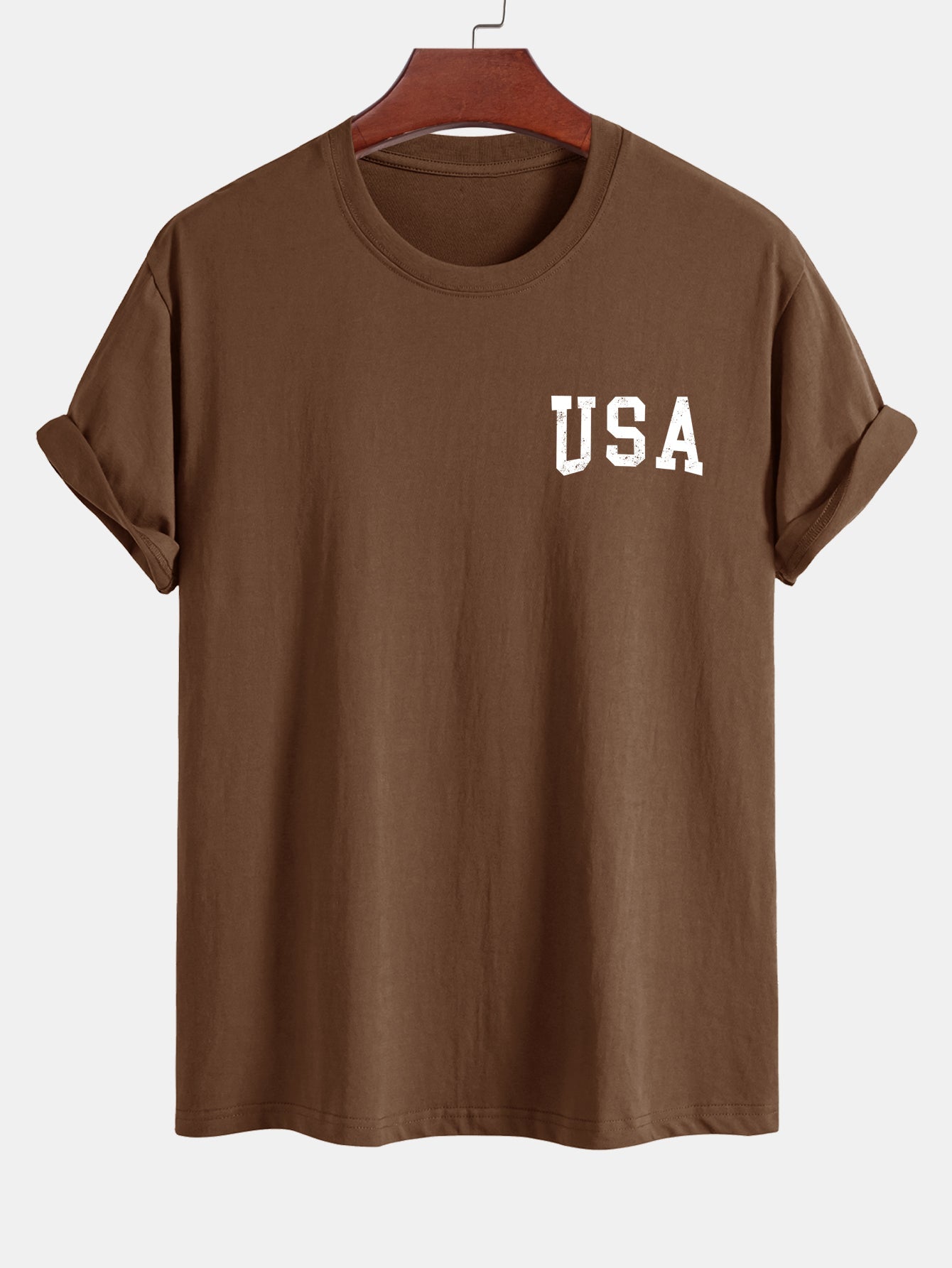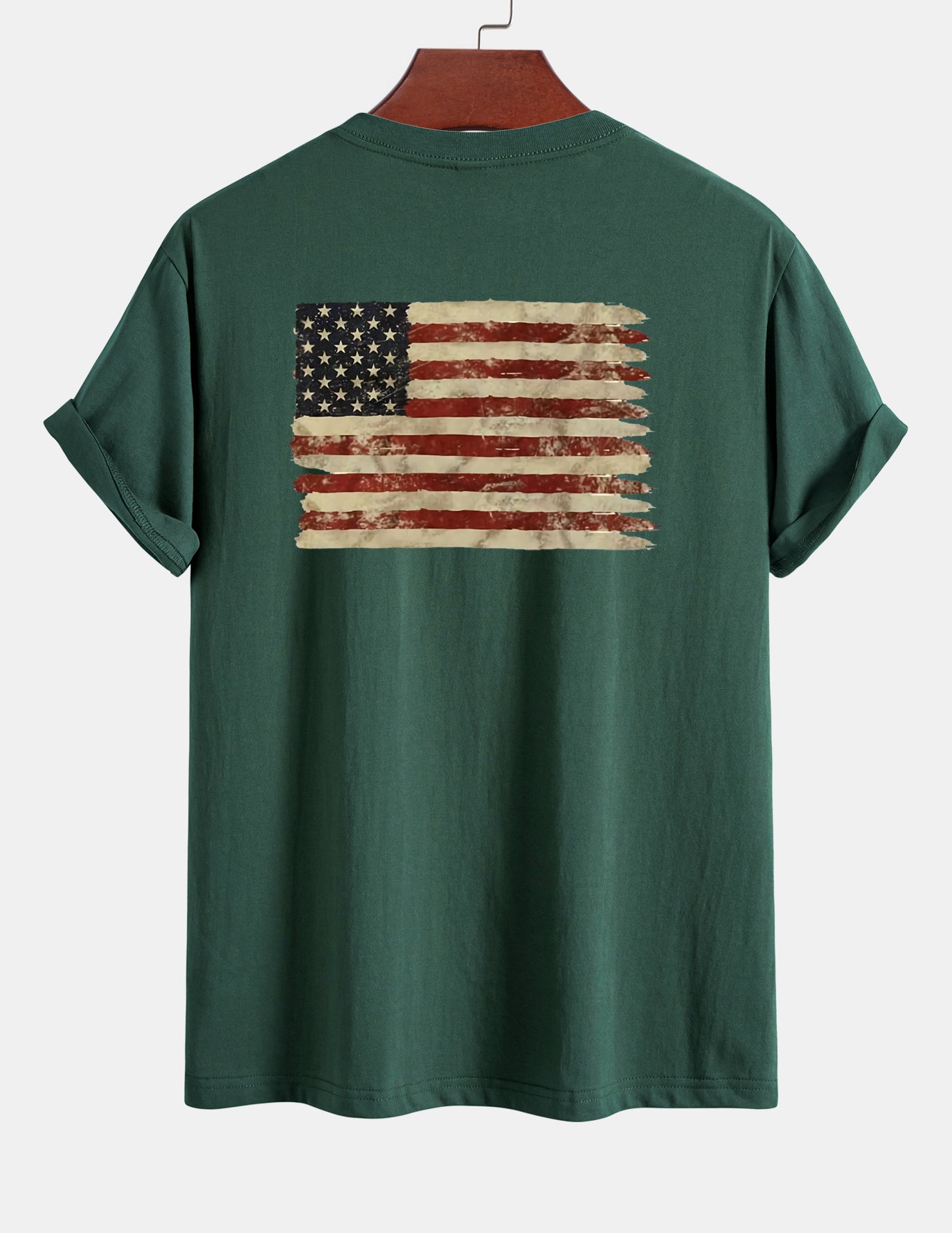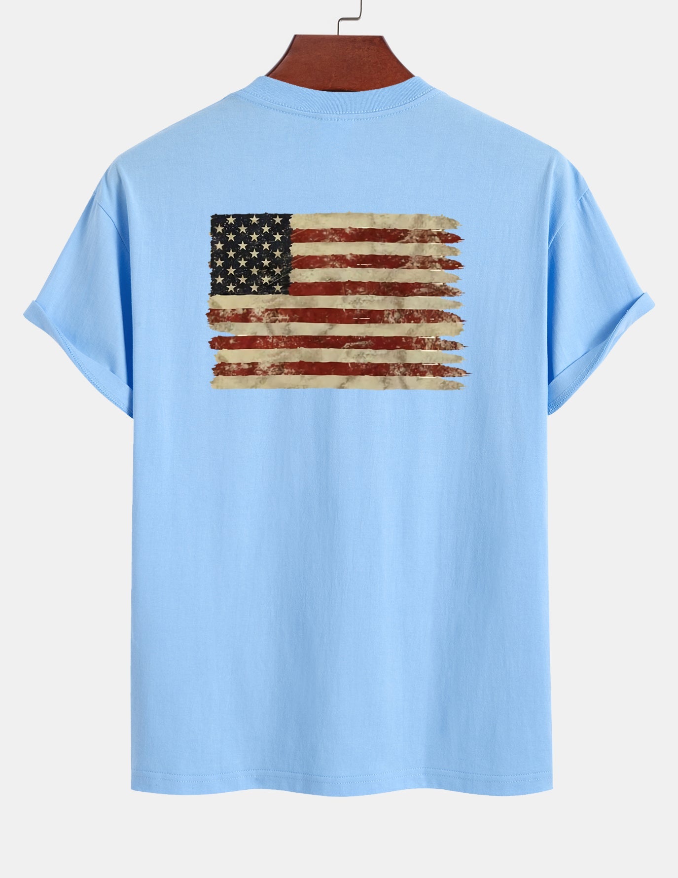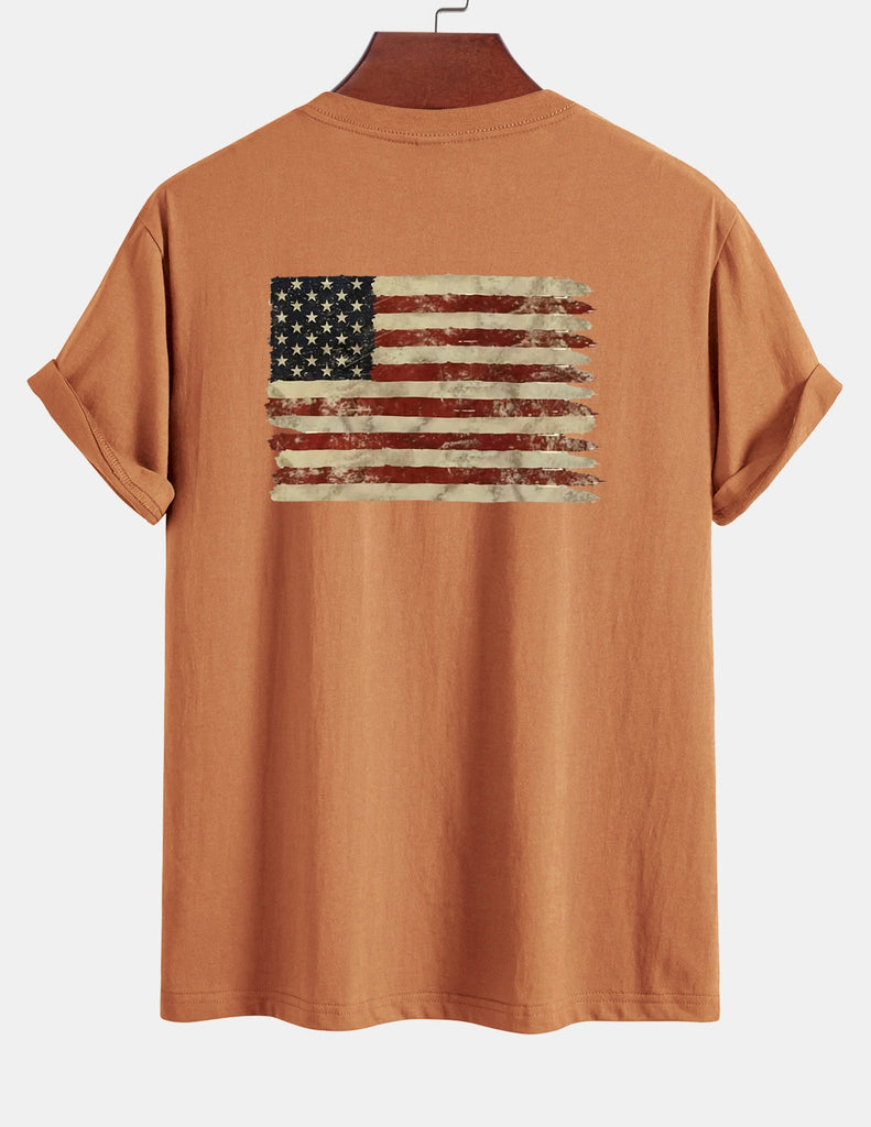 Show your pride in timeless style with this Regular Fit USA flag print cotton T-shirt. Featuring a bold American flag graphic and a comfortable everyday fit, this tee is perfect for holidays, casual outings, or just repping the red, white, and blue year-round.