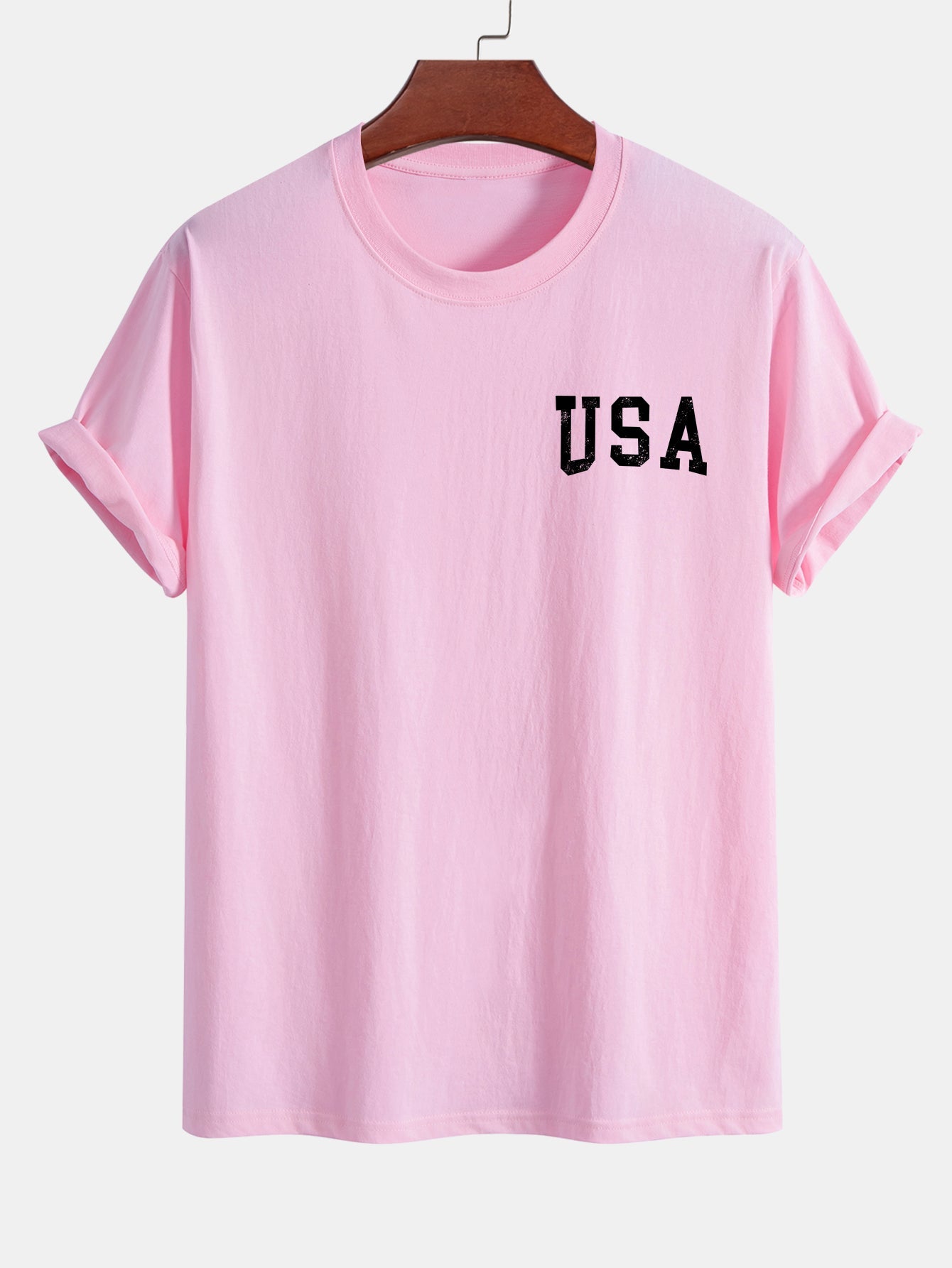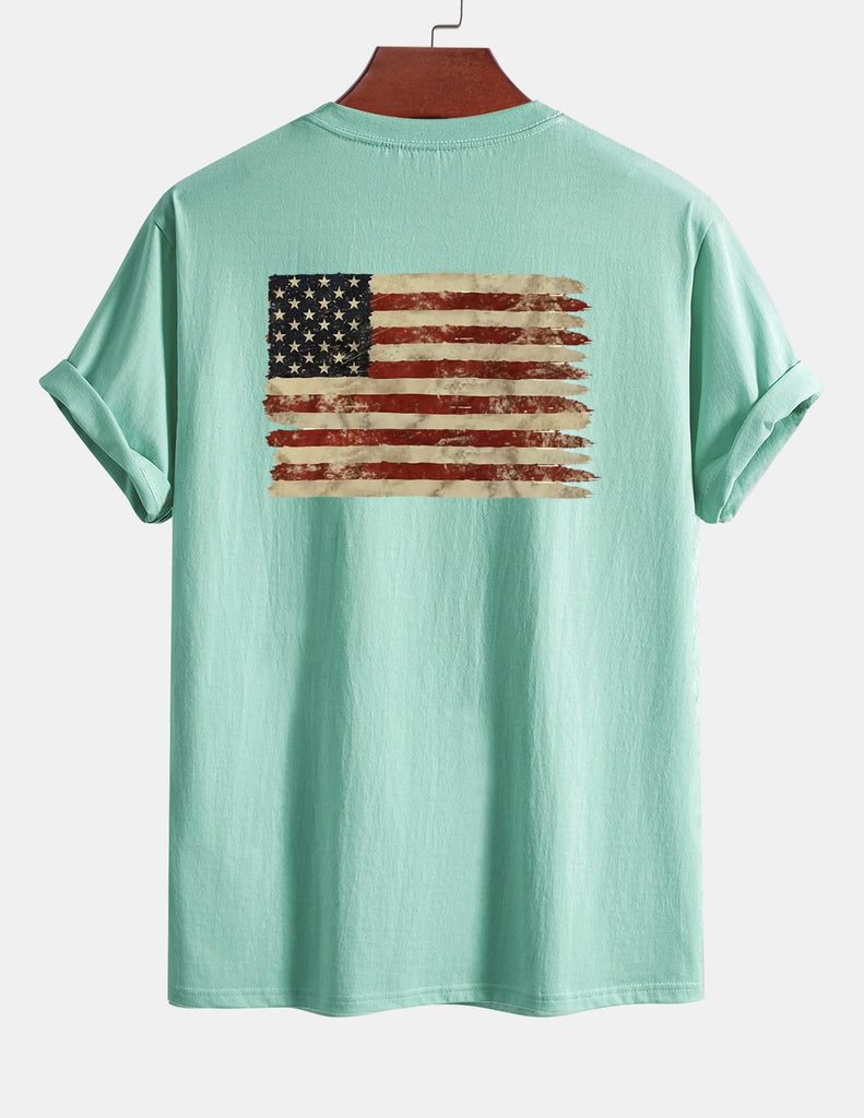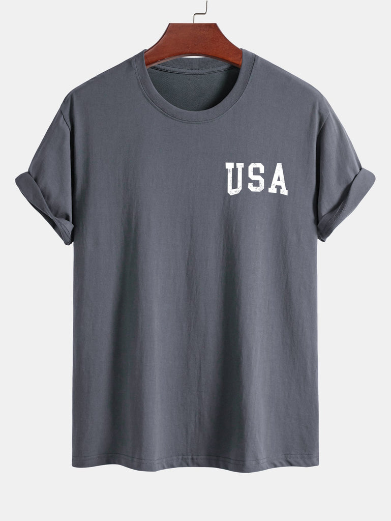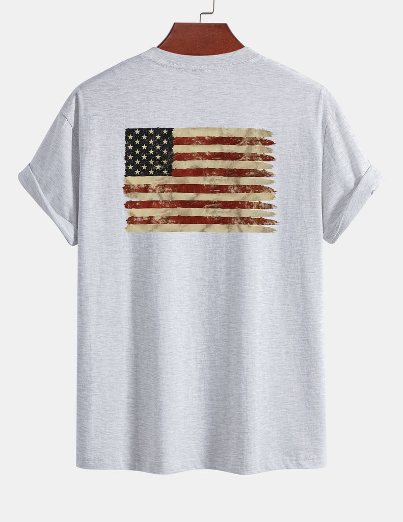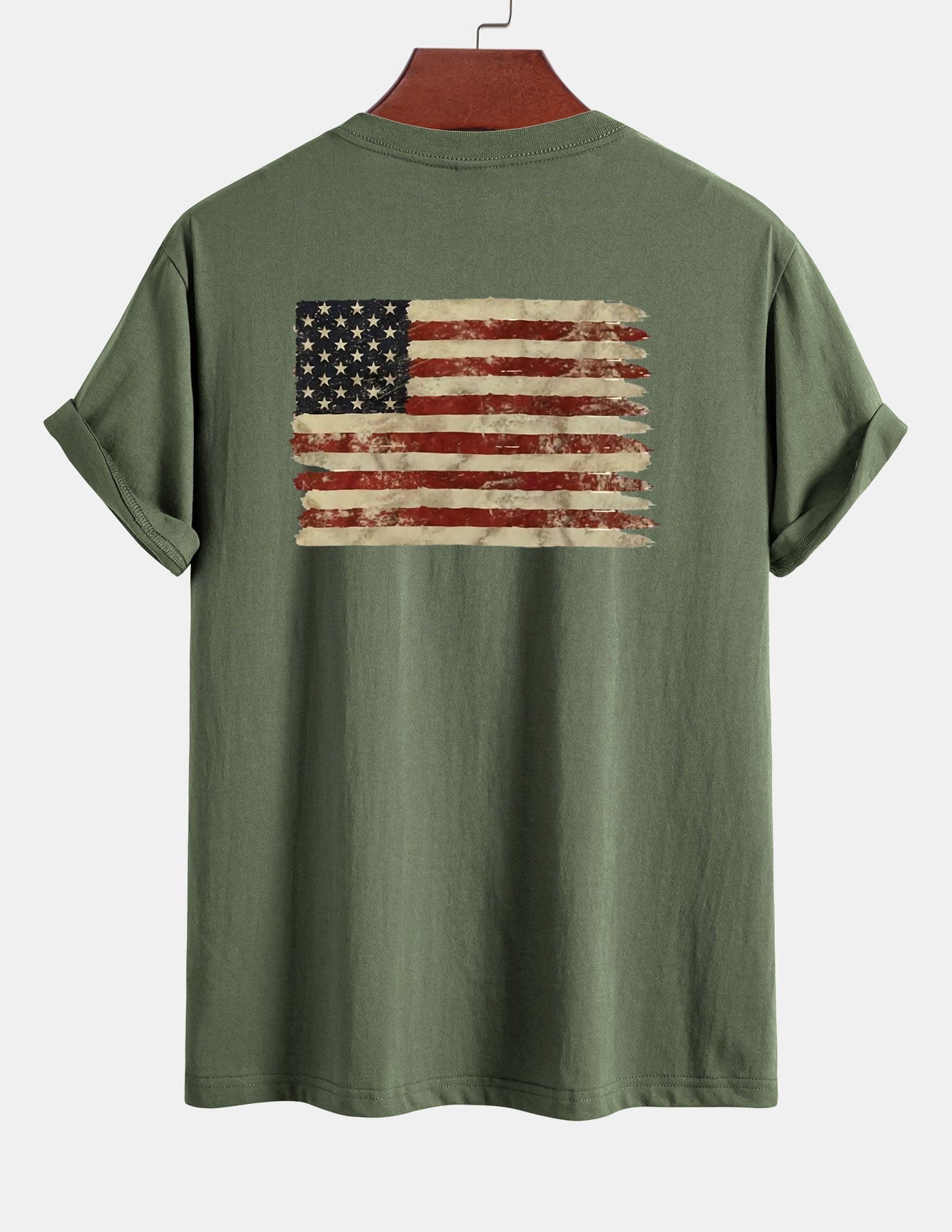 Show your pride in timeless style with this Regular Fit USA flag print cotton T-shirt. Featuring a bold American flag graphic and a comfortable everyday fit, this tee is perfect for holidays, casual outings, or just repping the red, white, and blue year-round.