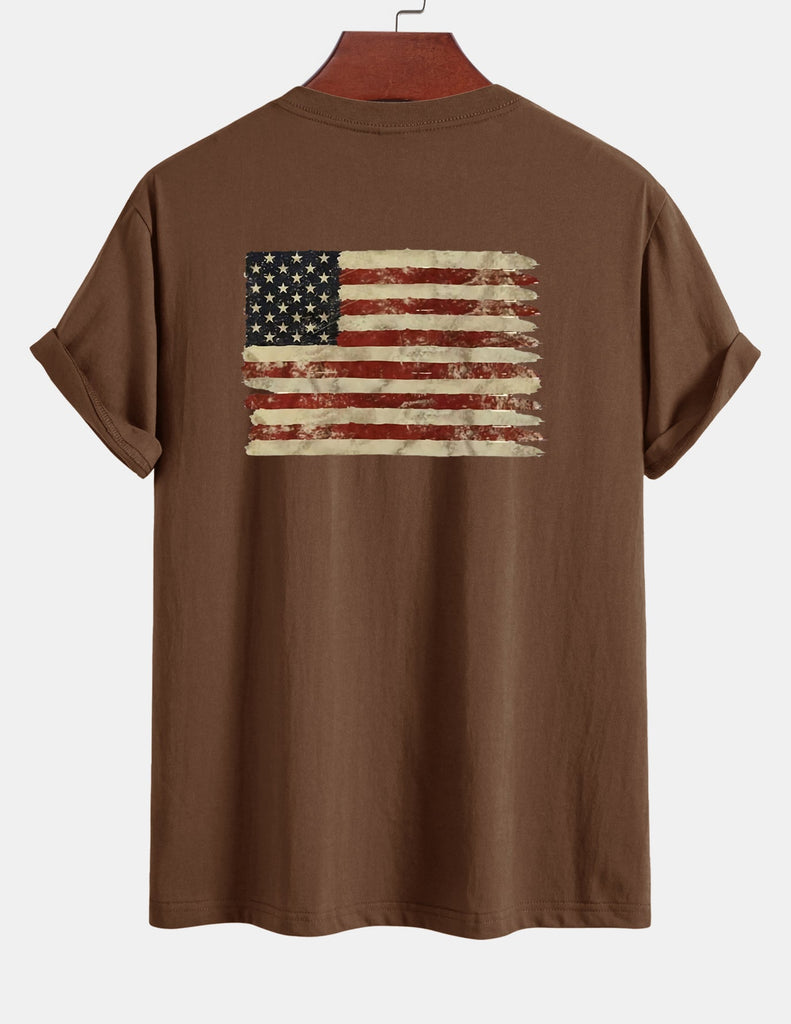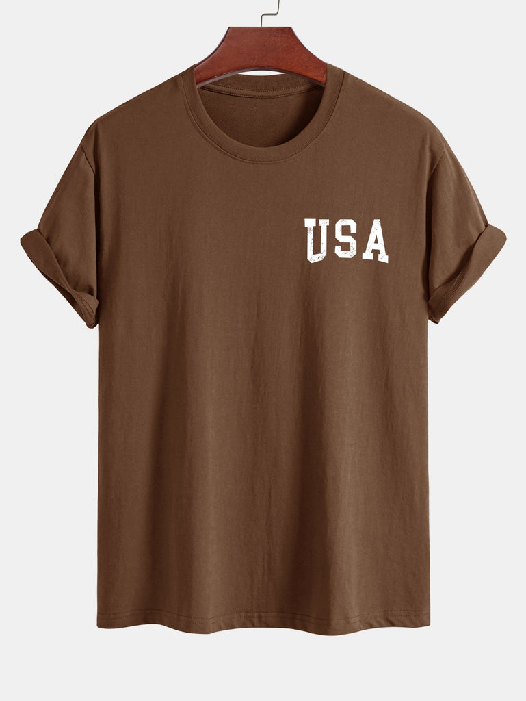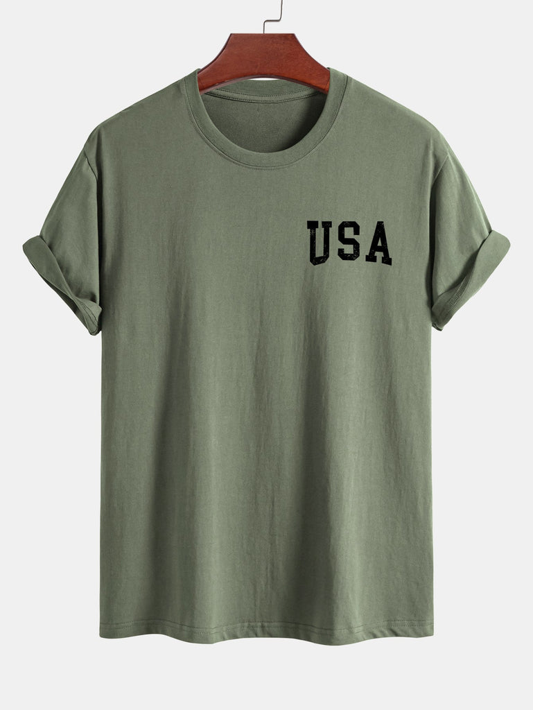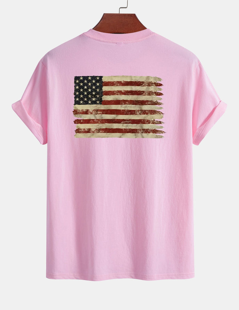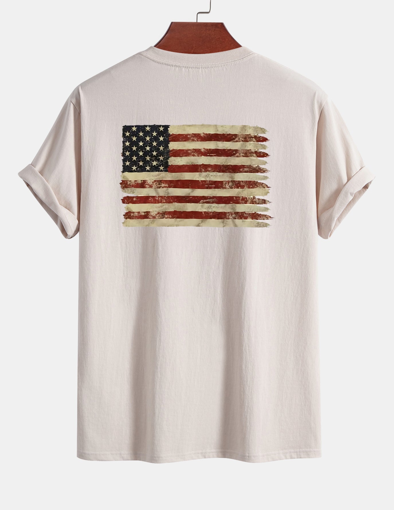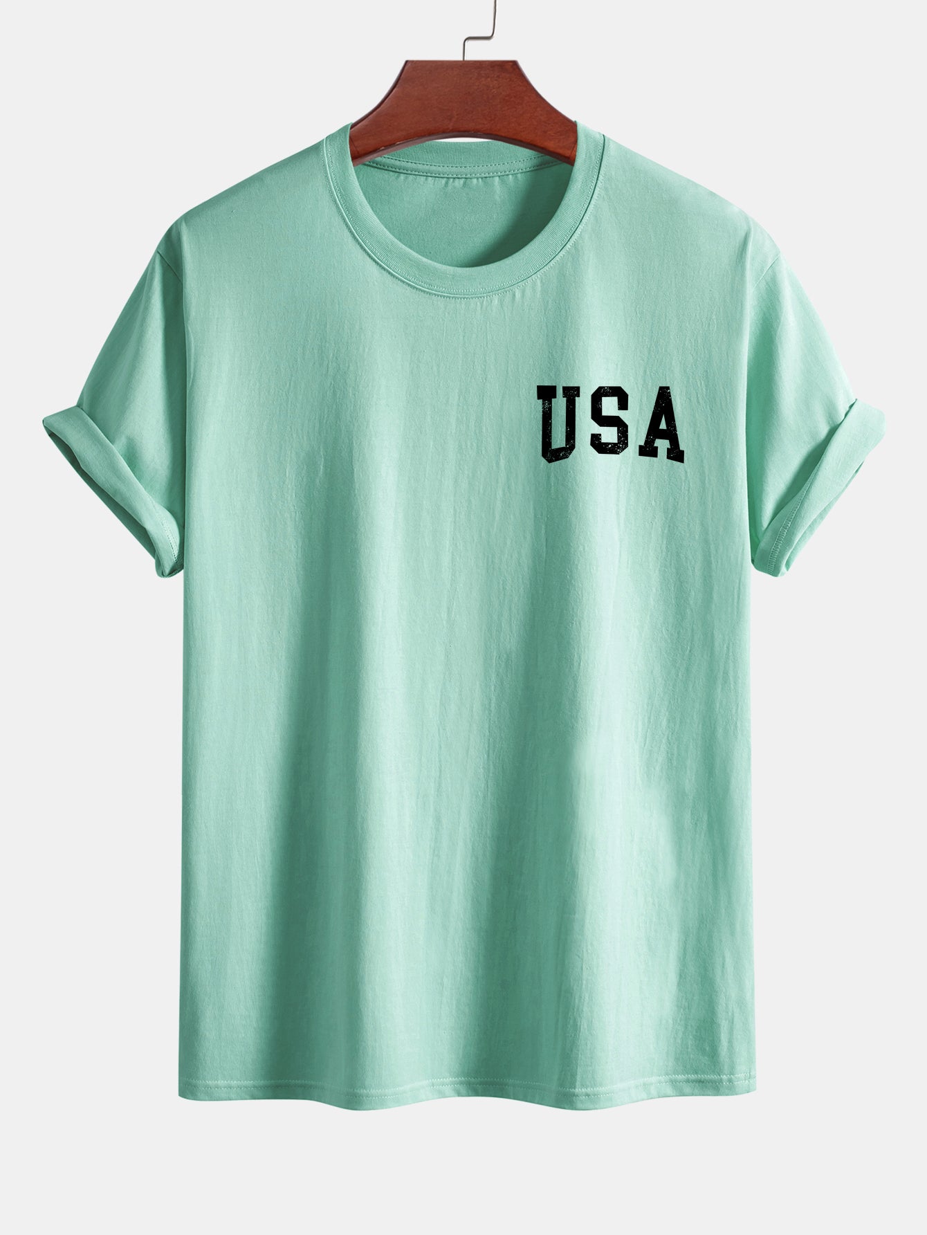 Show your pride in timeless style with this Regular Fit USA flag print cotton T-shirt. Featuring a bold American flag graphic and a comfortable everyday fit, this tee is perfect for holidays, casual outings, or just repping the red, white, and blue year-round.