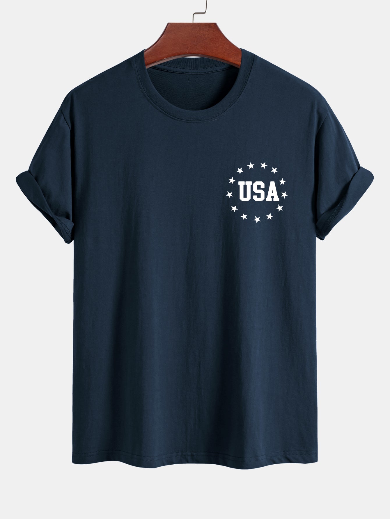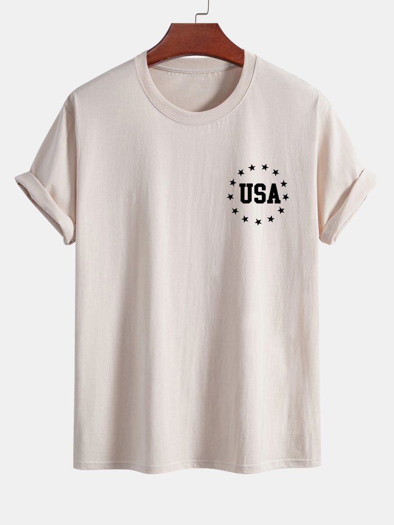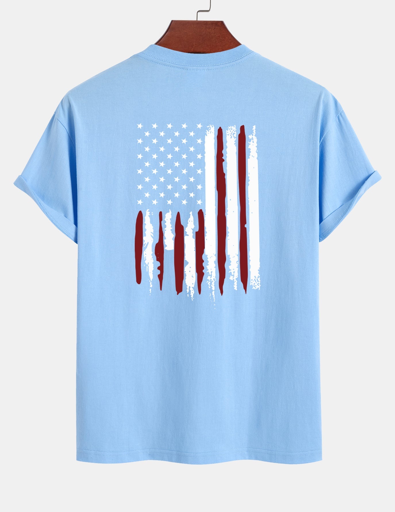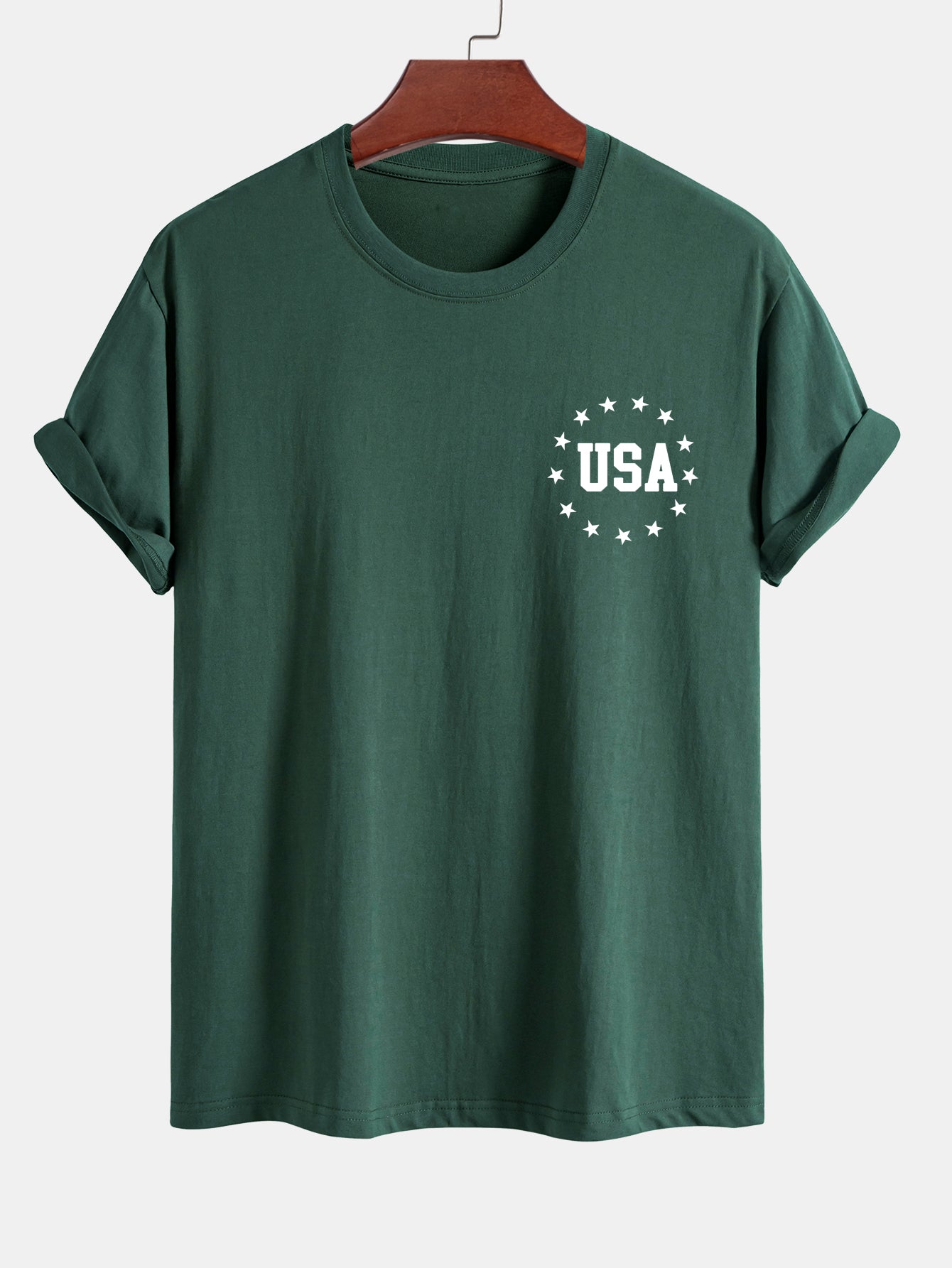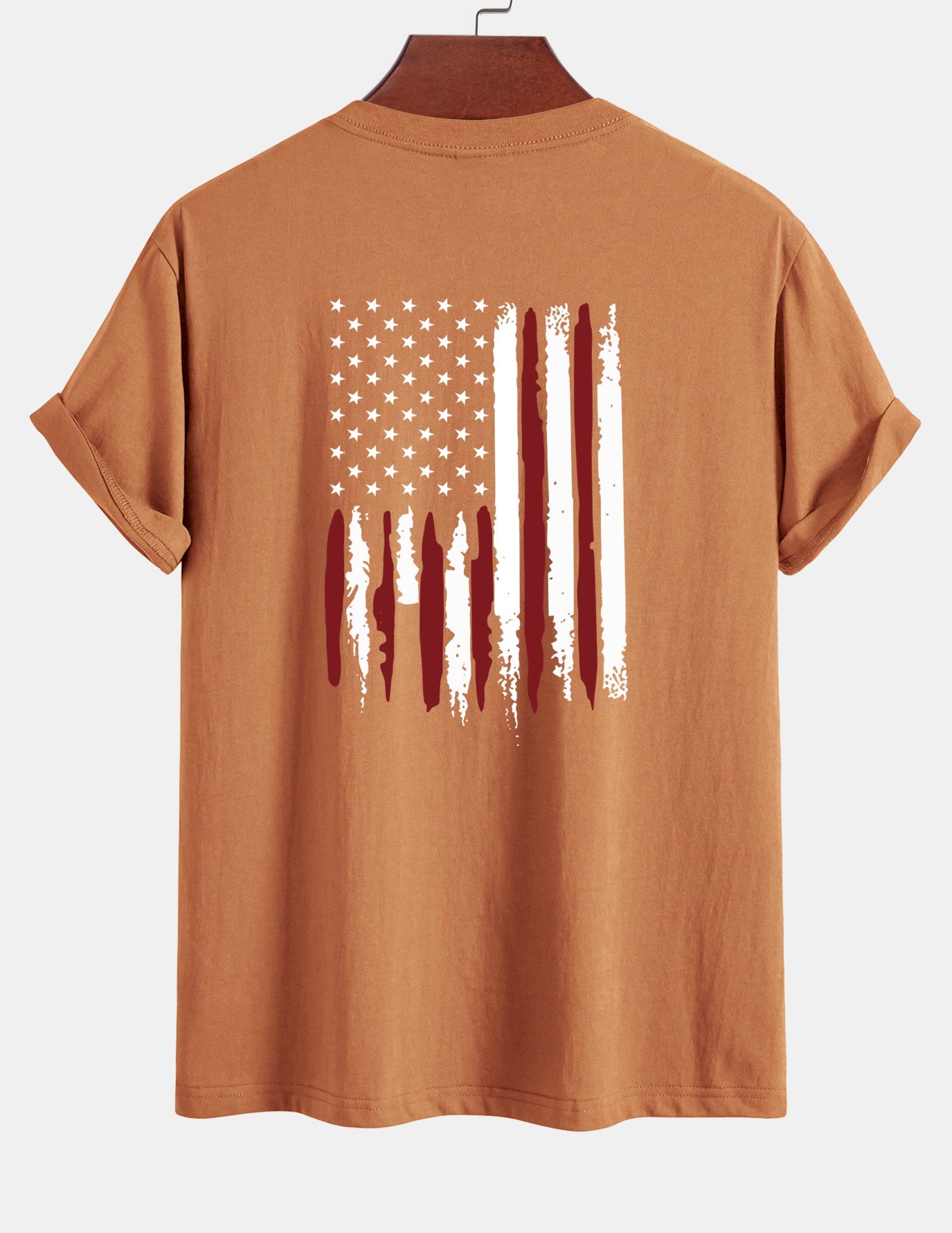 Show your pride in timeless style with this Regular Fit USA flag print cotton T-shirt. Featuring a bold American flag graphic and a comfortable everyday fit, this tee is perfect for holidays, casual outings, or just repping the red, white, and blue year-round.