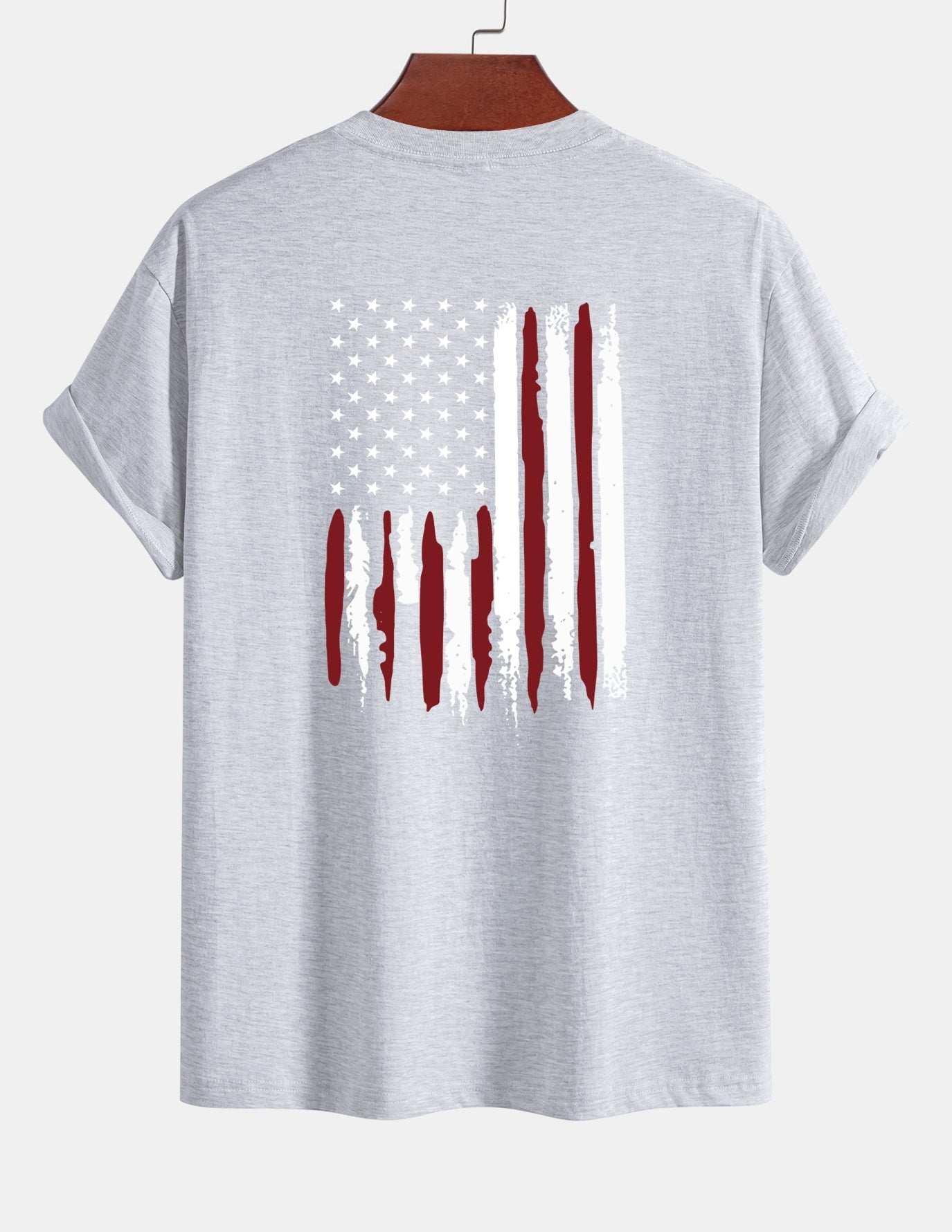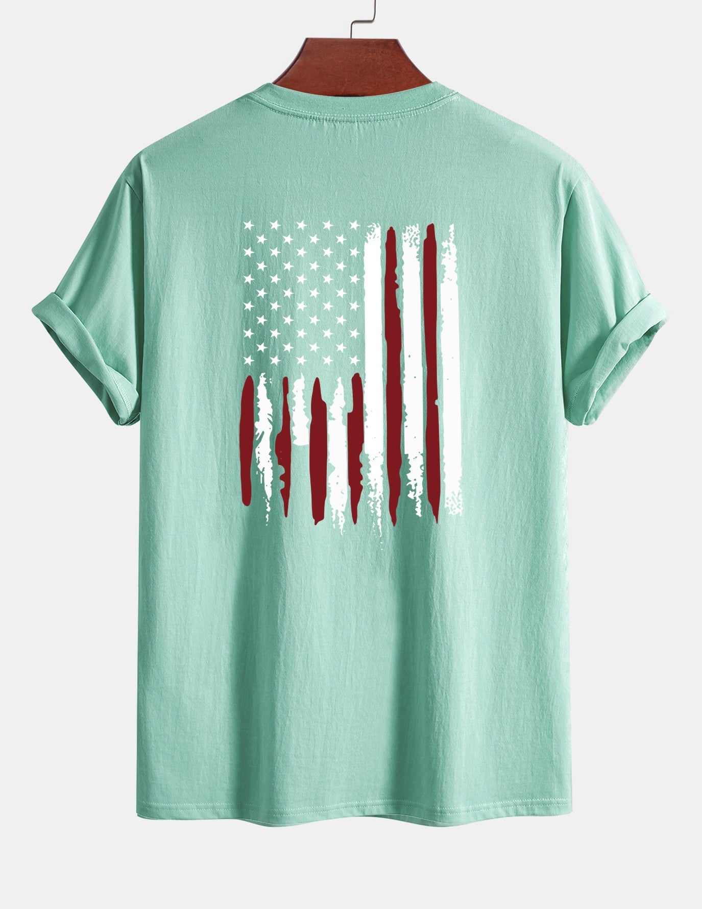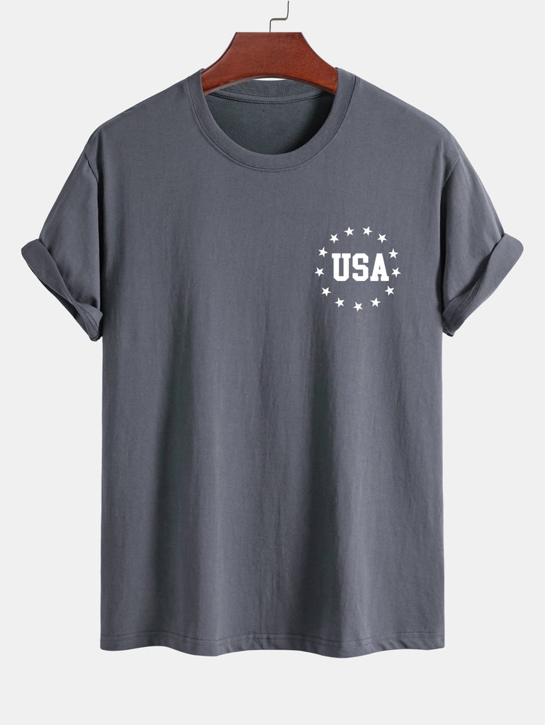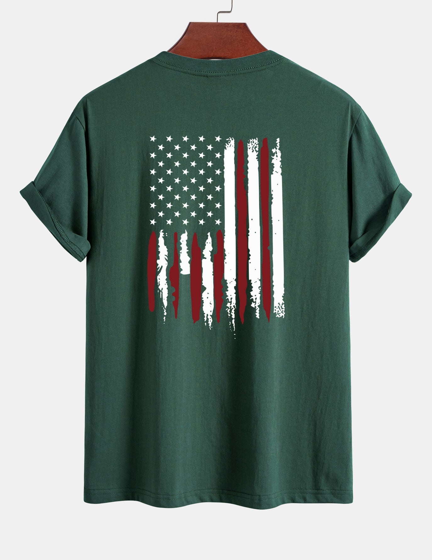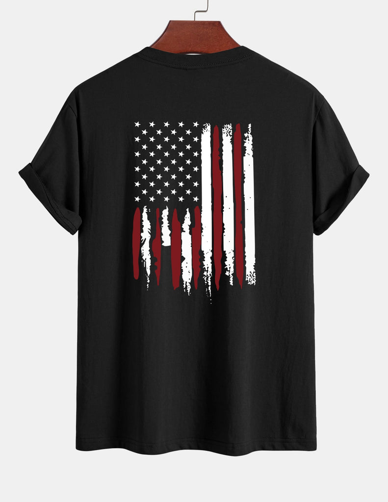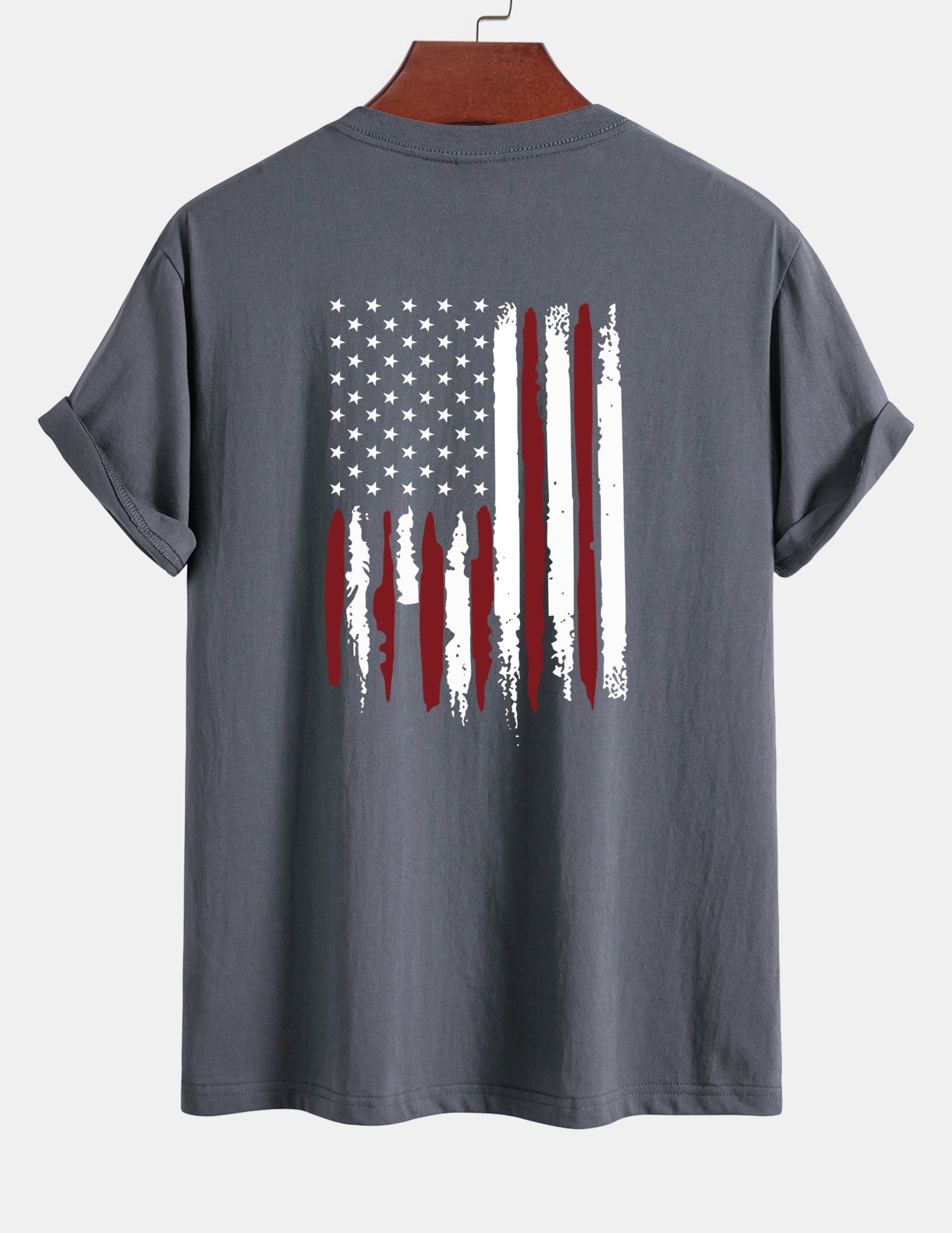 Show your pride in timeless style with this Regular Fit USA flag print cotton T-shirt. Featuring a bold American flag graphic and a comfortable everyday fit, this tee is perfect for holidays, casual outings, or just repping the red, white, and blue year-round.