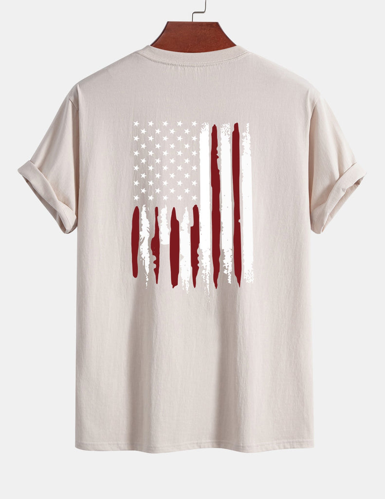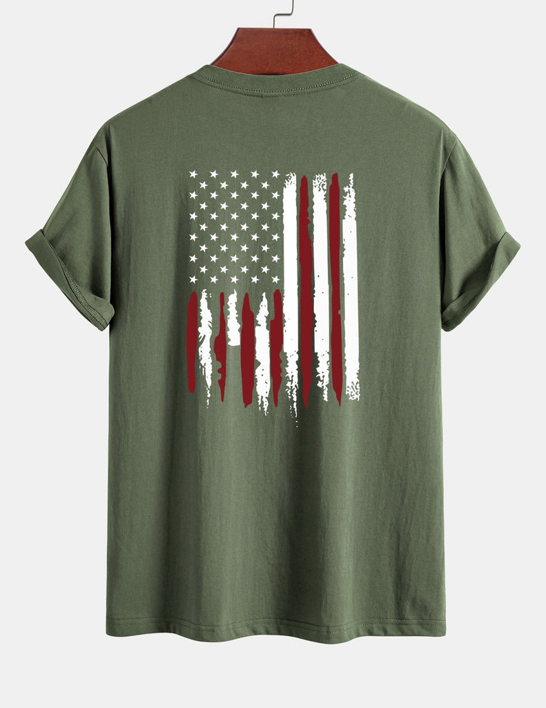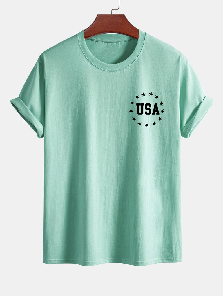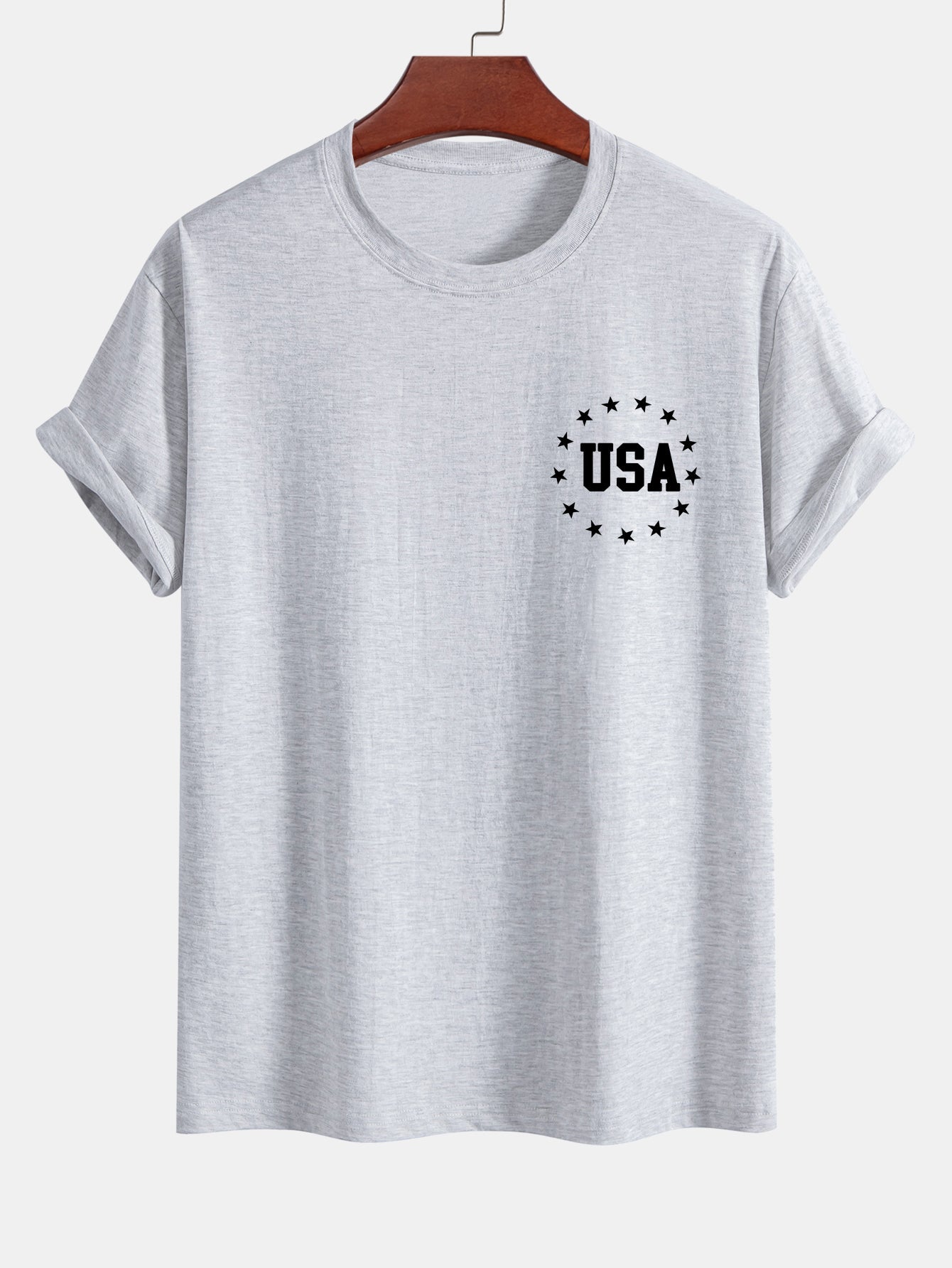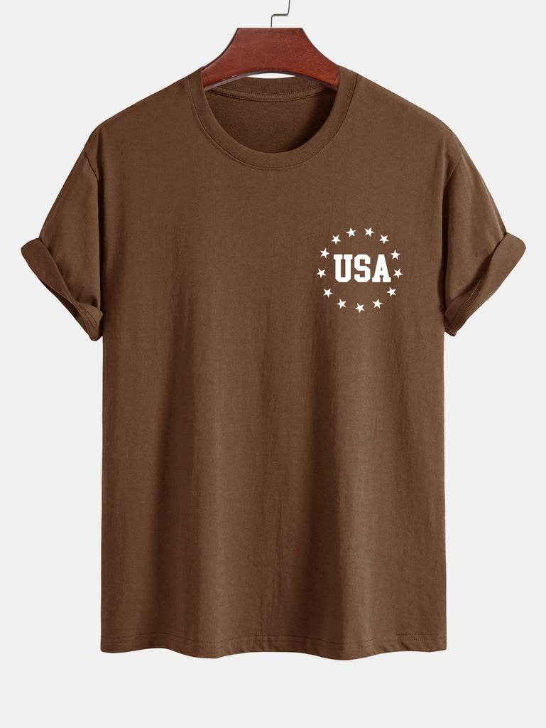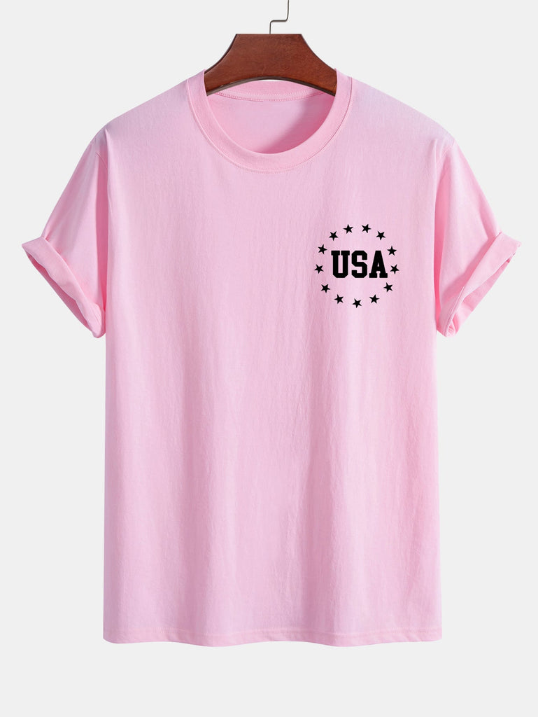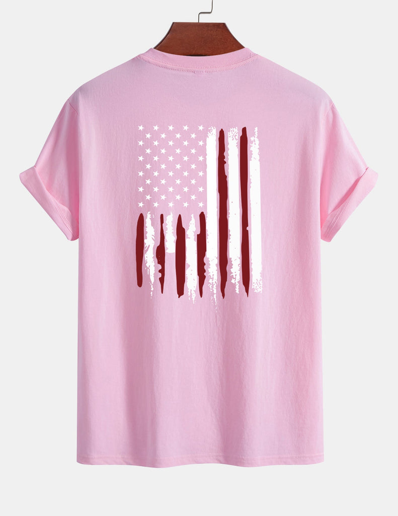 Show your pride in timeless style with this Regular Fit USA flag print cotton T-shirt. Featuring a bold American flag graphic and a comfortable everyday fit, this tee is perfect for holidays, casual outings, or just repping the red, white, and blue year-round.