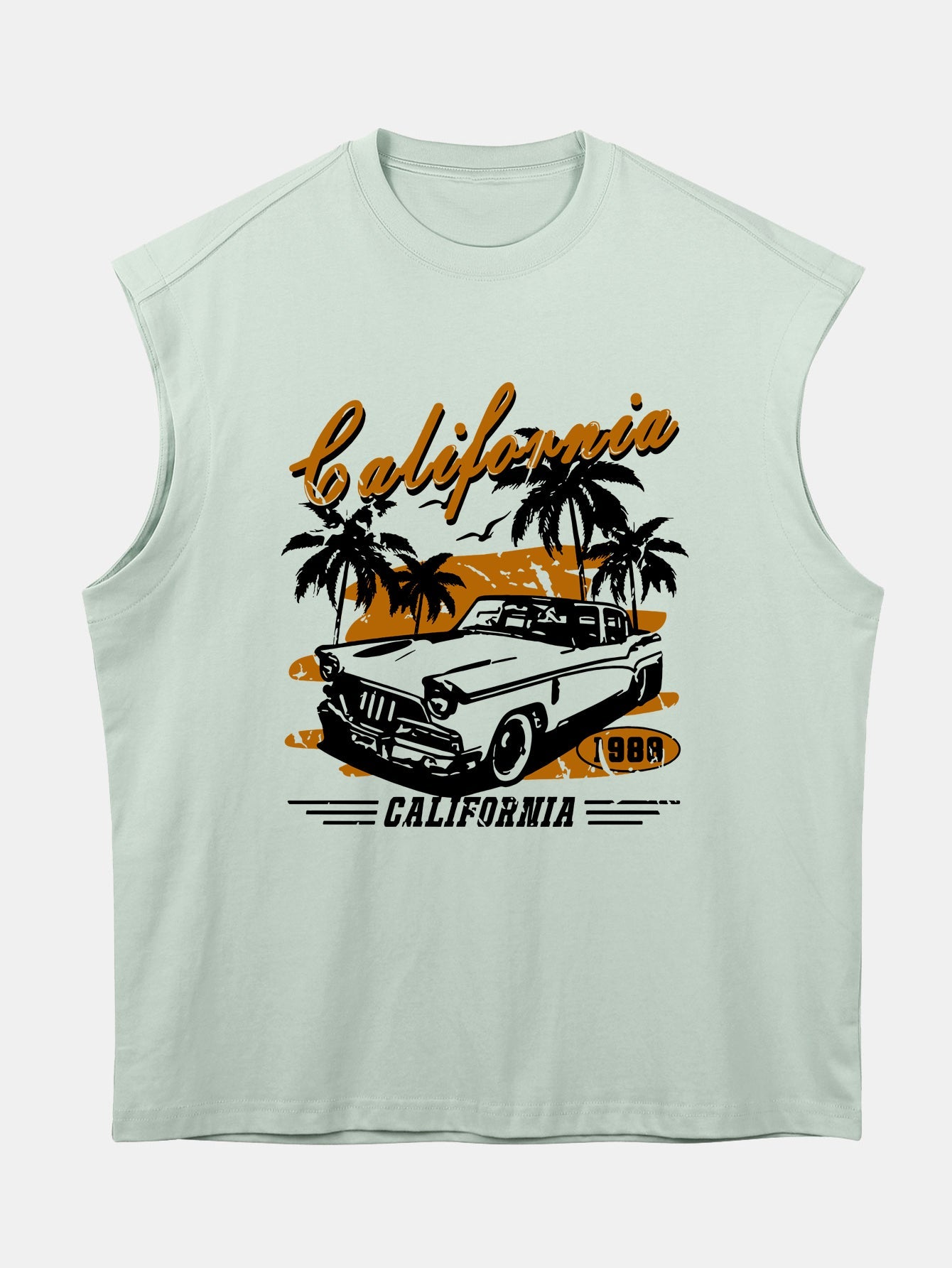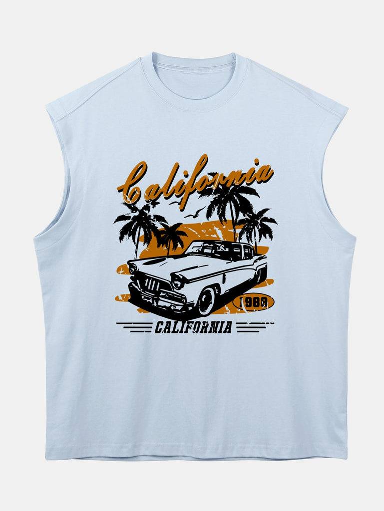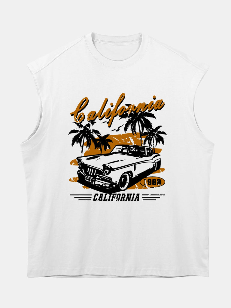 Cruise into laid-back style with this relaxed-fit sleeveless T-shirt. Featuring a retro-inspired California car graphic, it captures the spirit of the West Coast with effortless cool. Made from soft, breathable cotton and designed with drop shoulders for a roomy, oversized fit¡ªperfect for everyday wear with a touch of vintage flair.
