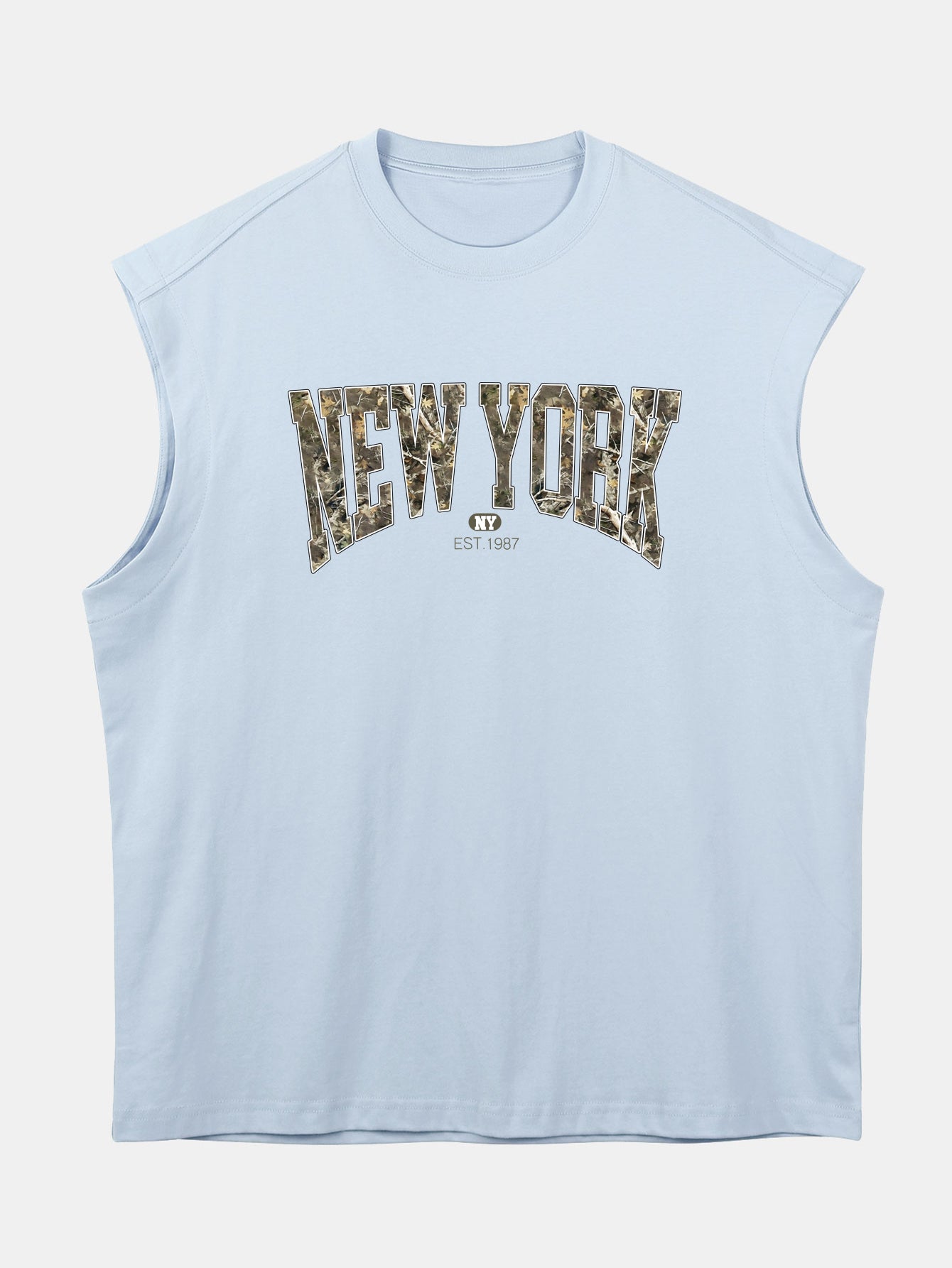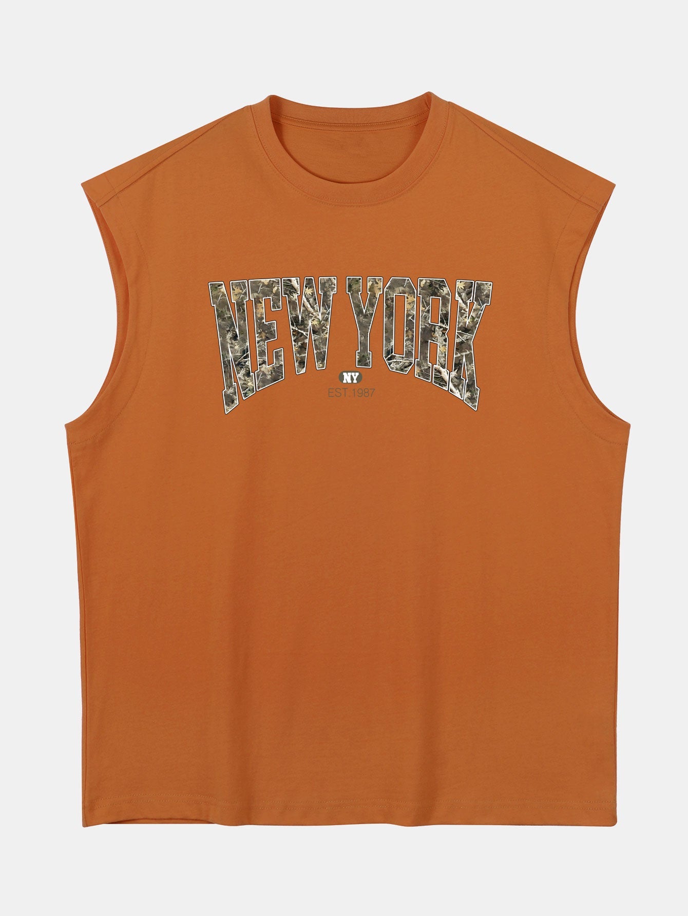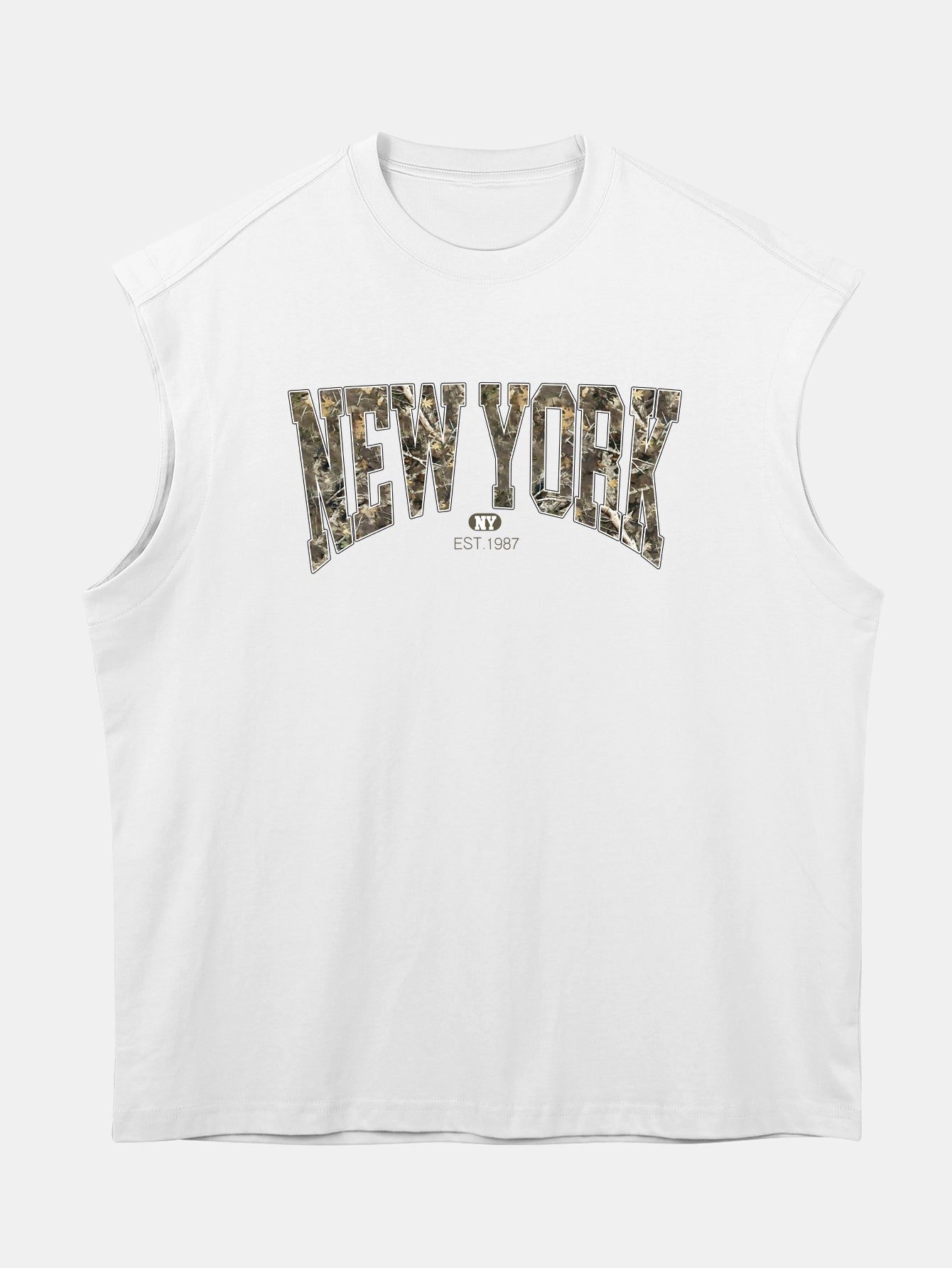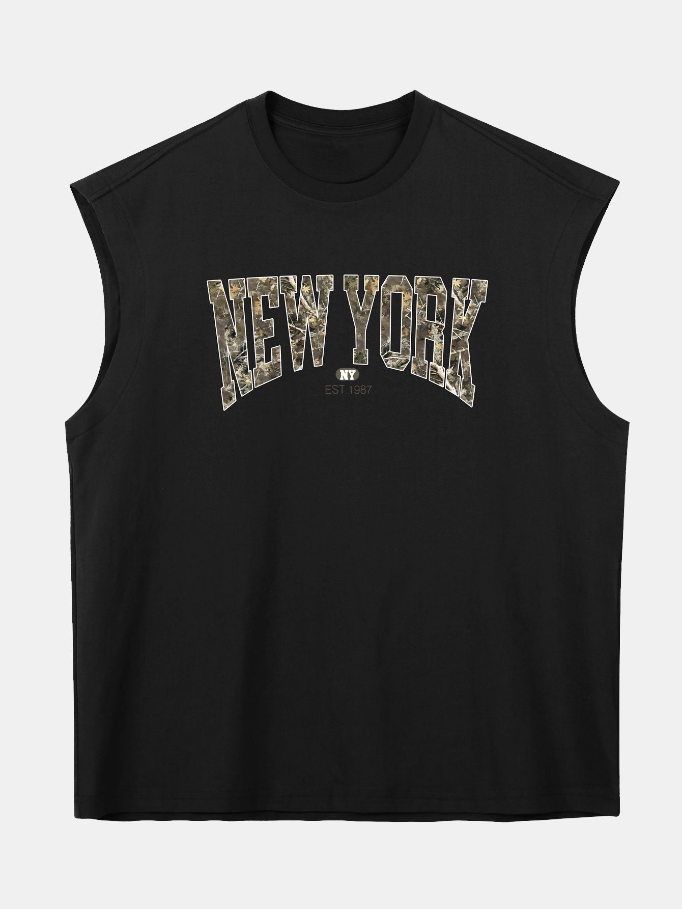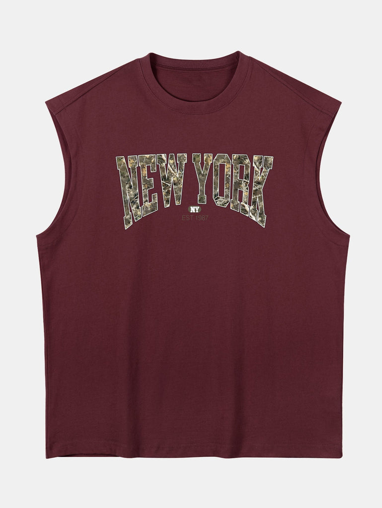 Blend urban edge with laid-back comfort in this relax fit sleeveless T-shirt, featuring a bold ¡°New York¡± graphic over a camouflage backdrop. Made from soft, breathable 100% cotton, this muscle-style tank is designed with a drop shoulder and loose fit for an effortlessly cool streetwear vibe. Perfect for summer days, gym sessions, or city strolls.