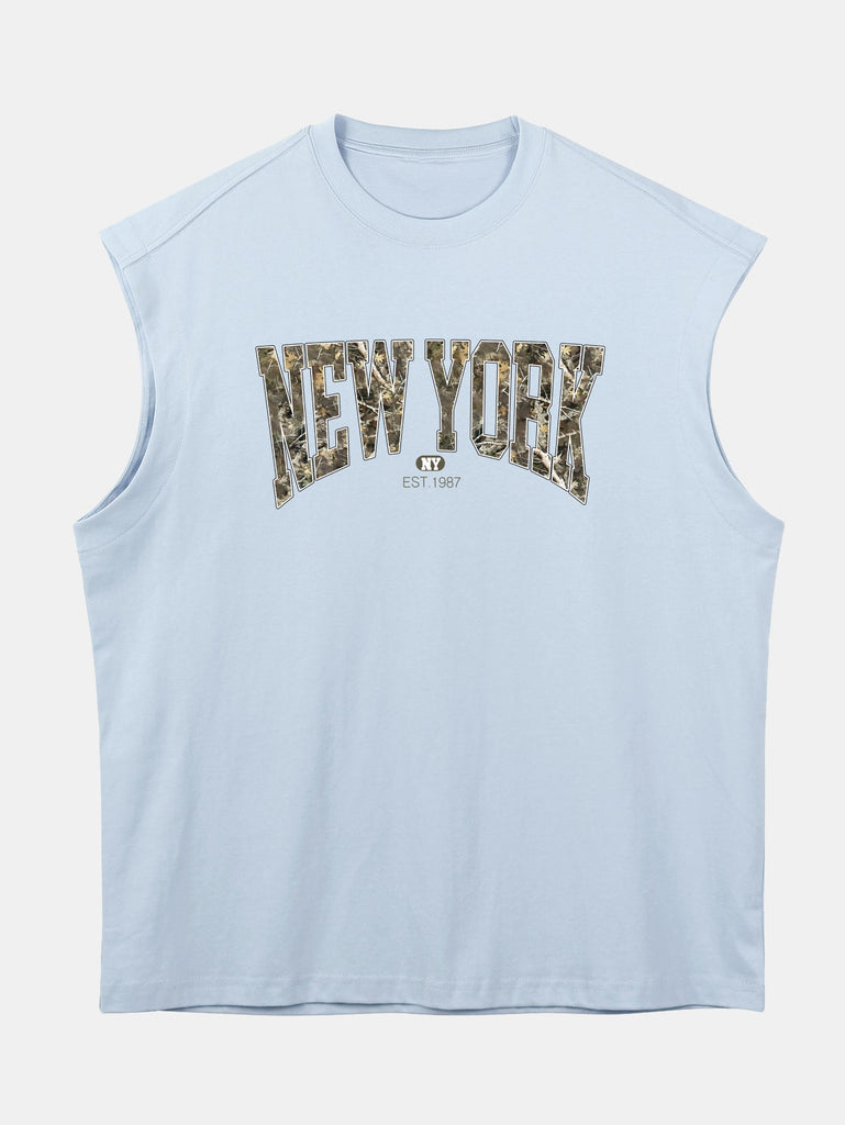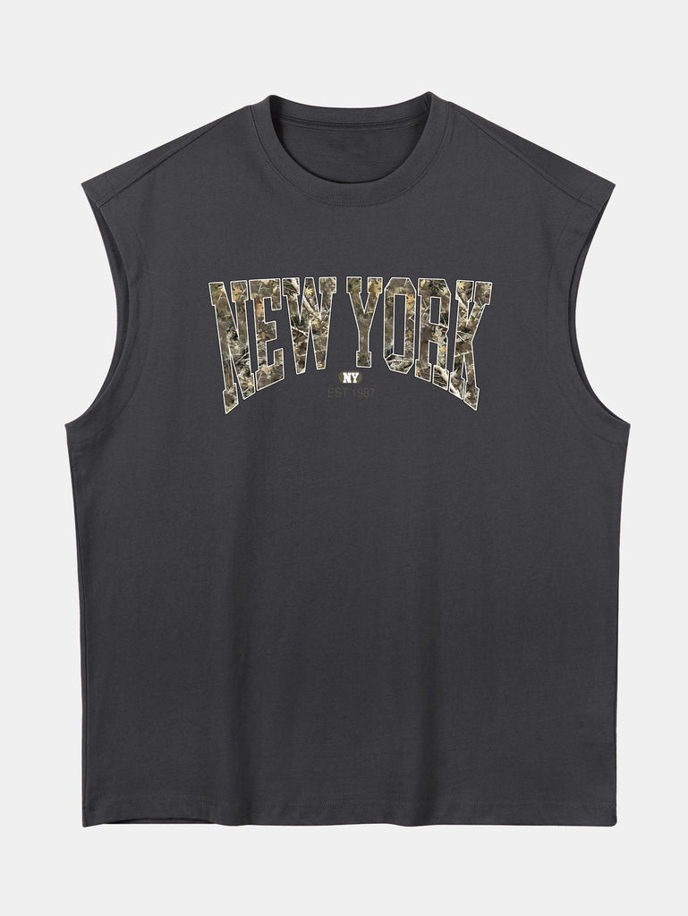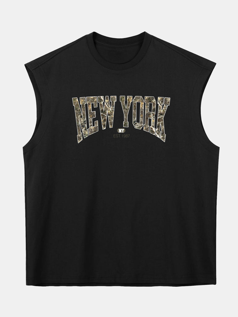 Relax Fit Camouflage New York Print Cotton Drop Shoulder Sleeveless T-Shirt