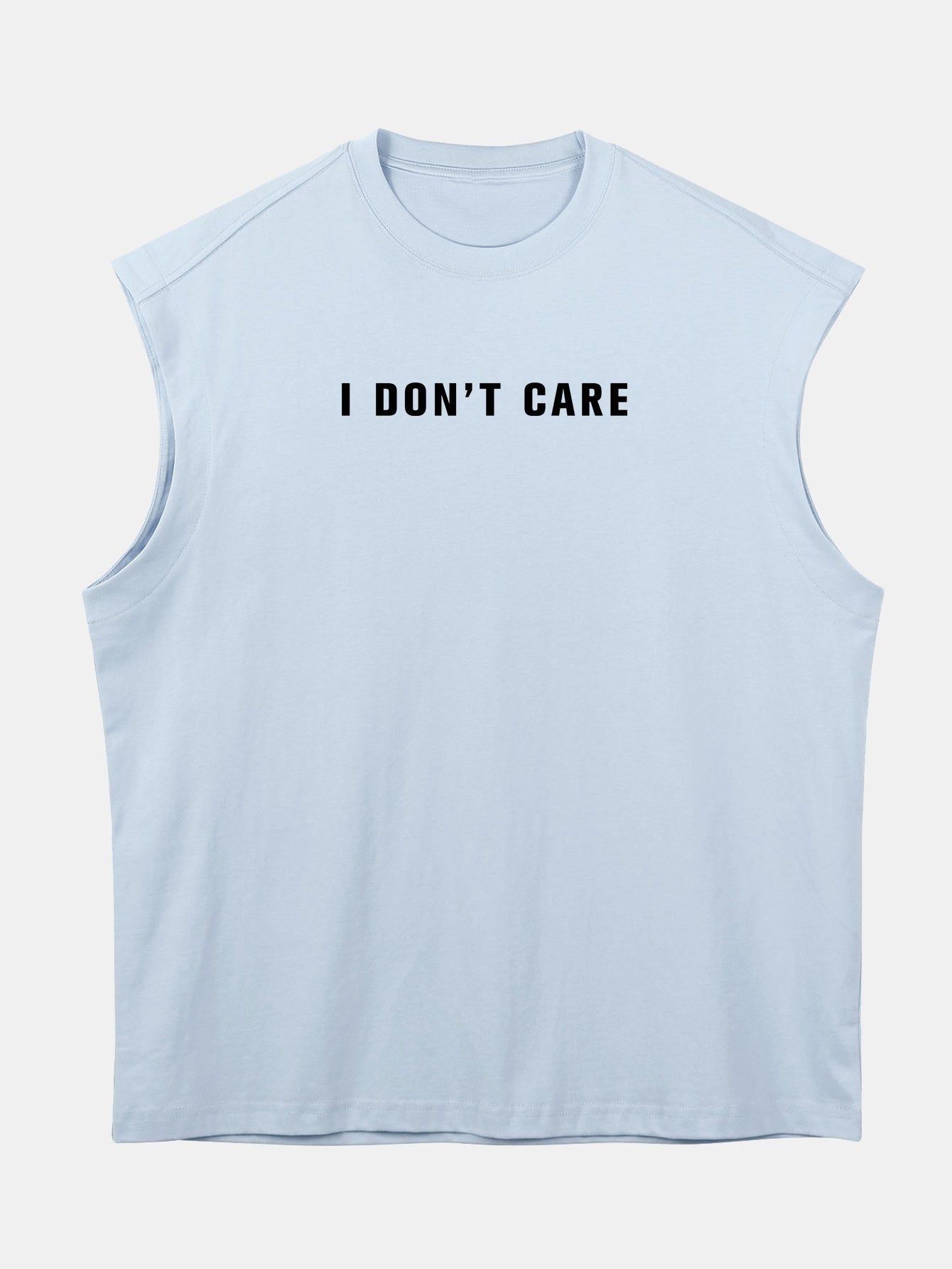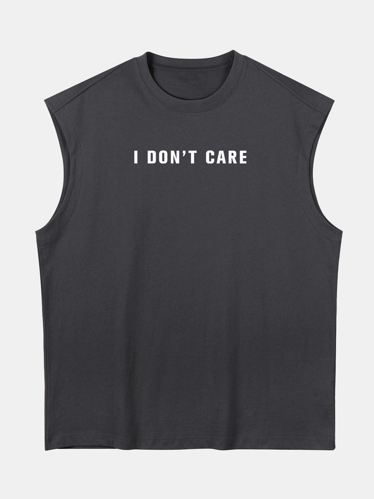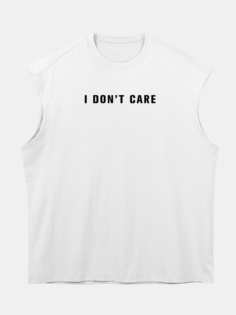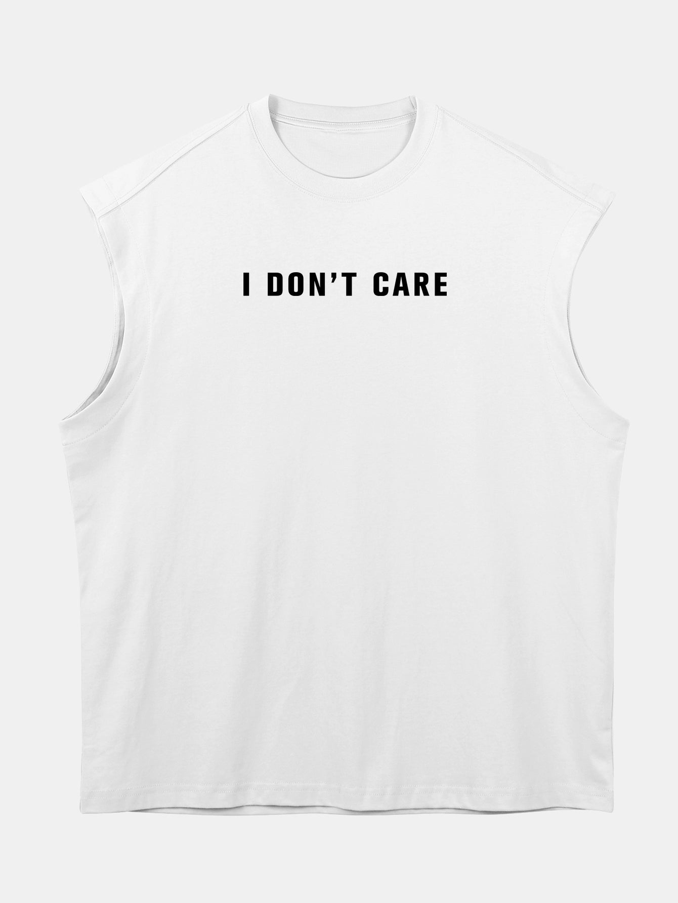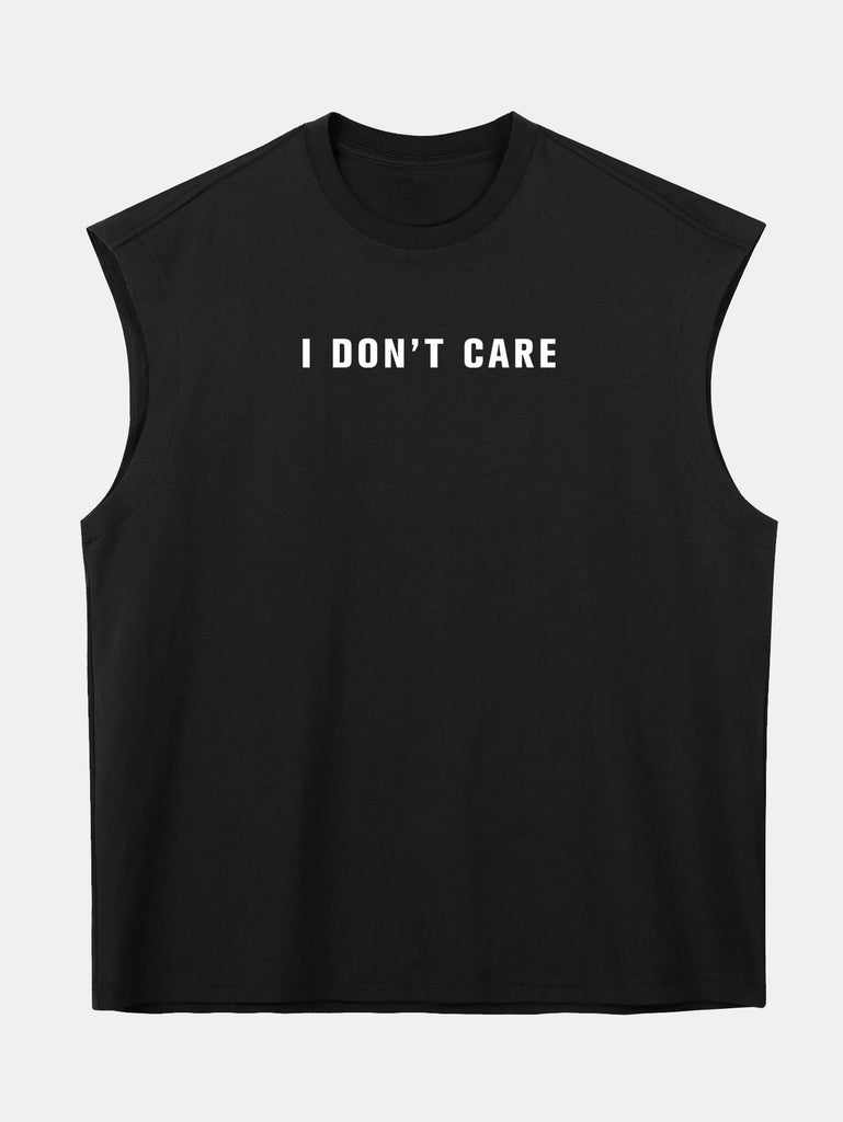 Own your attitude with this relaxed-fit sleeveless T-shirt. Featuring a striking ¡°I Don¡¯t Care¡± slogan print, this piece delivers effortless edge and rebellious charm. Made from soft, breathable cotton with drop shoulders and an oversized fit, it¡¯s all about comfort with a statement.