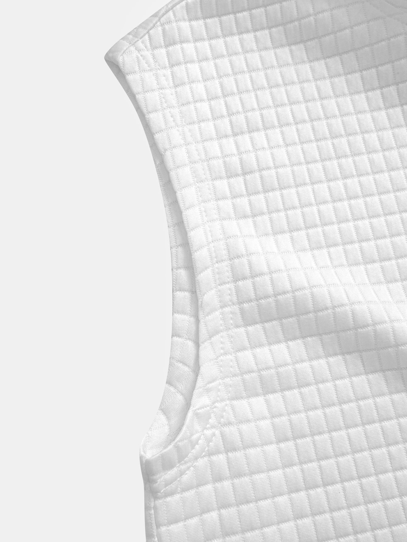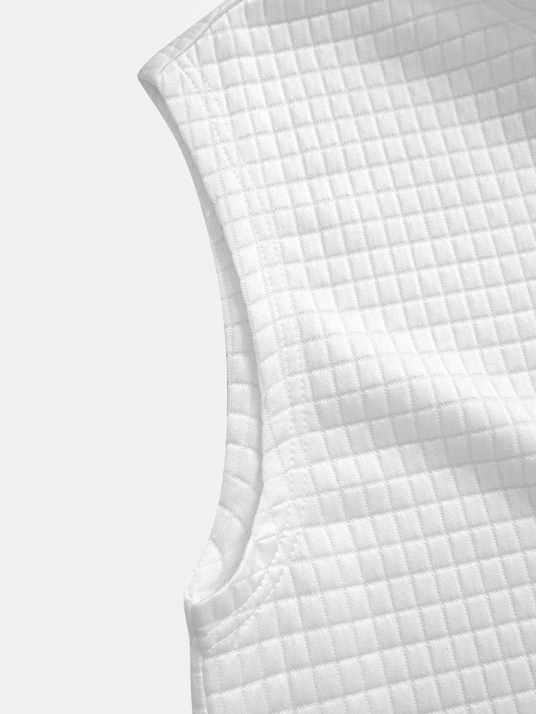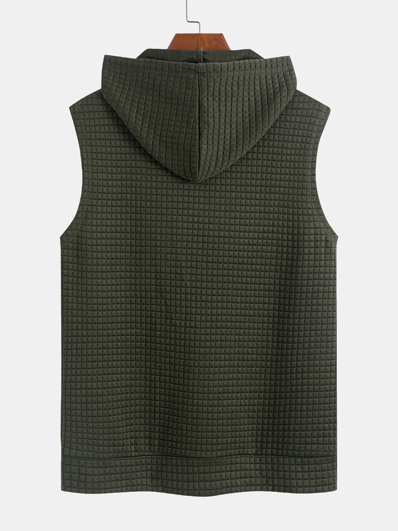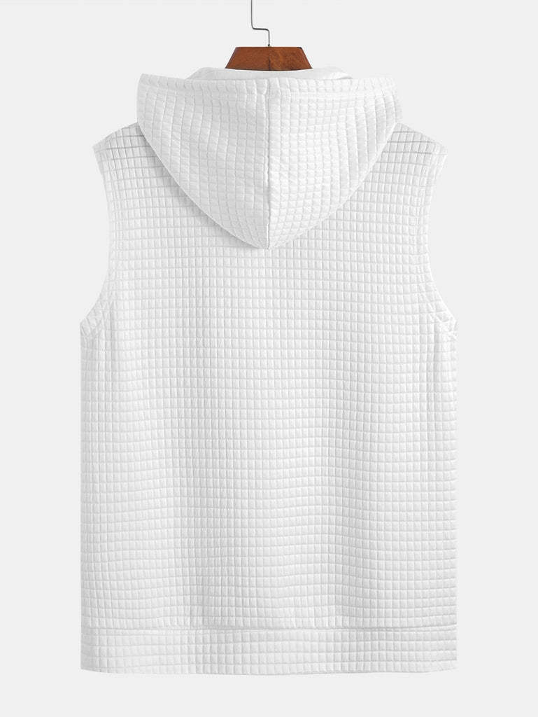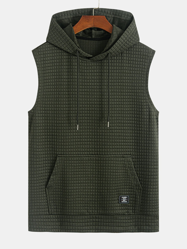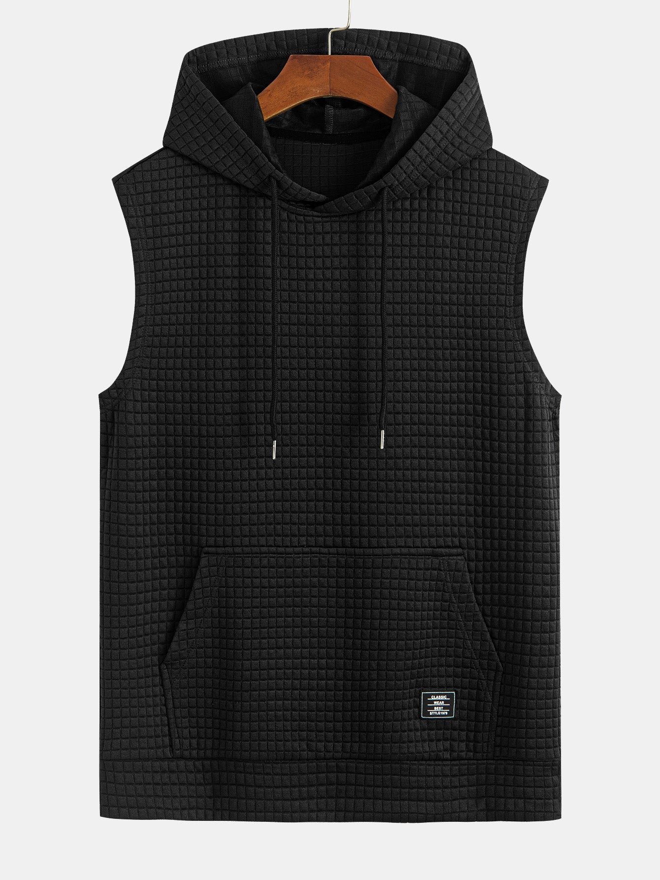 Stay cool and sharp with this modern sleeveless hoodie, crafted with a textured plaid jacquard design for a subtle yet standout look. The lightweight fabric and relaxed fit provide all-day comfort, while the hood adds an urban twist. Perfect for layering or wearing solo on warm days¡ªideal for workouts, streetwear, or laid-back weekends.