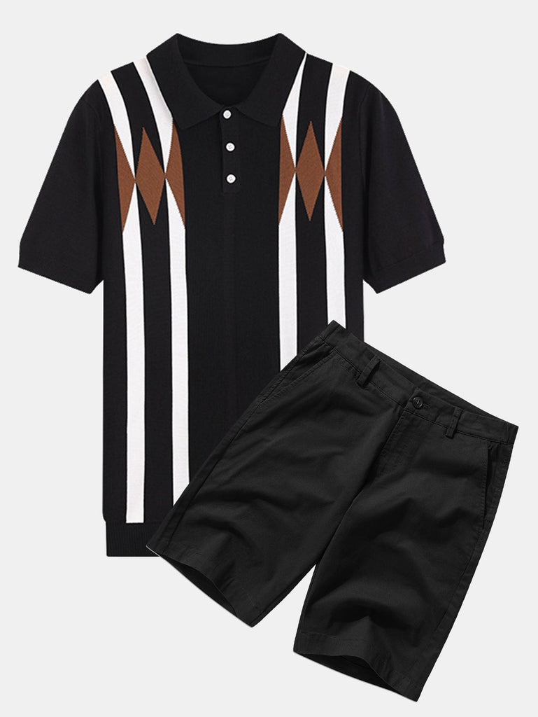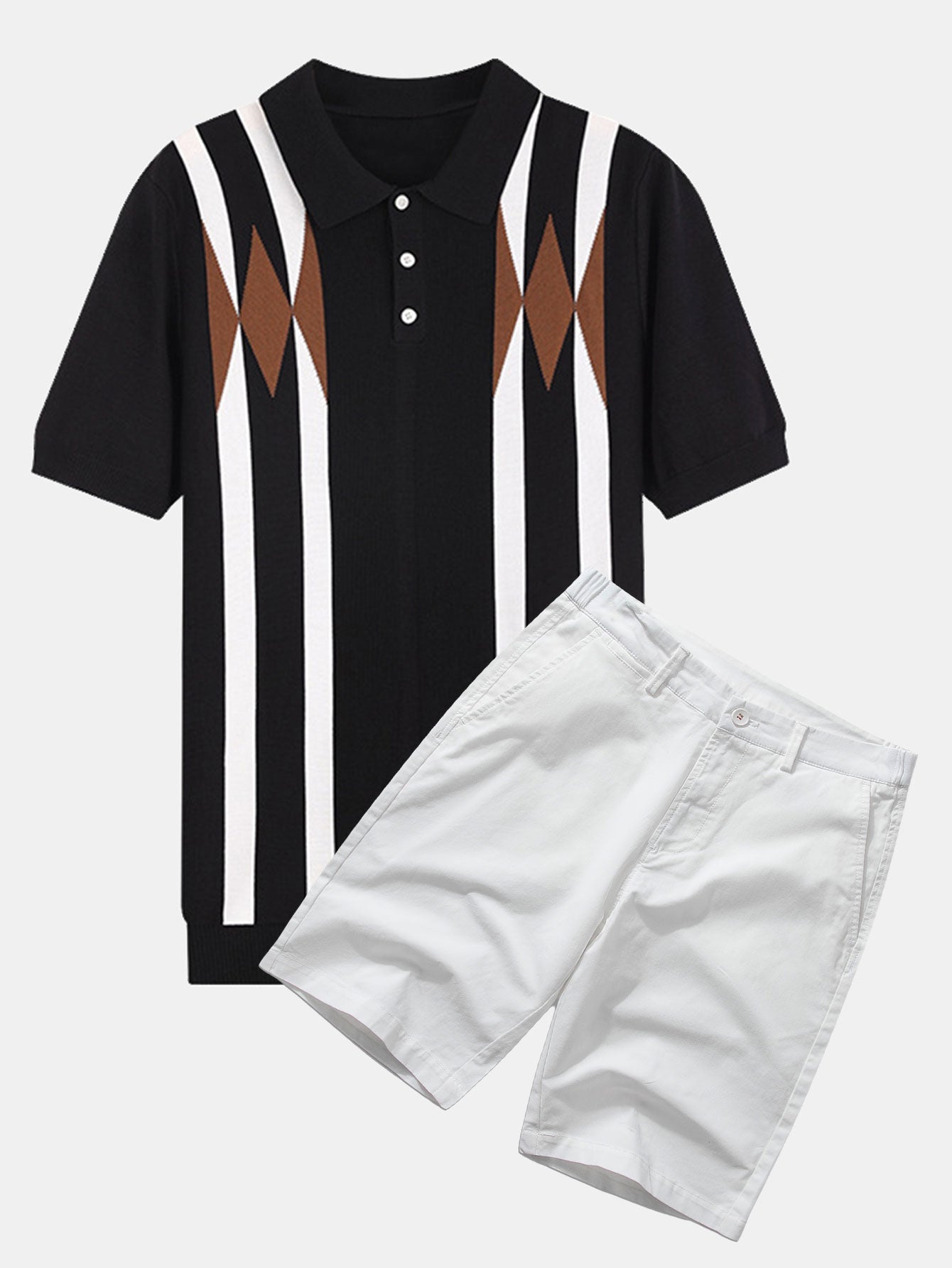 Stripe Geometric Jacquard Knitted Polo Shirt & Cotton Chino Shorts