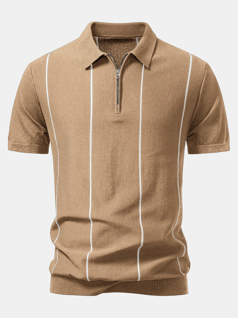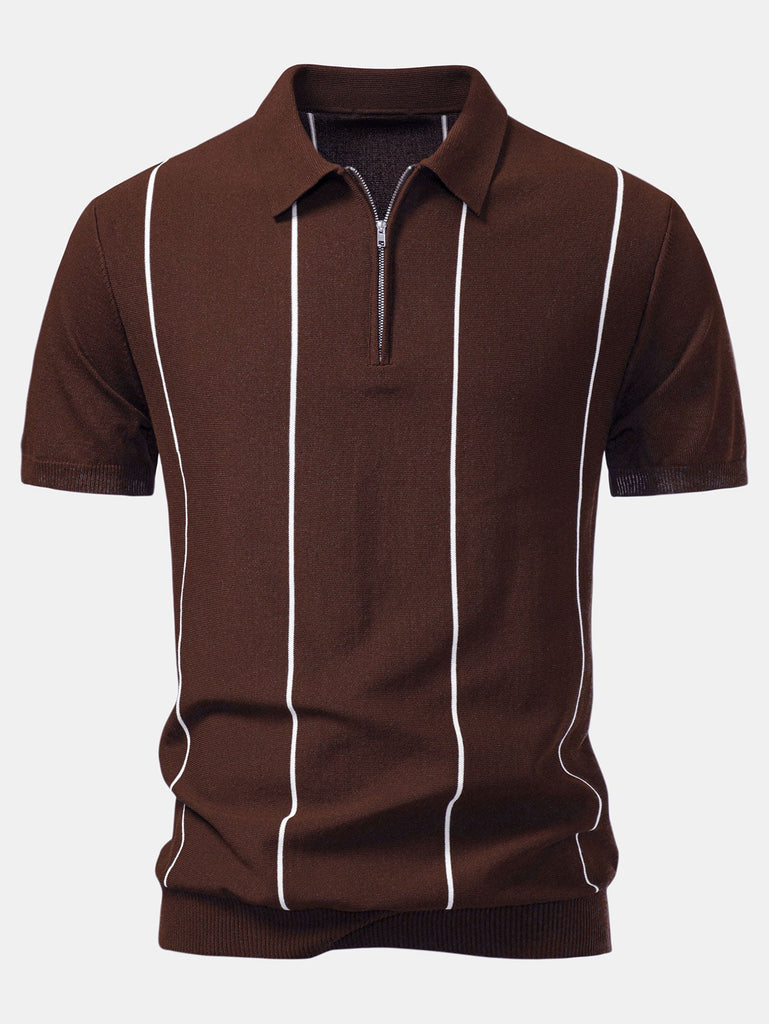 Featuring bold vertical stripes, this polo is made from soft, breathable knit fabric and finished with a sleek zip-up collar that adds a modern edge. Perfect for both weekday polish and weekend ease.