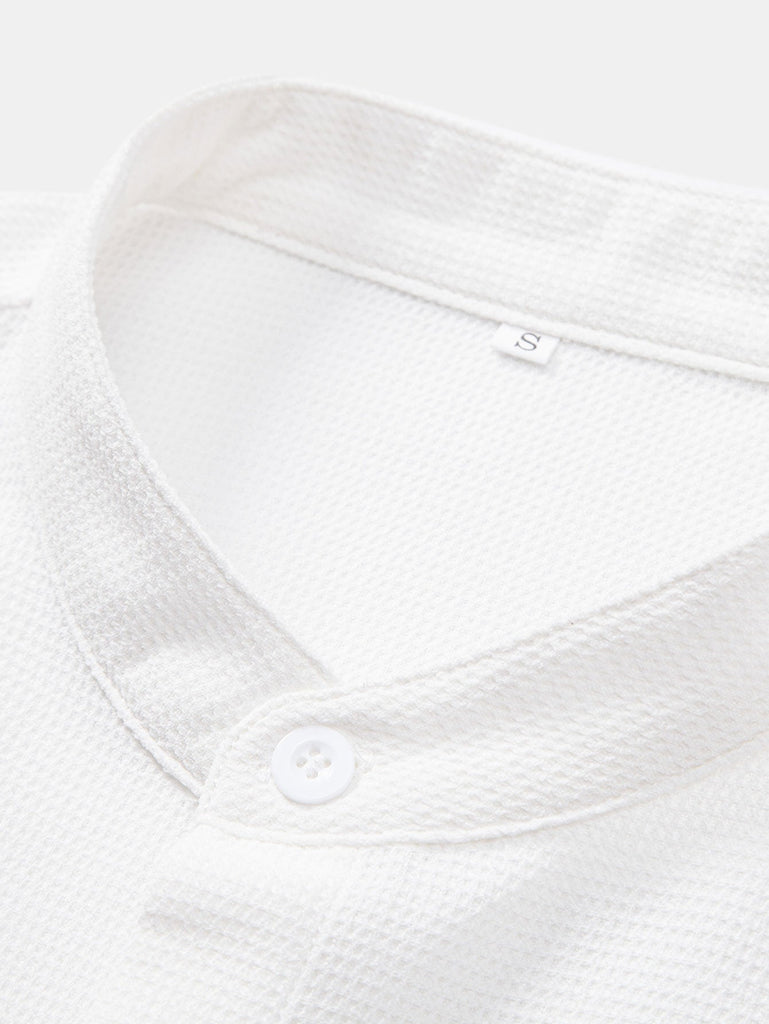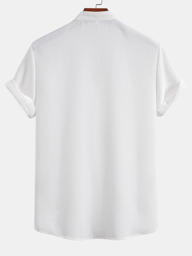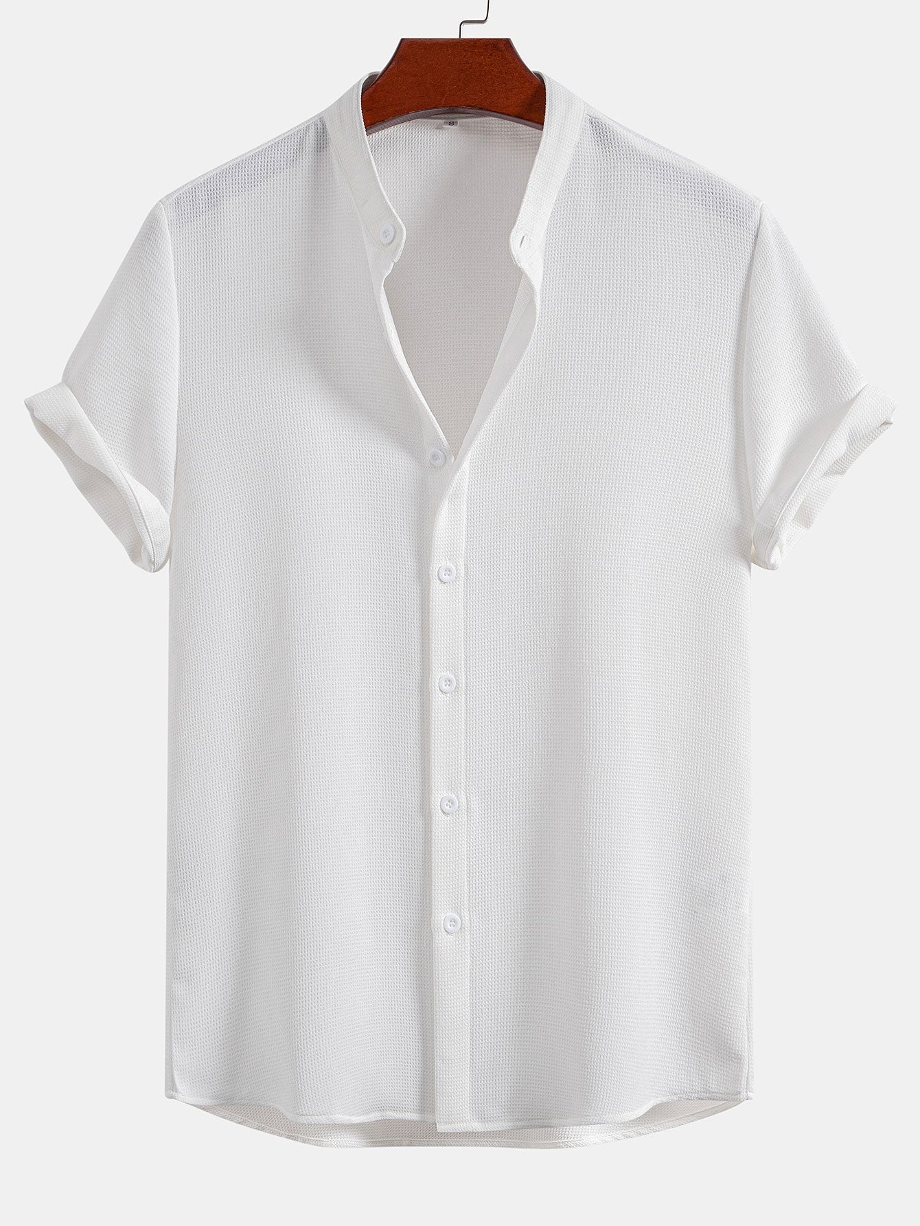 Crafted from a breathable, textured fabric, this shirt offers a unique look and feel that sets it apart from the ordinary. The stand collar design adds a sleek, contemporary edge, while the button-up front ensures versatile styling¡ªwear it buttoned for a polished look or layered open over a tee for laid-back cool.