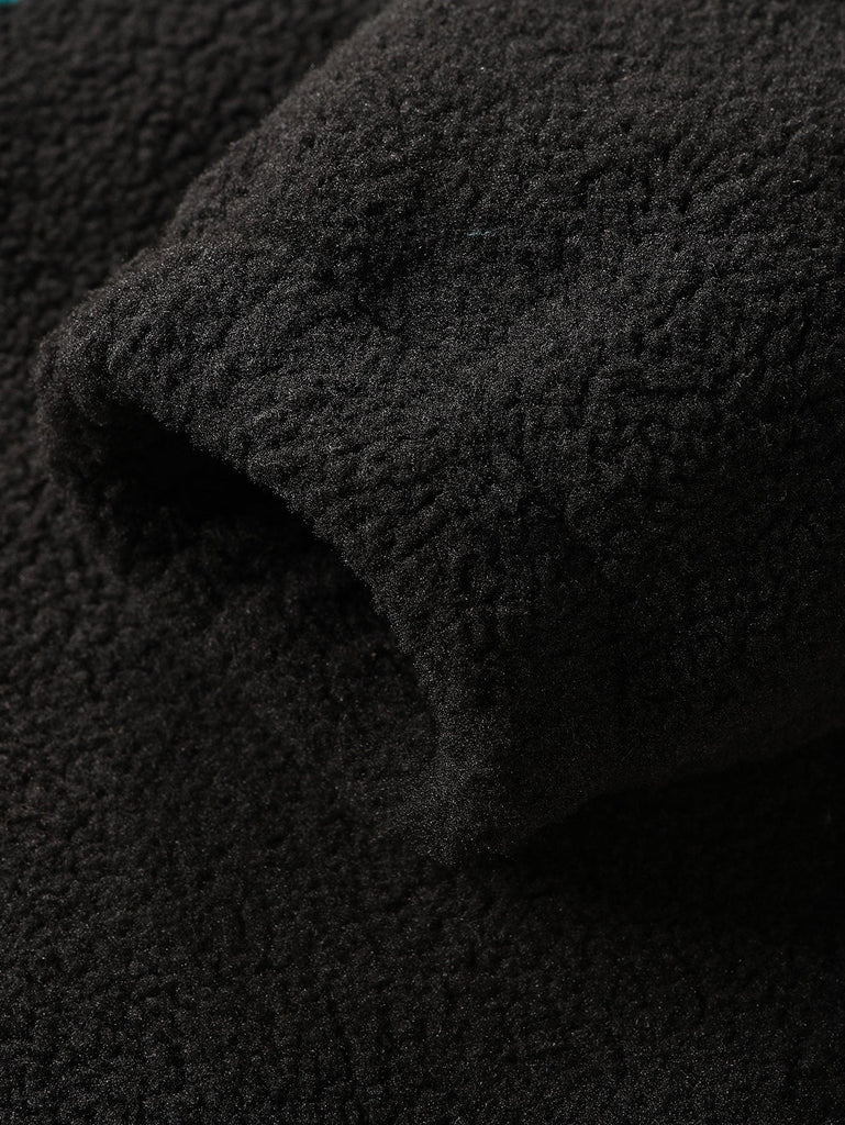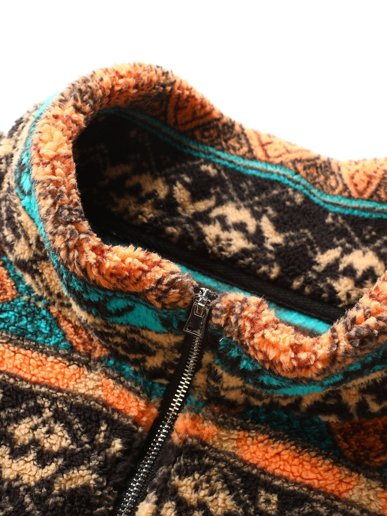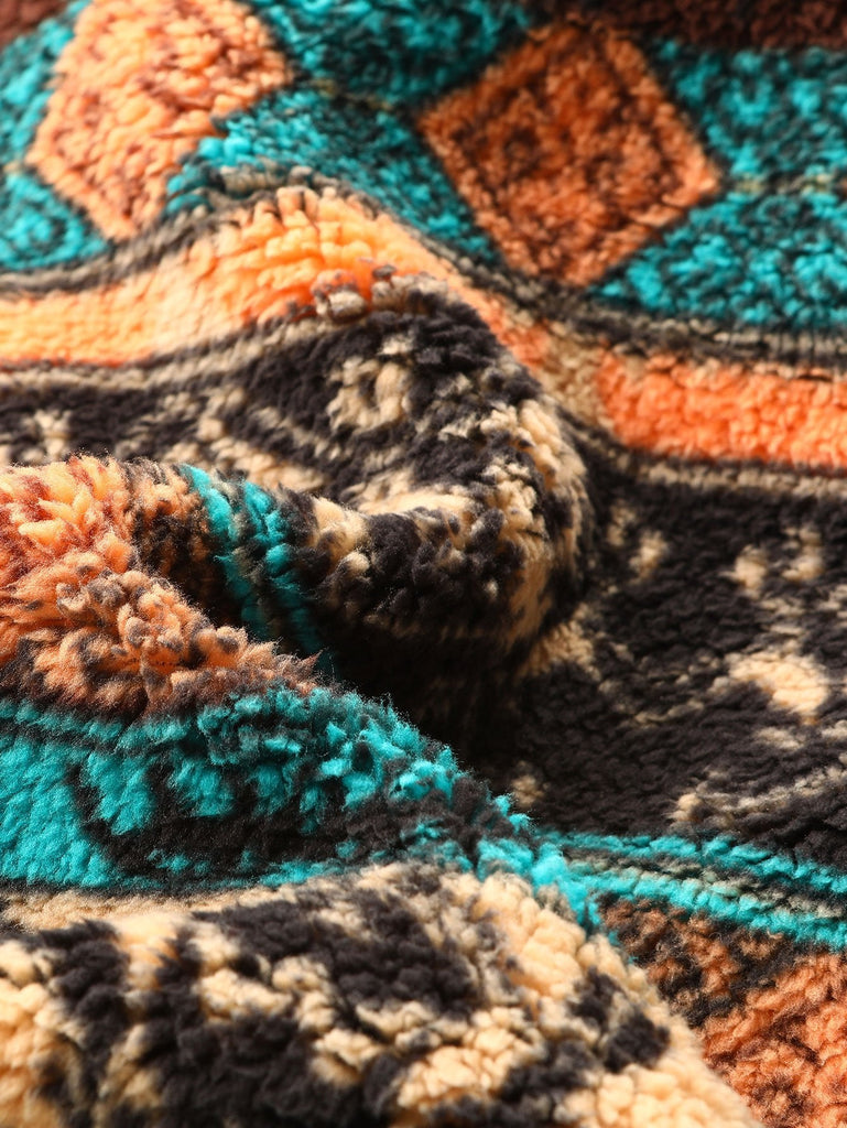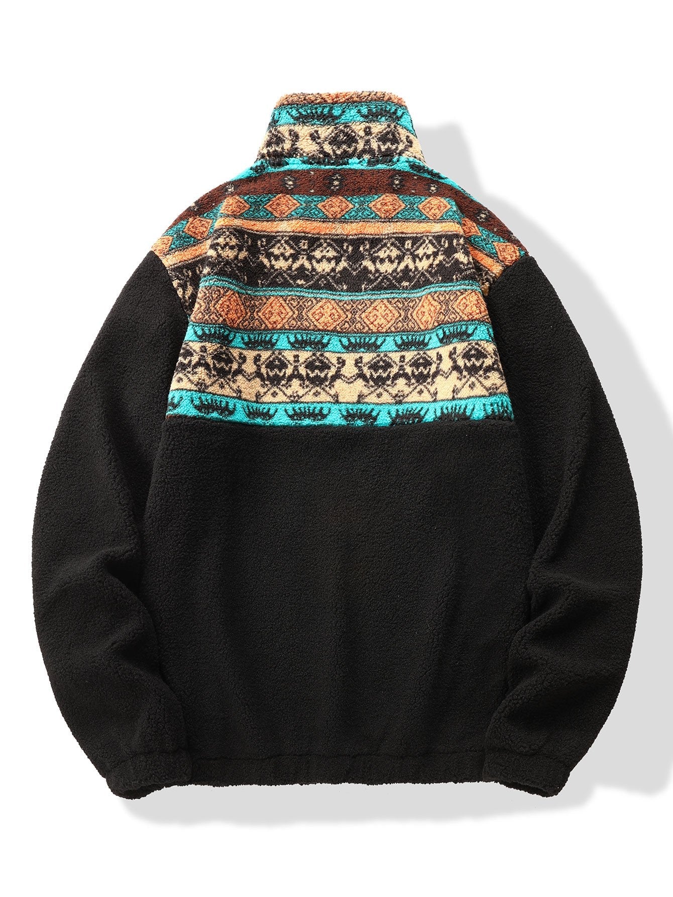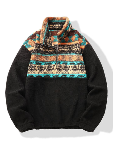 Relax Fit Quarter Zip Ethnic Geometric Patchwork Teddy Sweatshirt