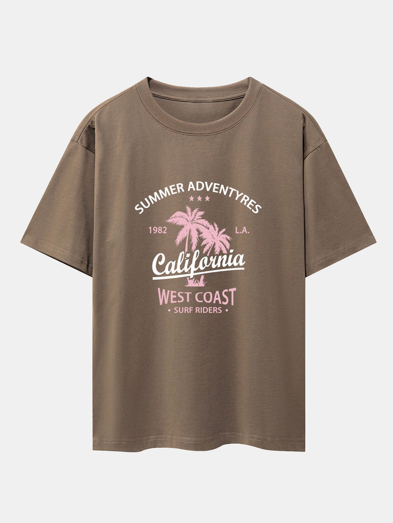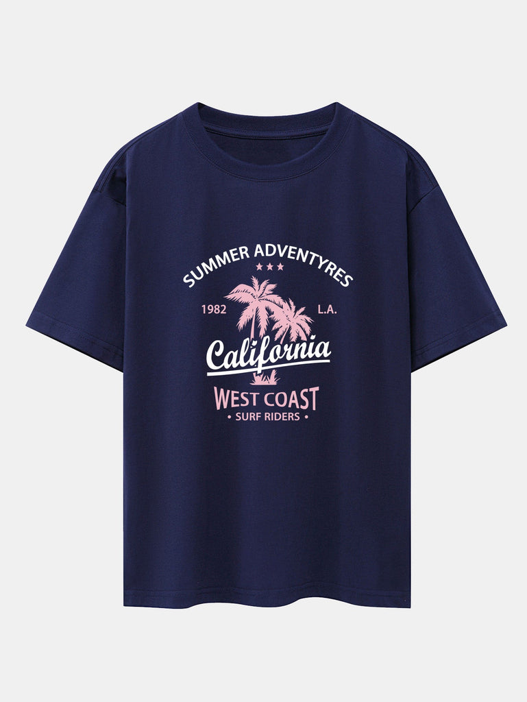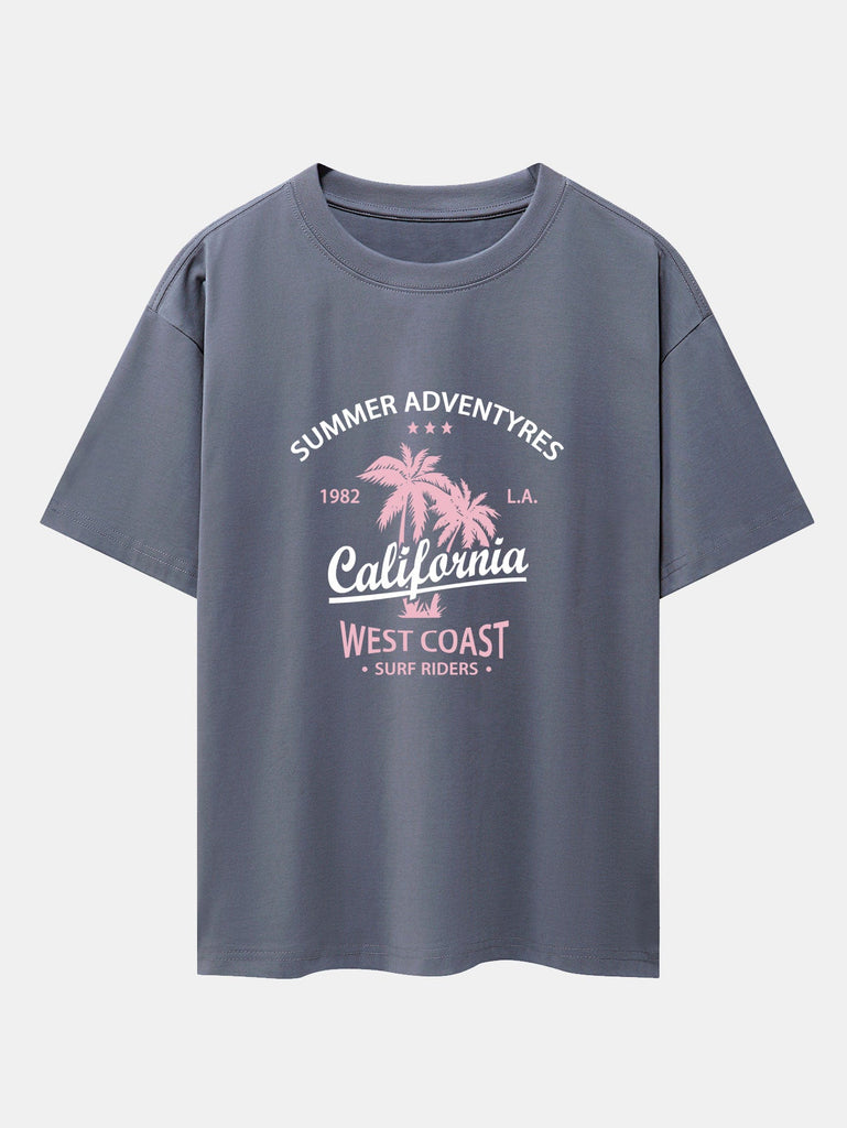 Bring the laid-back vibes of the West Coast to your wardrobe with the california palm tree print drop shoulder oversize T-shirt. Featuring a chill palm tree graphic and subtle California lettering, this tee captures the essence of sunny skies and coastal freedom. With its oversized fit and drop shoulder design, it¡¯s perfect for everyday comfort with a touch of beach-inspired style.