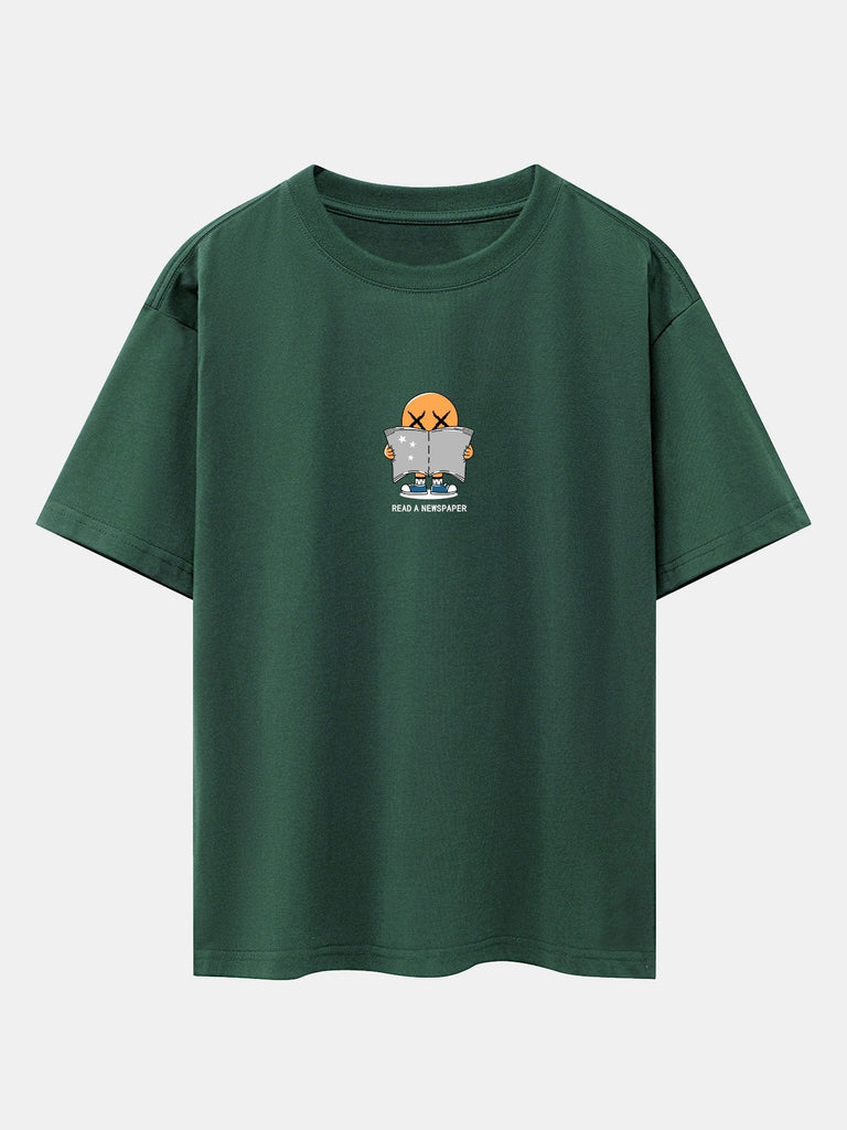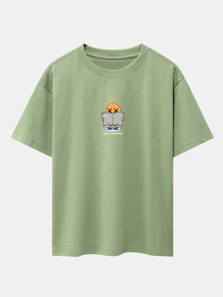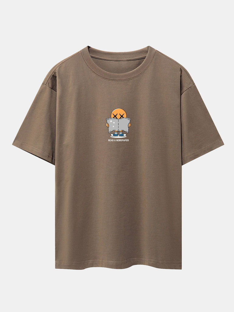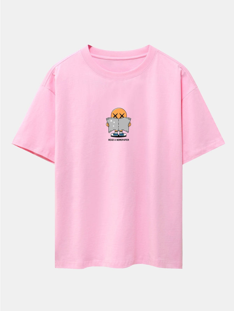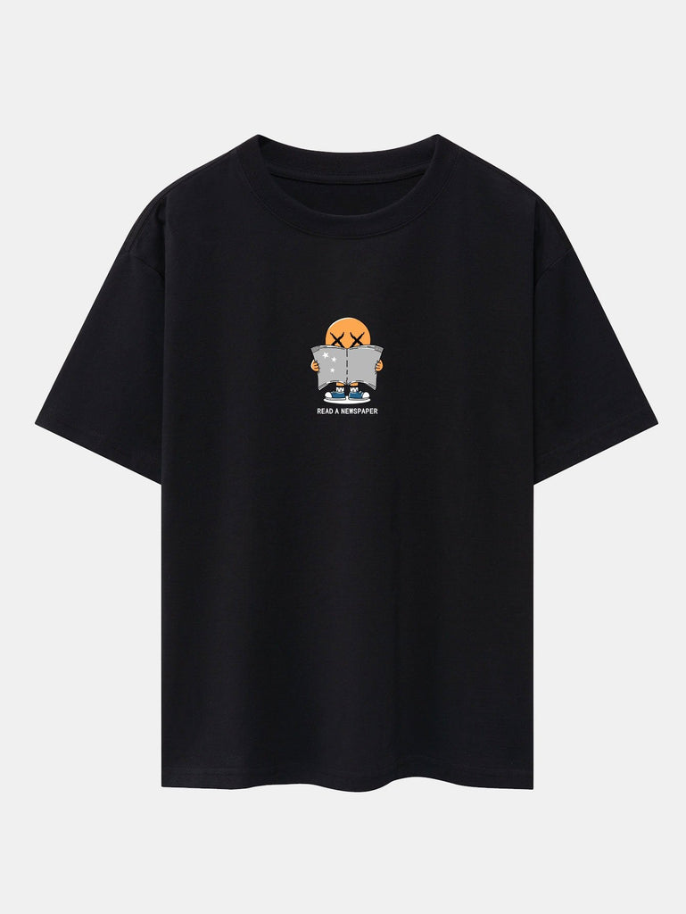Cartoon Smiley Read Newspaper Print Drop Shoulder Oversize T-Shirt
