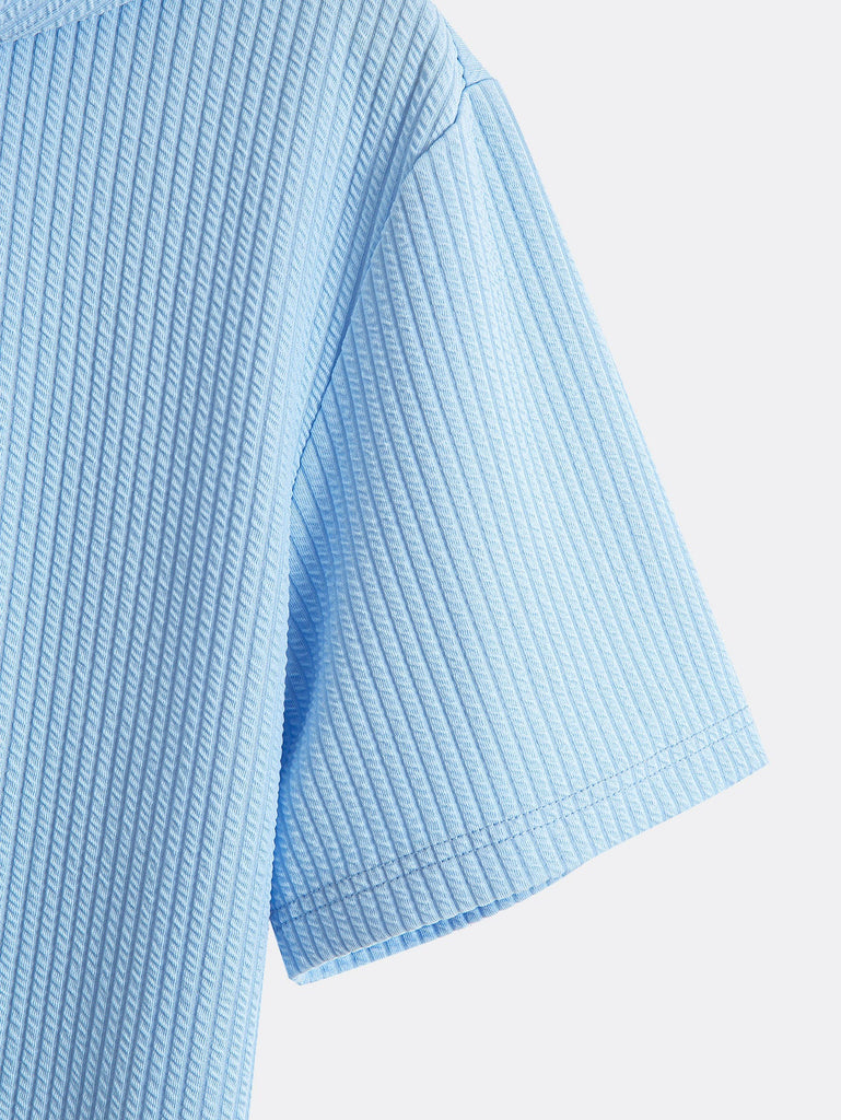 This short-sleeved hooded sweatshirt is made of ribbed texture fabric, which gives the garment a unique visual layering, combining fashion and practicality. The hood design is equipped with a drawstring, which can be adjusted freely, adding a casual and casual feeling to the overall shape. The practical front pocket is both beautiful and functional. Whether paired with casual shorts for strolling on the street or paired with sports trousers for outdoor activities, it can be easily controlled and is an excellent item for creating an everyday casual style.