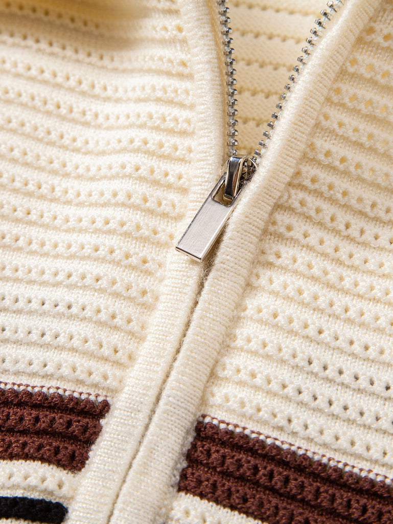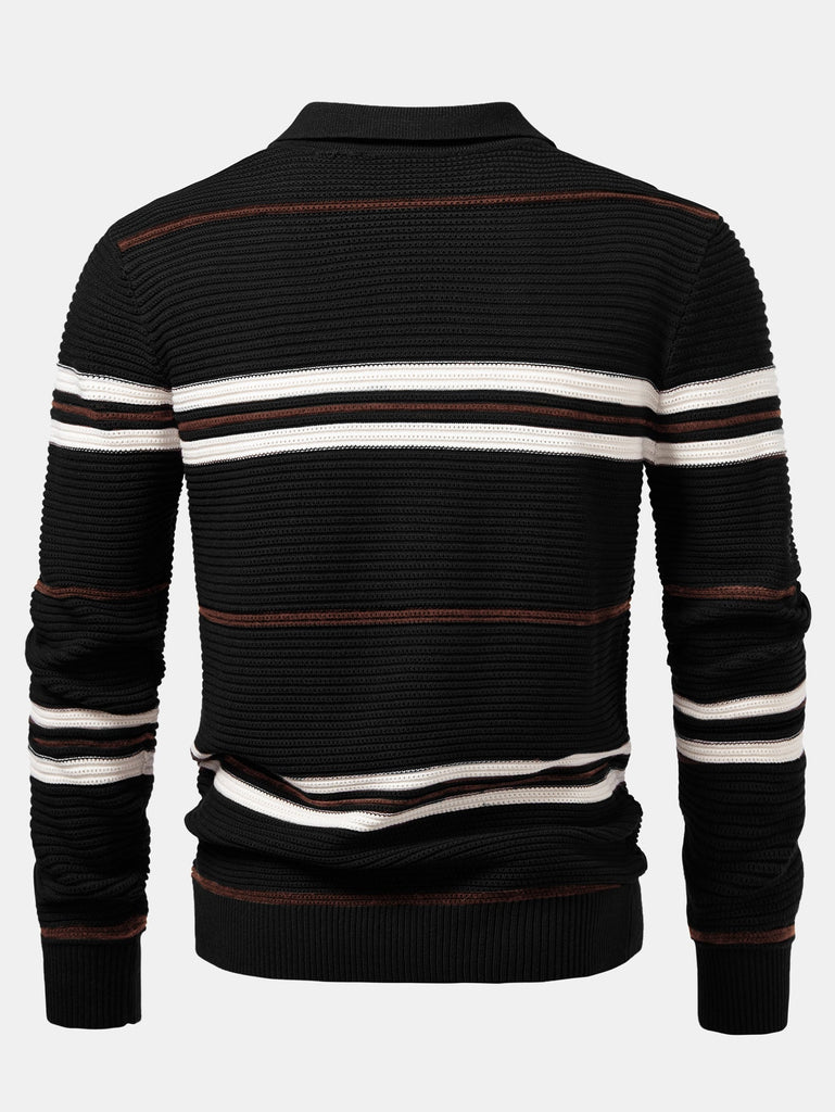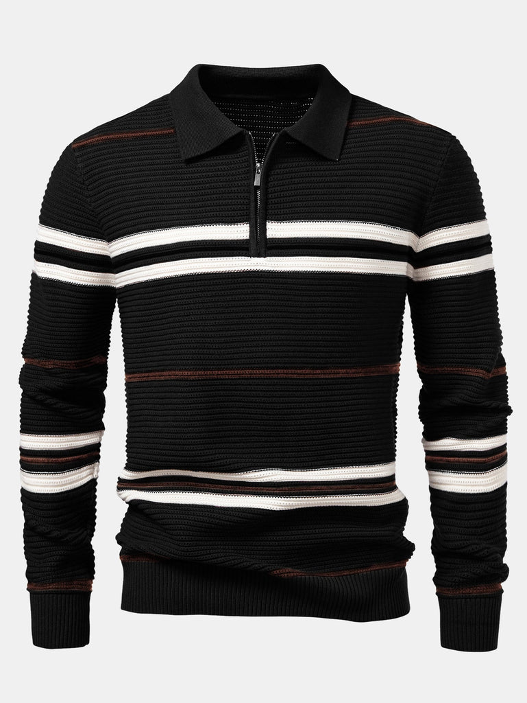 Featuring bold stripe detailing and a sleek quarter-zip neckline, it offers a modern take on a classic knitwear essential. The soft, breathable fabric ensures warmth without bulk, making it perfect for layering or wearing on its own. Whether dressed up with chinos or paired with jeans, this sweater is a go-to choice for smart-casual outfits.