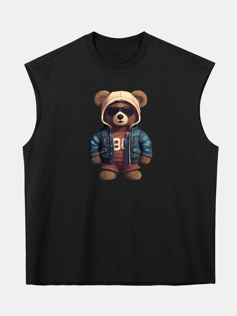 Relax Fit Bear In Leather Jacket Print Cotton Drop Shoulder Sleeveless T-Shirt