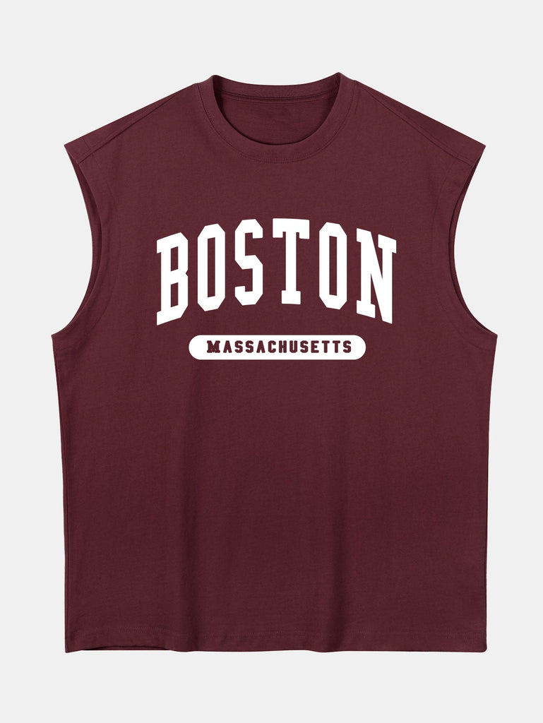 Relax Fit Boston Slogan Jacket Print Cotton Drop Shoulder Sleeveless T-Shirt