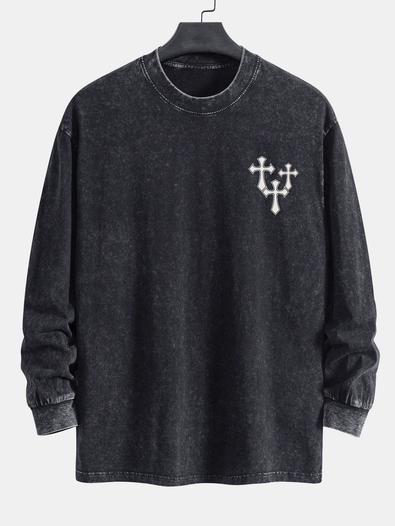 Cross Print Relax Fit Long Sleeve Washed Distressed T-Shirt