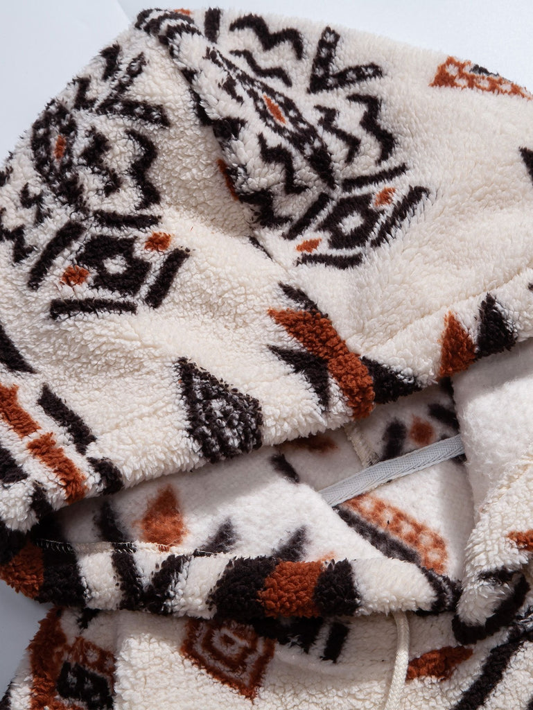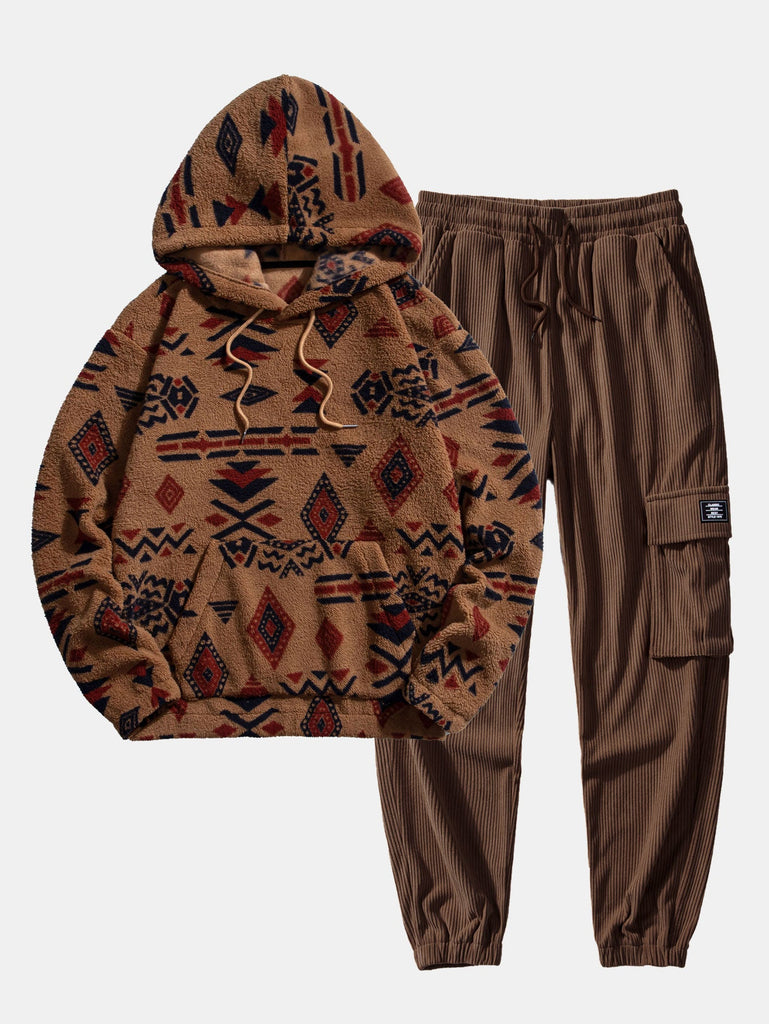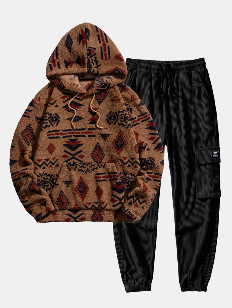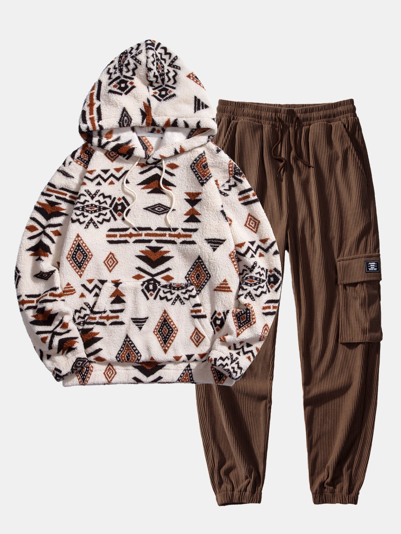 Aztec Print Teddy Hoodie & Drawstring Corduroy Cargo Jogger Pants