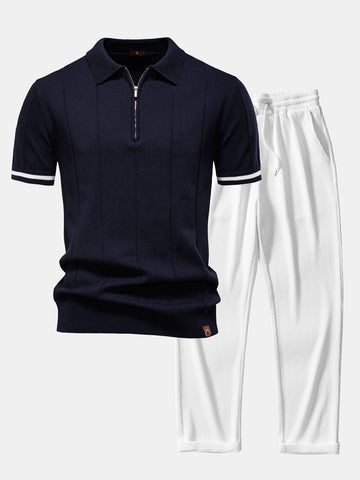 Contrast Trim Zipper Knit Polo Shirt & Straight Leg Ribbed Pants