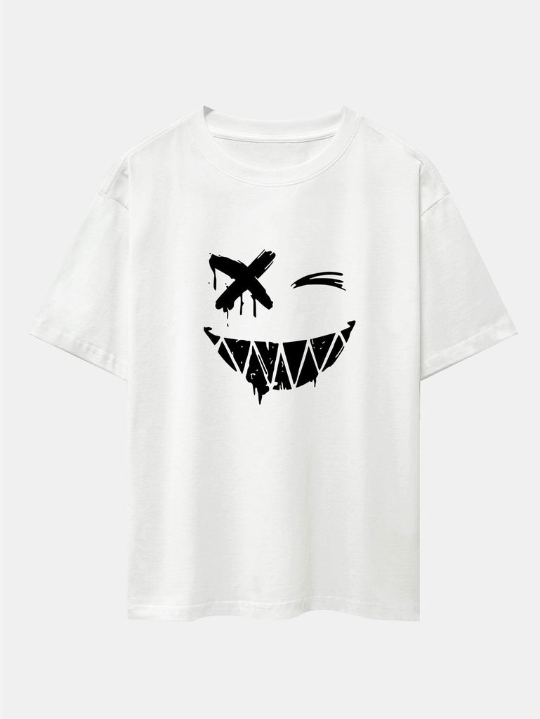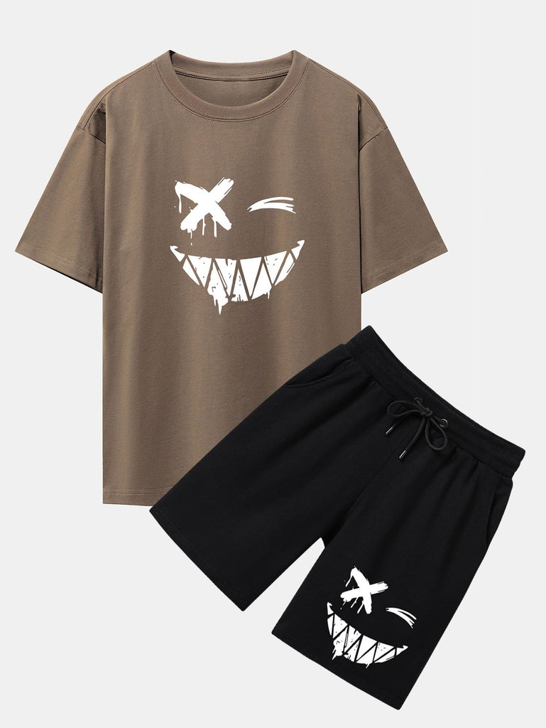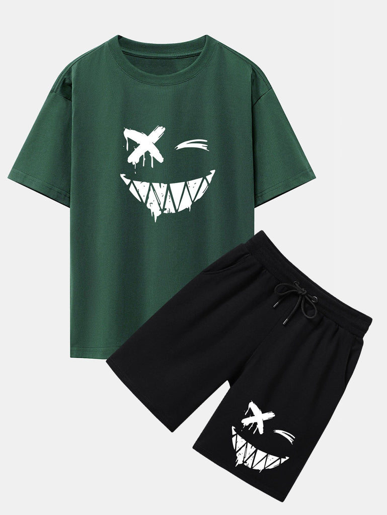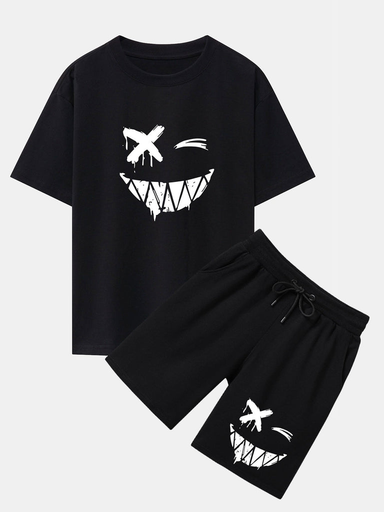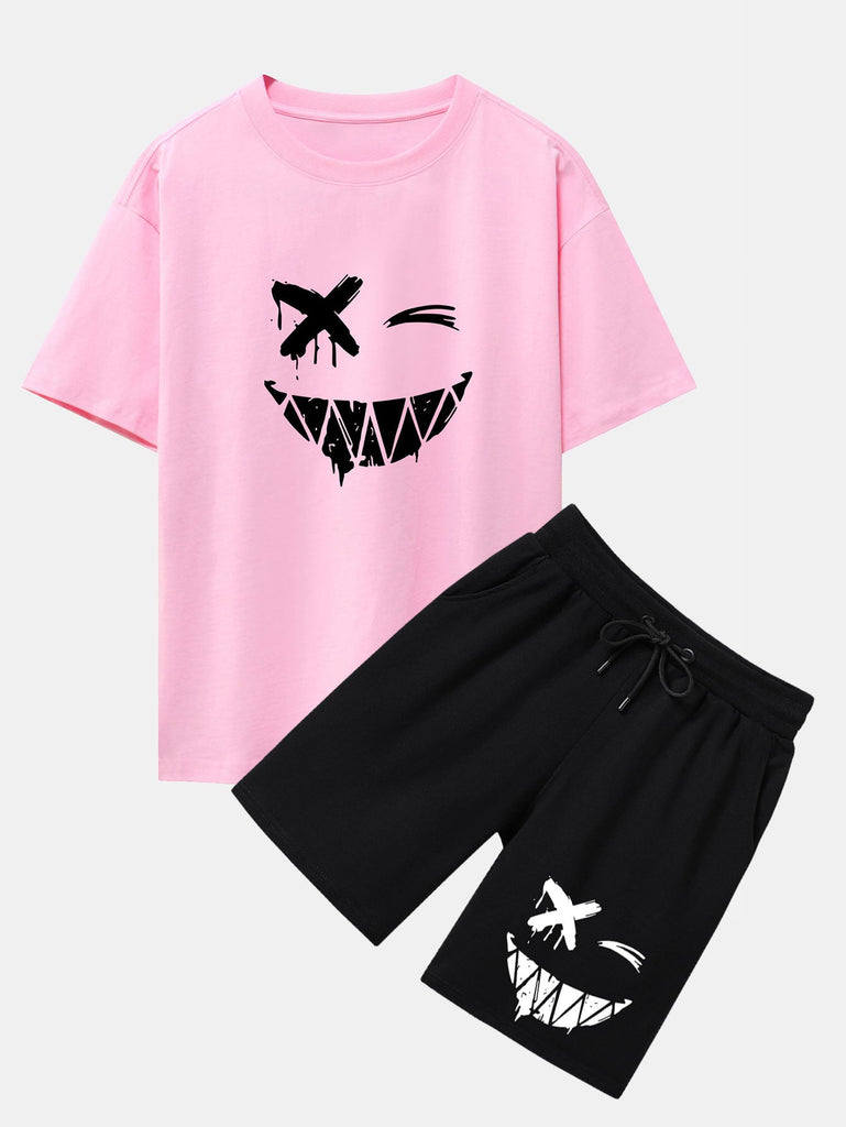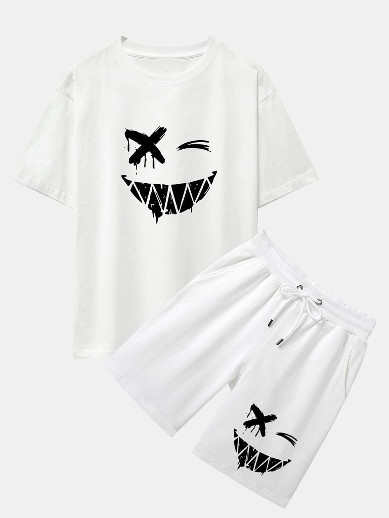 Dissolved Smiley Face Print Drop Shoulder Oversize T-Shirt & Shorts