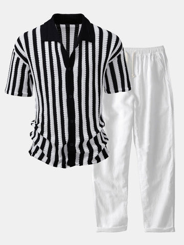 Drop Shoulder Stripe Crochet Shirt & Straight Leg Linen Pants