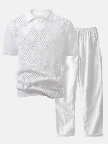 Geometric Crochet V Neck Polo Shirt & Straight Leg Linen Pants