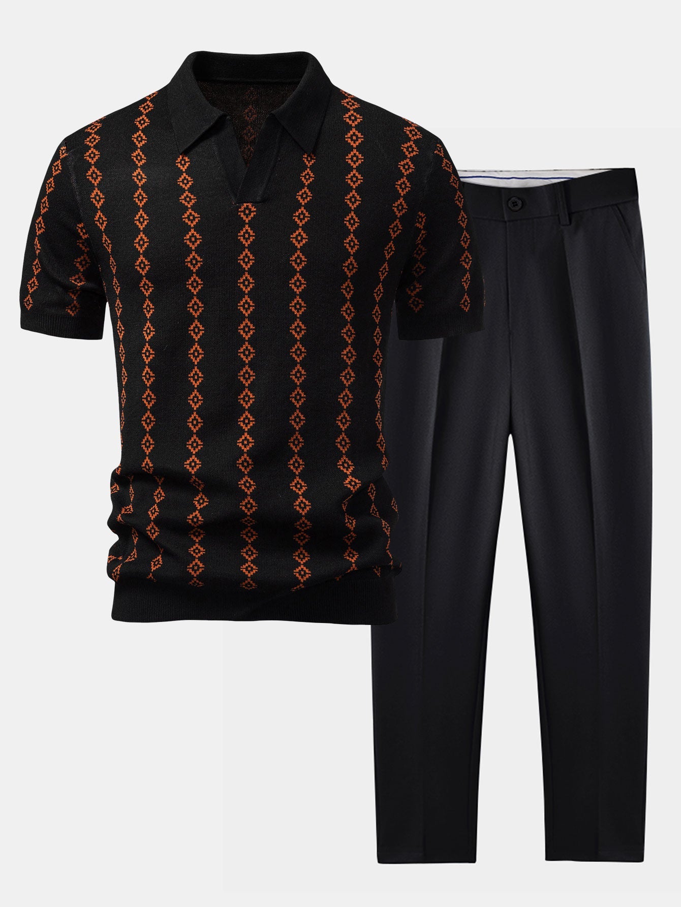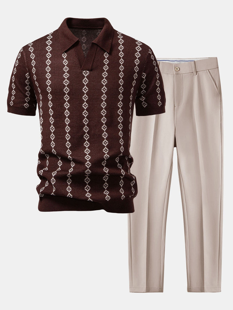 Geometric Knit V Neck Polo Shirt & Slim Fit Tapered Trousers