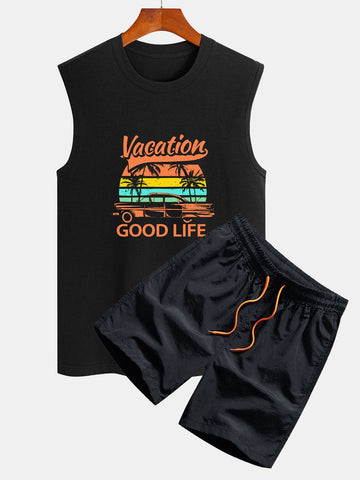 Good Life On Vacation Print Cotton Sleeveless T-Shirt & Drawstring Swim Shorts