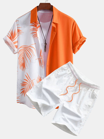 Leaf Print Patchwork Button Up Shirt & Man Mid Length Drawstring Swim Shorts