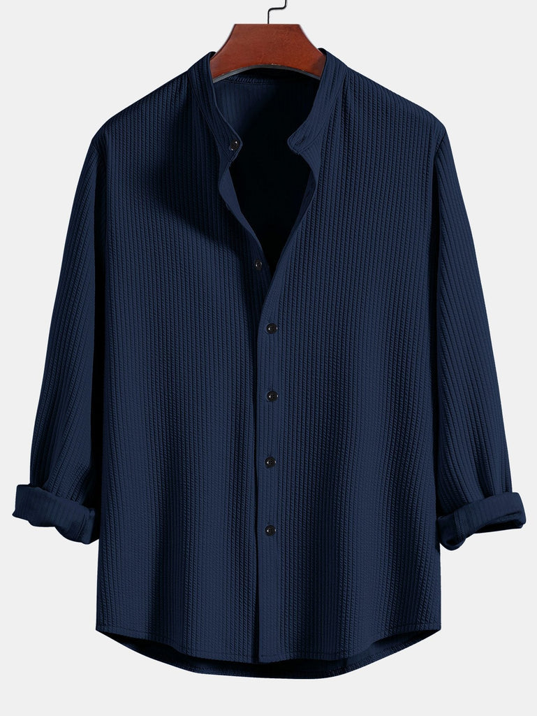 Long Sleeve Muscle Fit Ribbed Stand Collar Shirt & Straight Leg Linen Pants
