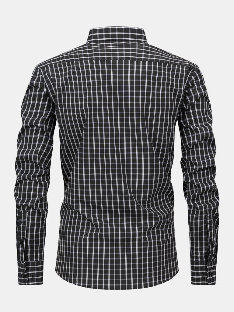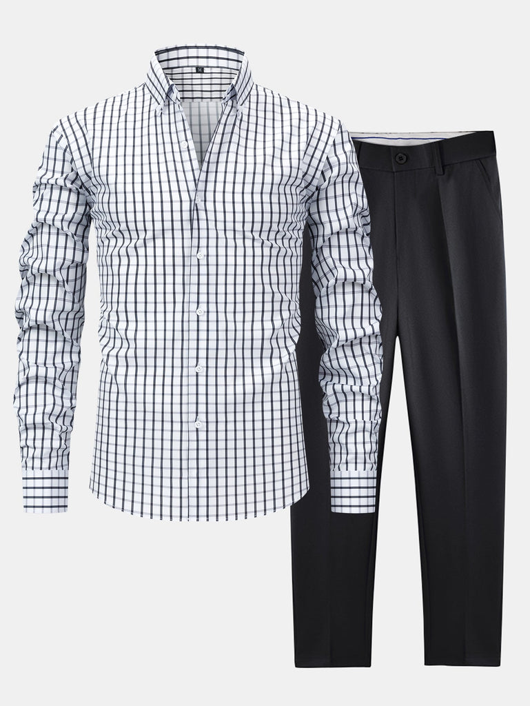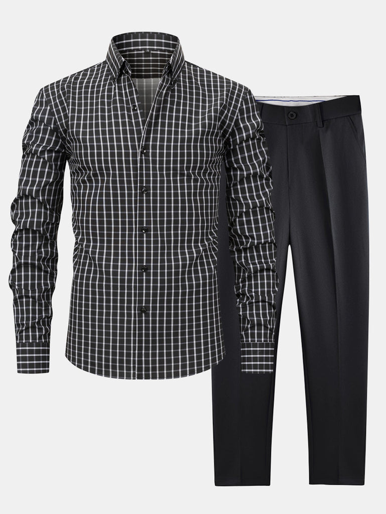 The long sleeve plaid button-up shirt features a timeless plaid pattern with a relaxed yet structured silhouette¡ªideal for layering or wearing on its own. Paired with the slim fit tapered trousers, this outfit delivers a sharp, clean finish with a comfortable stretch fit that moves with you all day.