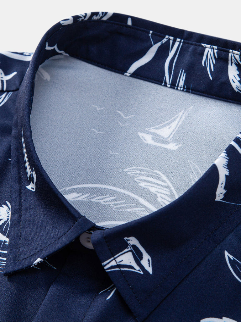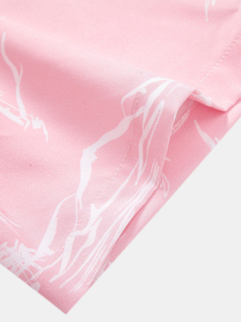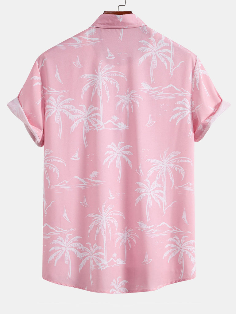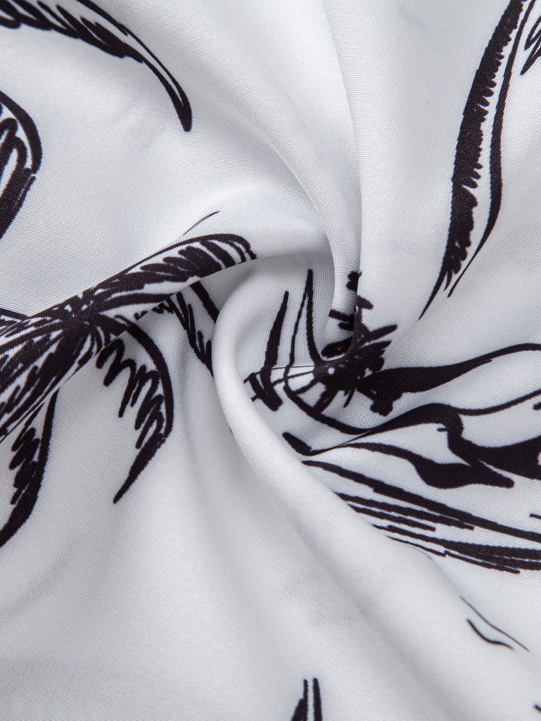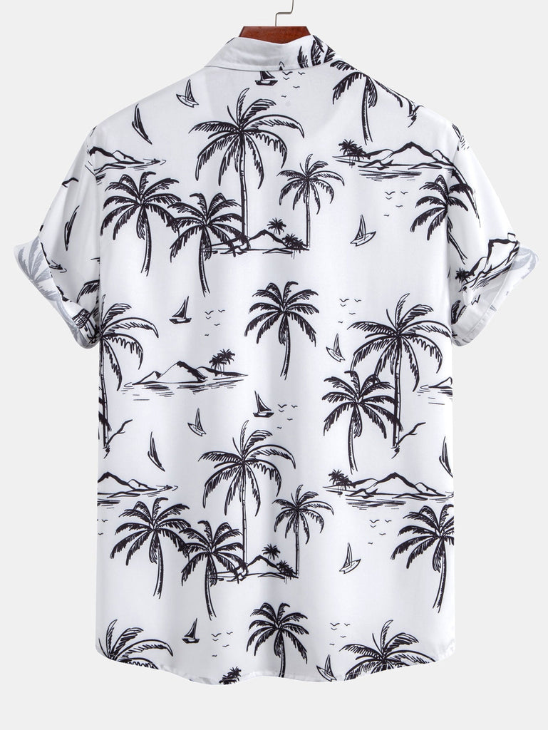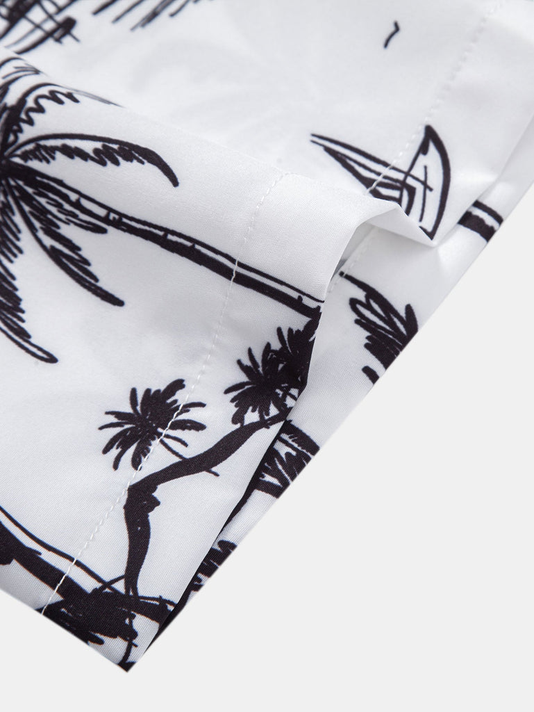 Palm Tree Island Print Button Up Shirt & Drawstring Swim Shorts