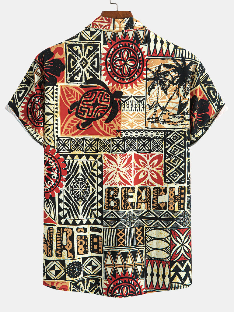 Palm Tree Turtle Ethnic Geometry Print Button Up Shirt & Swim Shorts