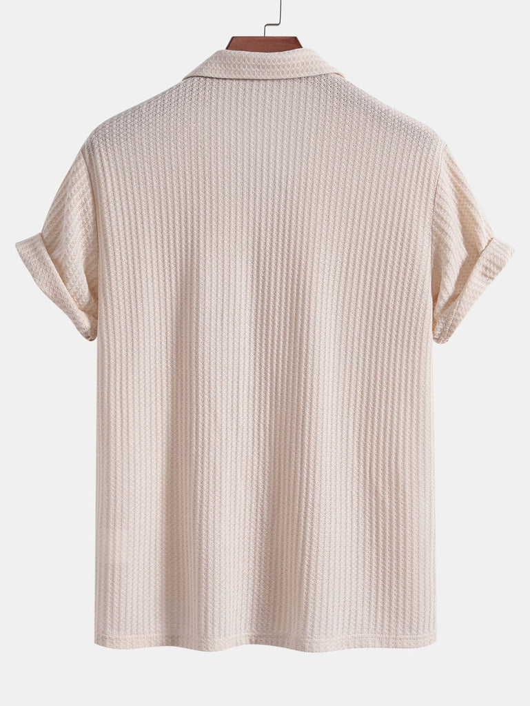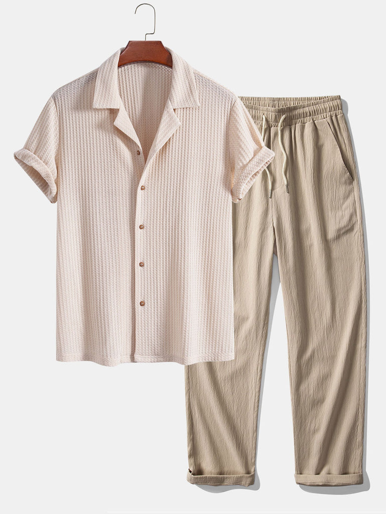 Short Sleeve Knitted Waffle Cuban Shirt & Crinkle Textured Straight Leg Pants