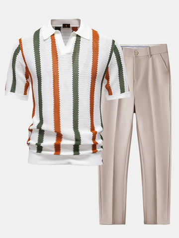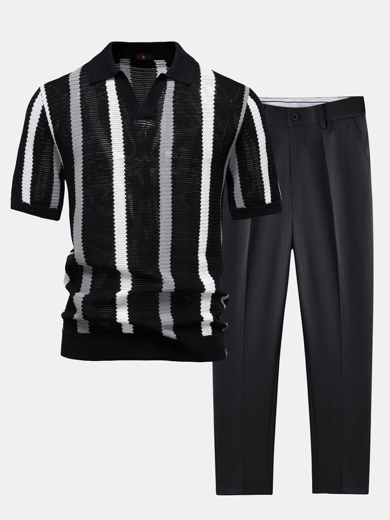 Stripe Knit V Neck Polo Shirt & Slim Fit Tapered Trousers