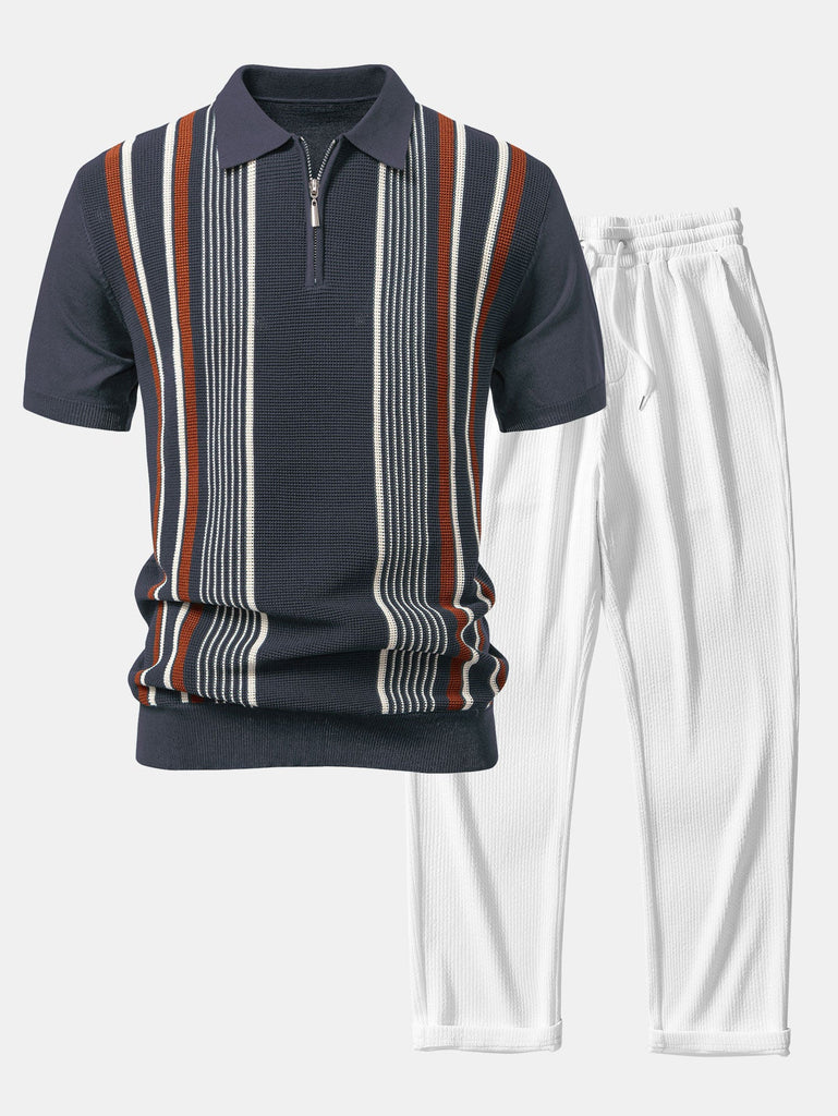 Stripe Knit Zip Up Polo Shirt & Straight Leg Ribbed Pants