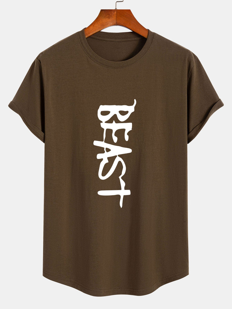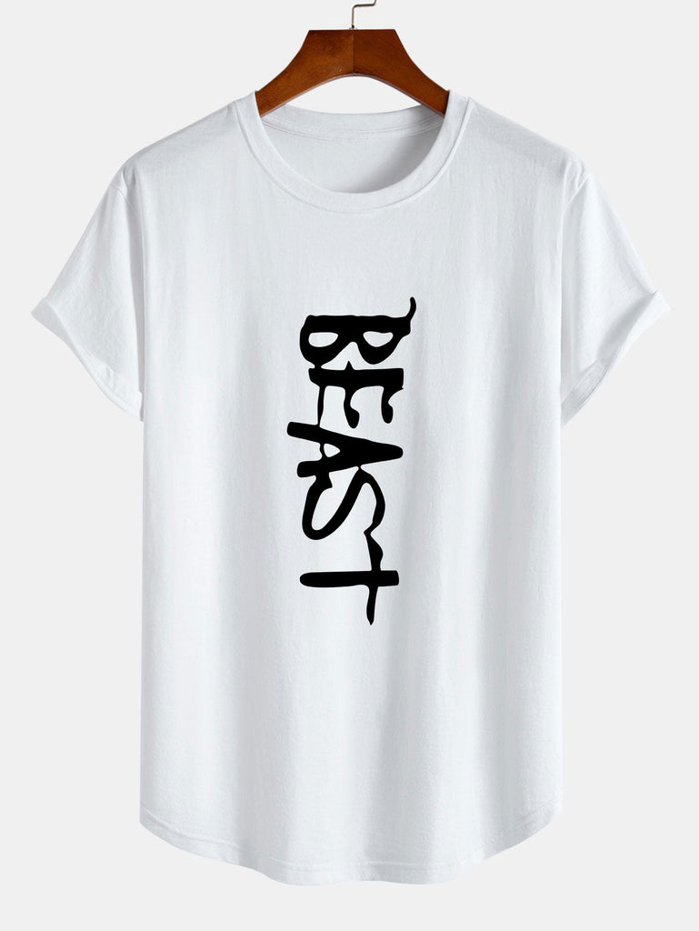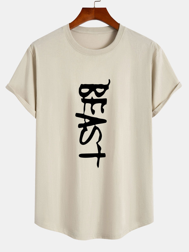 Unleash your inner wild side with this bold and edgy "Beast" print arc hem T-shirt. Crafted from soft, breathable 100% cotton, this tee features a powerful front graphic and a stylish arc-shaped hem that adds a modern twist to a classic silhouette.