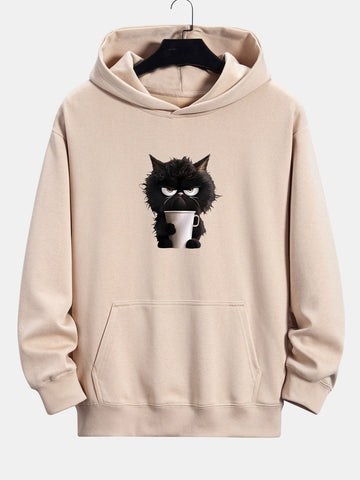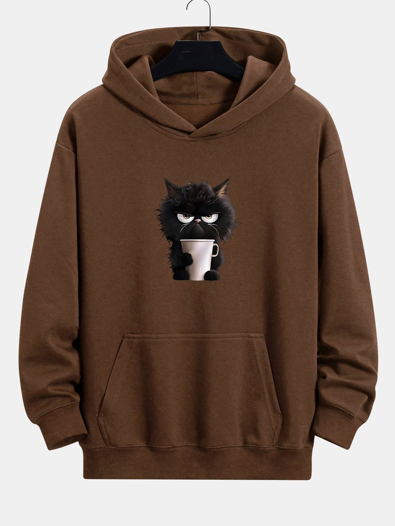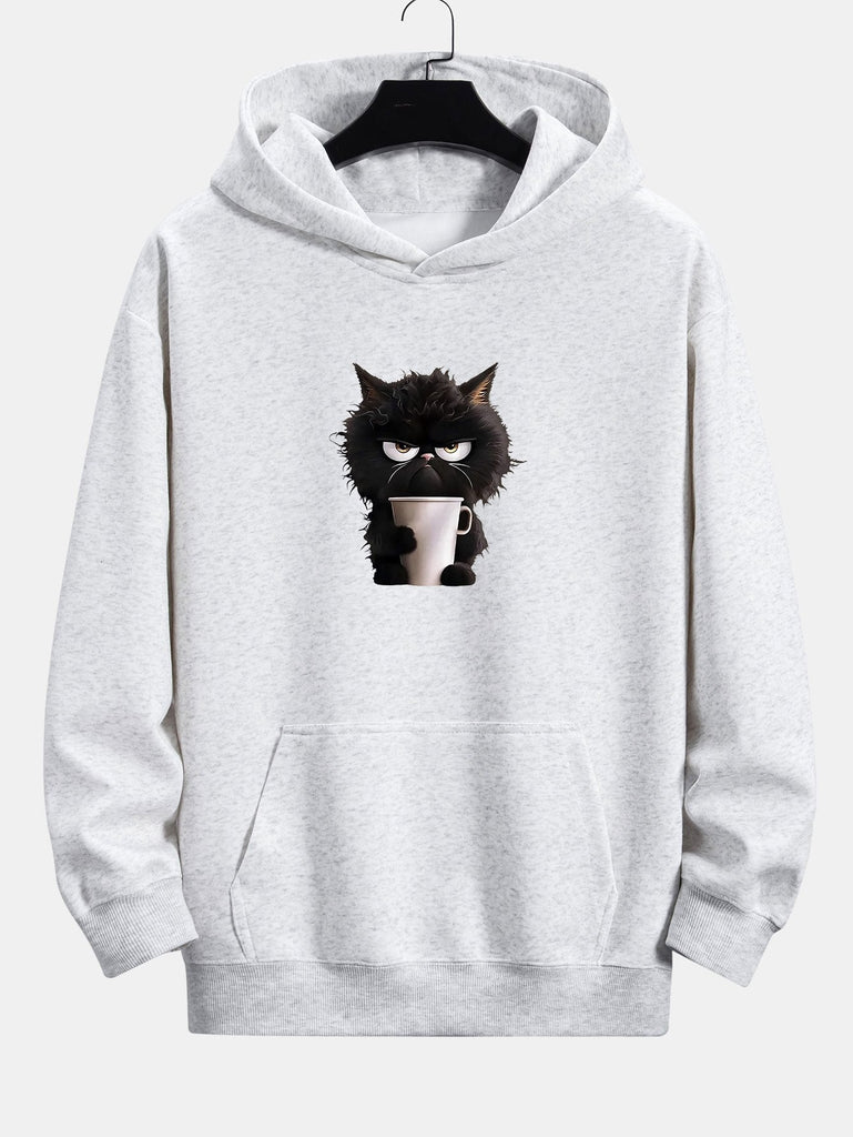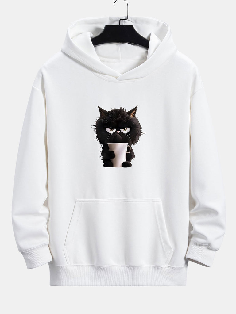 Black Cat Drinking Coffee Print Relax Fit Hoodie