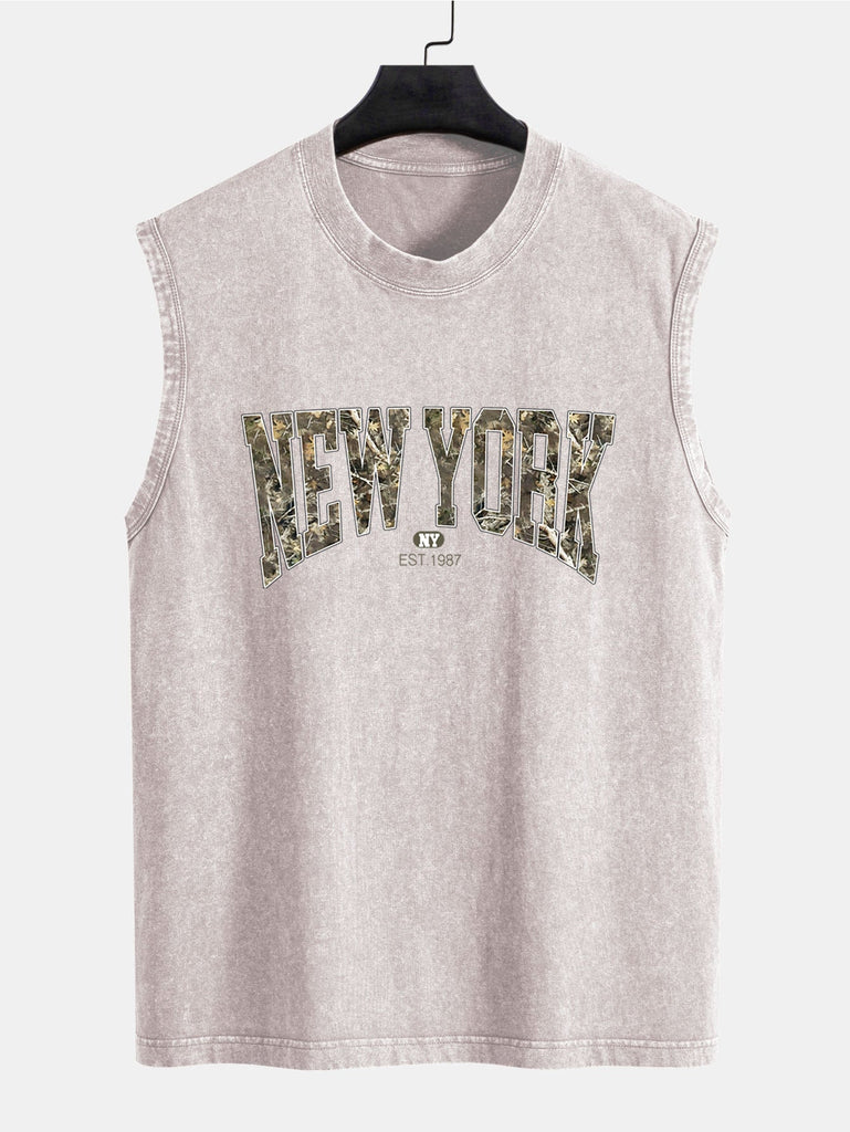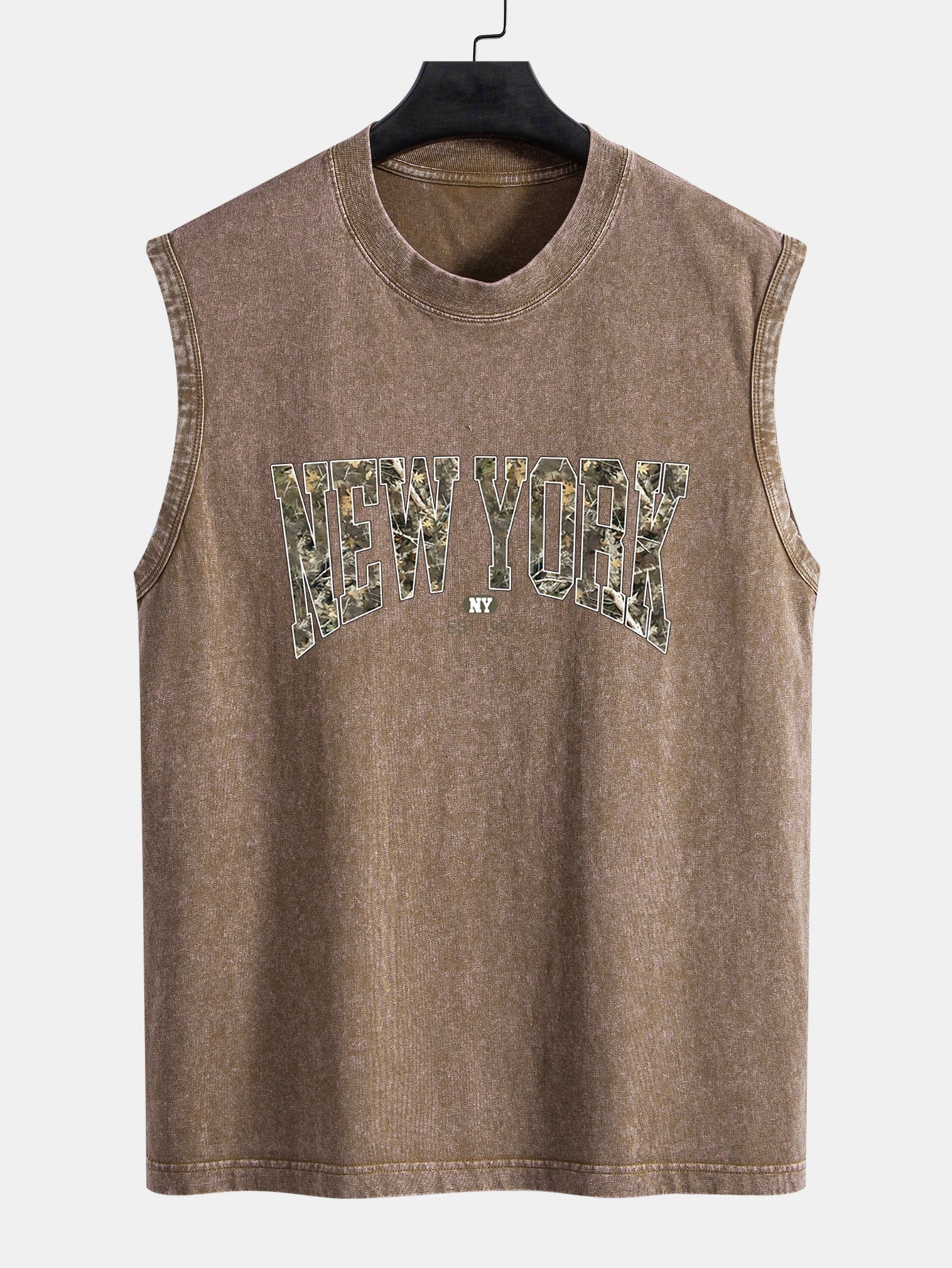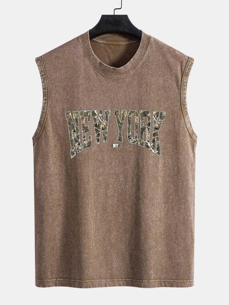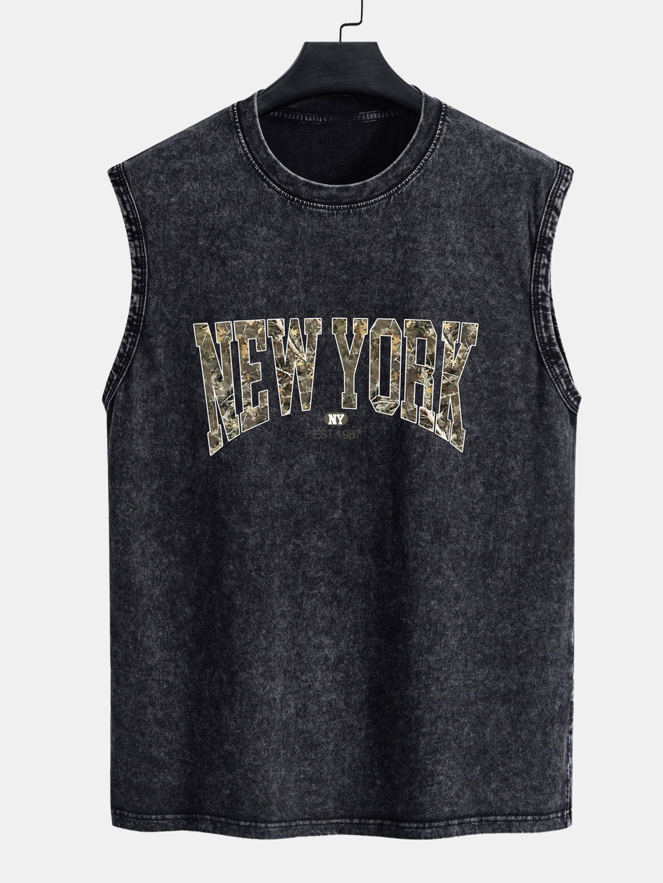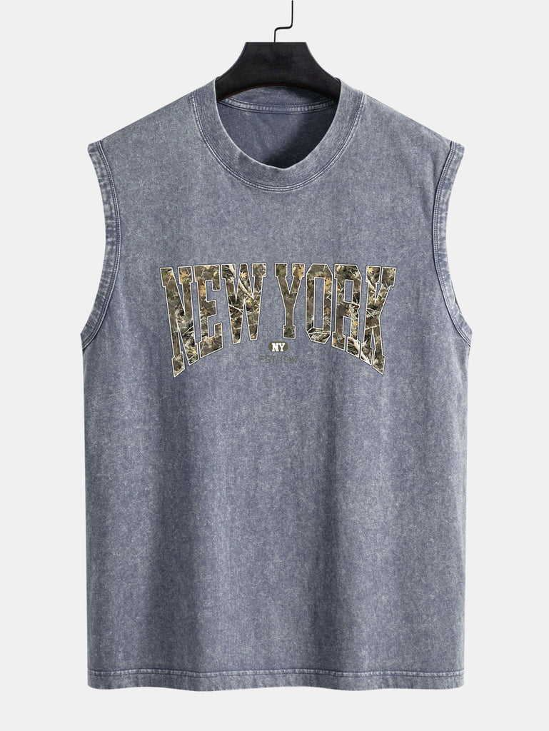 Elevate your wardrobe with our camouflage New York print washed distressed tank top ¡ª a statement piece that blends street-style edge with a rugged, worn-in vibe. Designed for those who love urban fashion with a twist, this tank top is your go-to choice for making a bold impression.