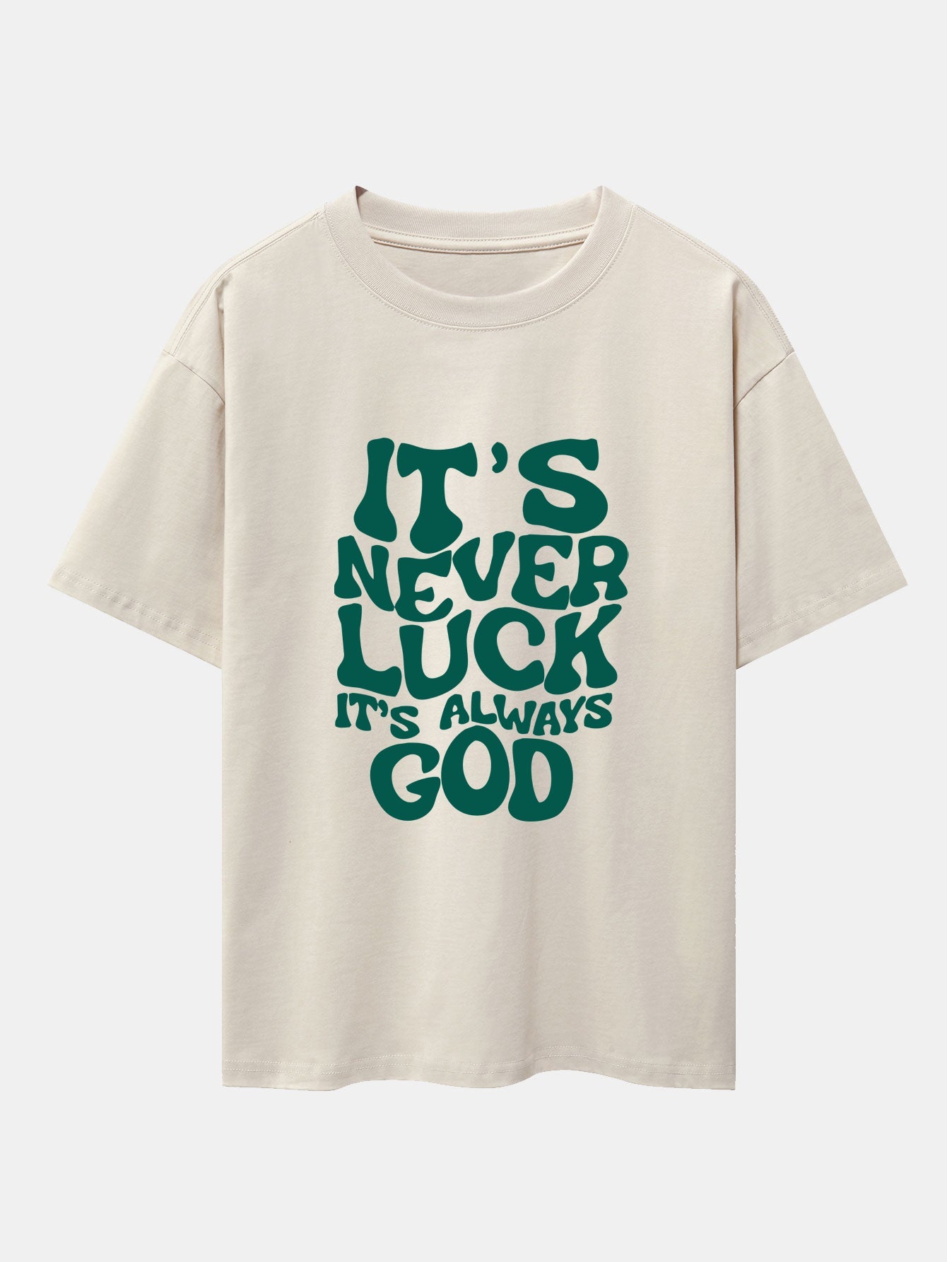 Make a bold statement of faith with this "It's Never Luck, It's Always God" graphic T-shirt. Designed for believers who recognize divine intervention in their lives, this t-shirt blends comfort, style, and inspiration.