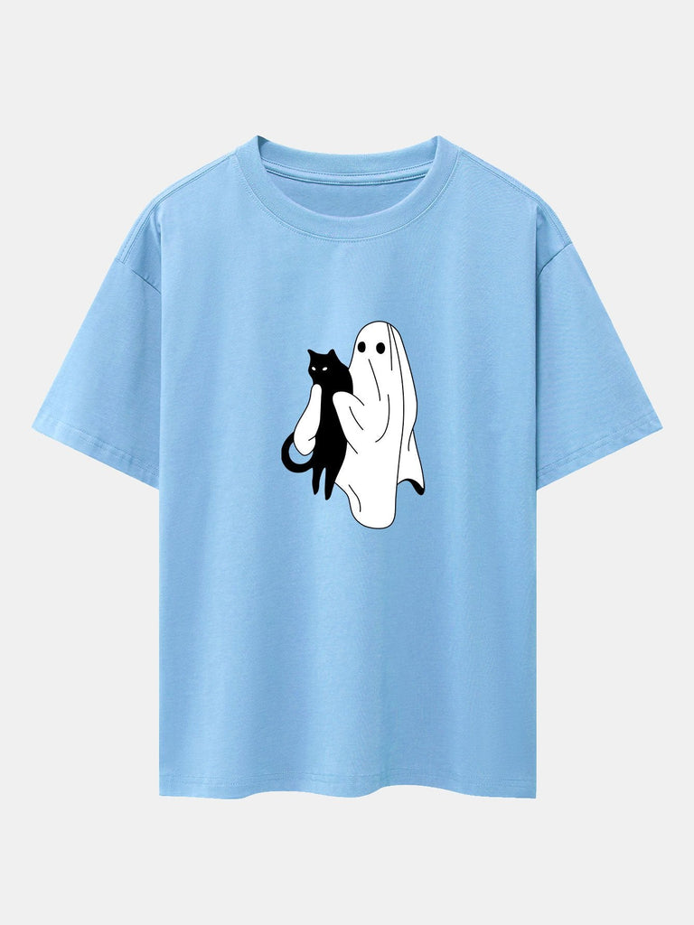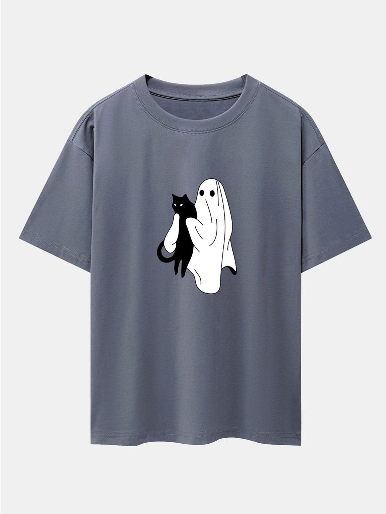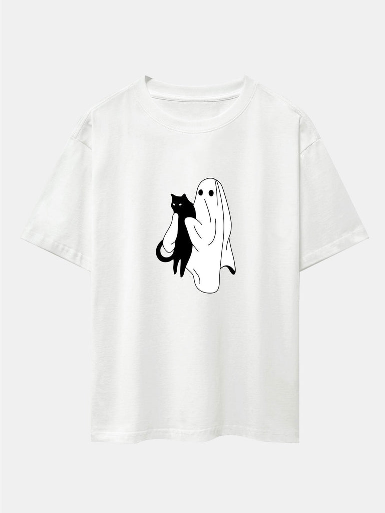 Ghost Black Cat Print Drop Shoulder Oversize T-Shirt