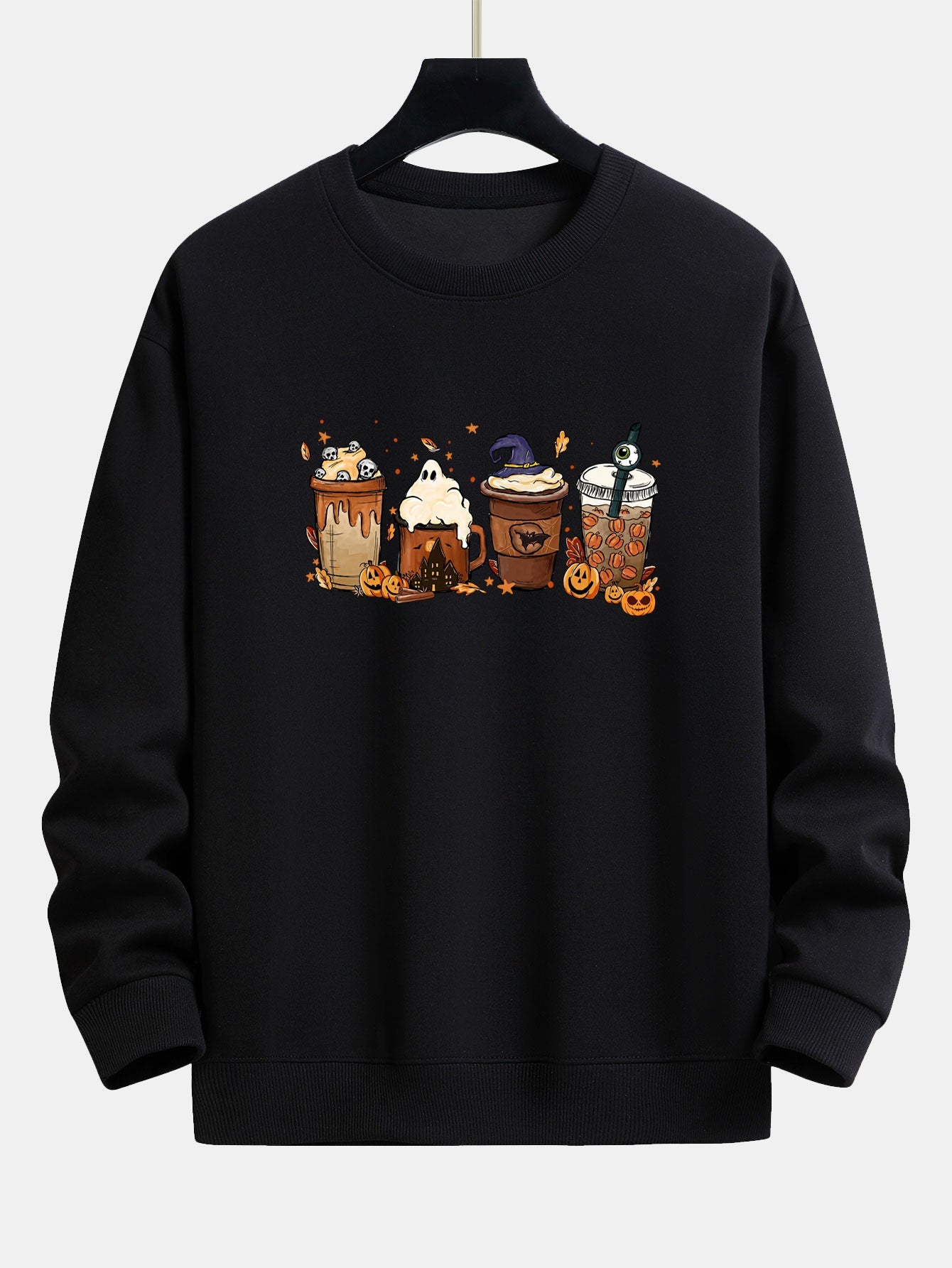Sip in spooky style with our Halloween themed drinks print relax fit sweatshirt. Featuring playful illustrations of festive beverages¡ªfrom pumpkin spice lattes to ghostly brews¡ªthis sweatshirt adds a fun and cozy seasonal touch to your fall wardrobe.
