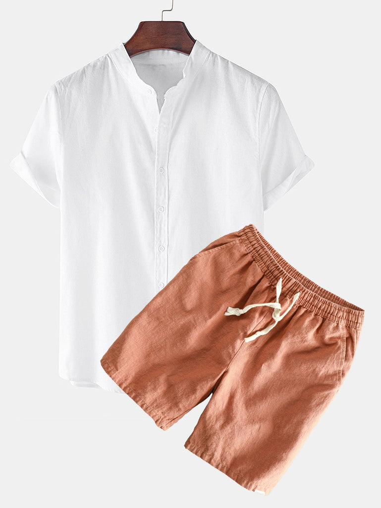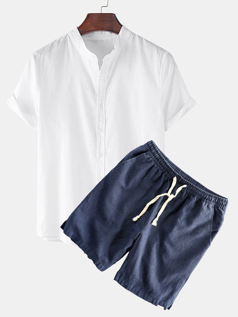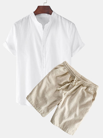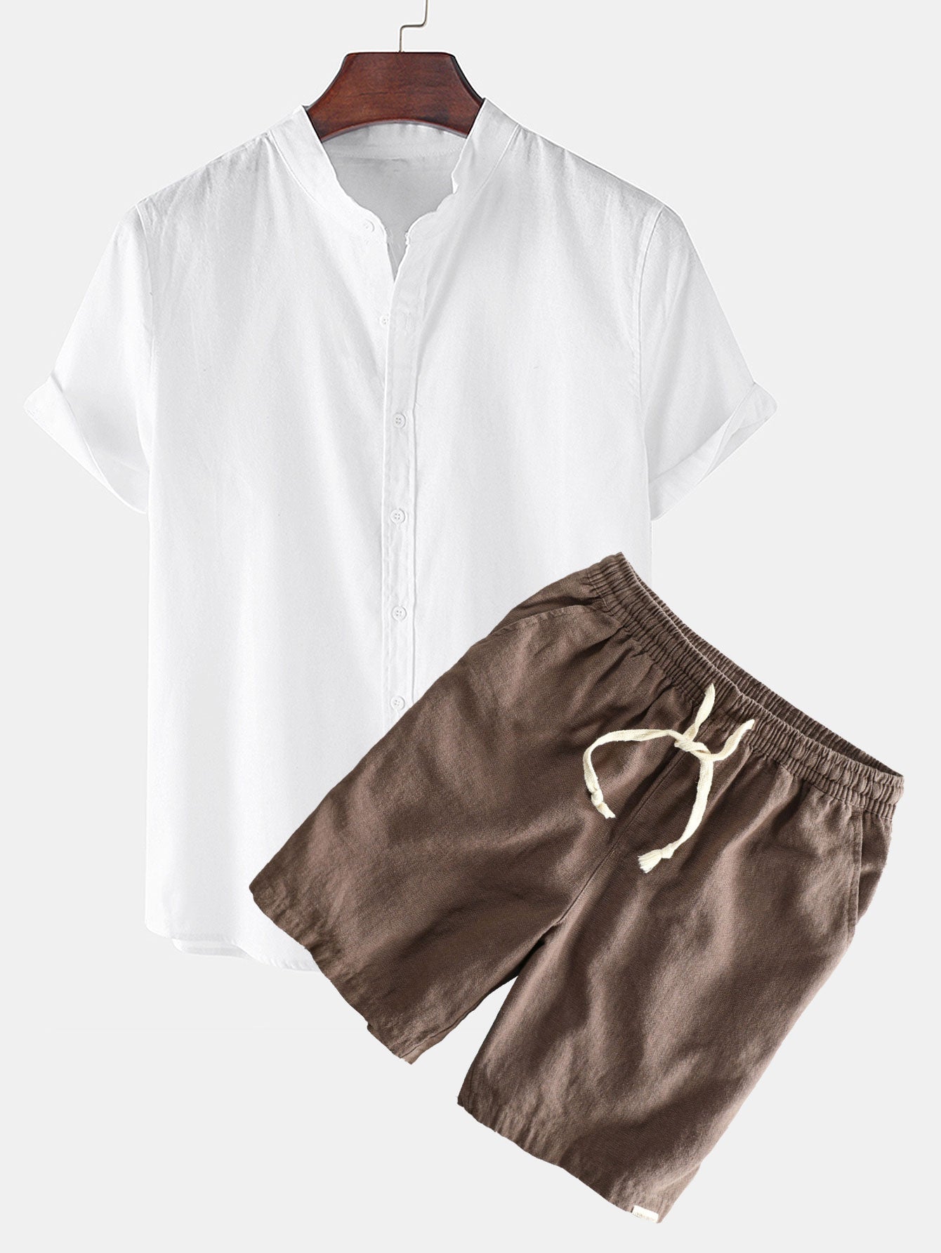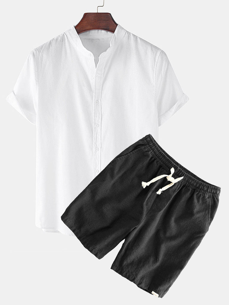 Linen Look Short Sleeve Stand Collar Shirt & Linen Cotton Blend Drawstring Shorts