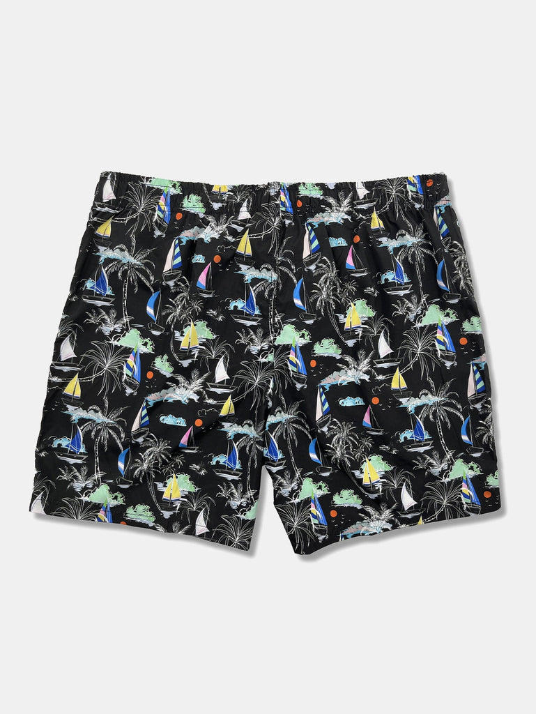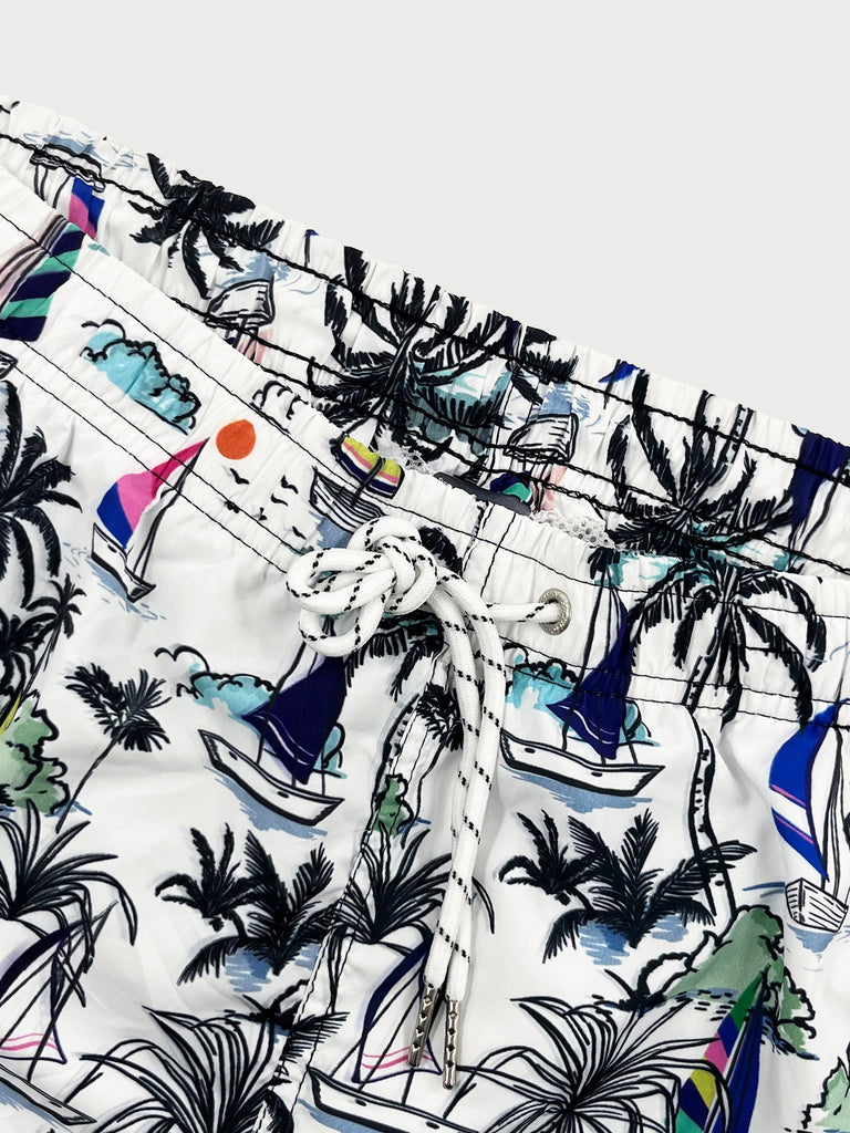 Linen Rayon Blend Button Up Shirt & Palm Tree Sailboat Print Swim Shorts